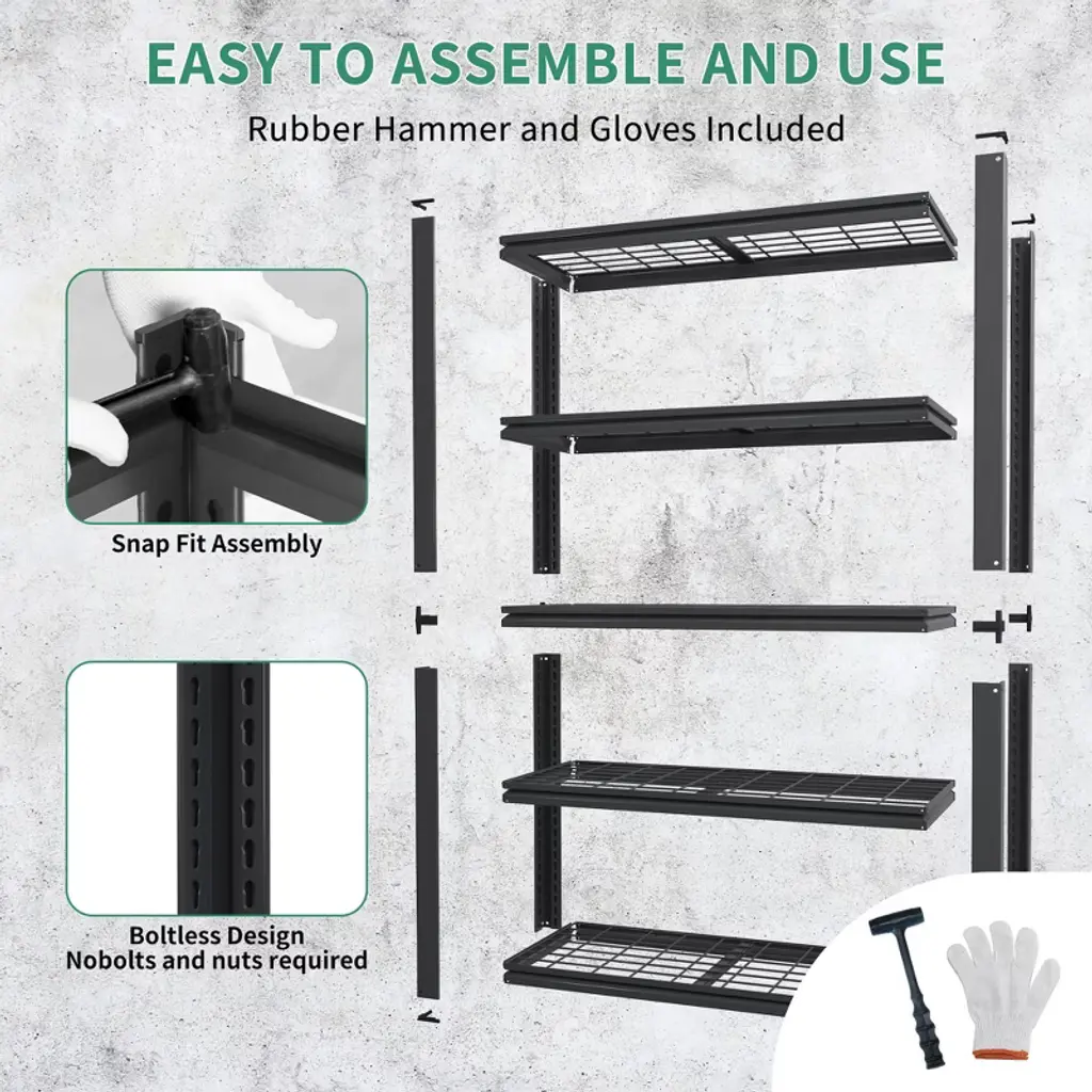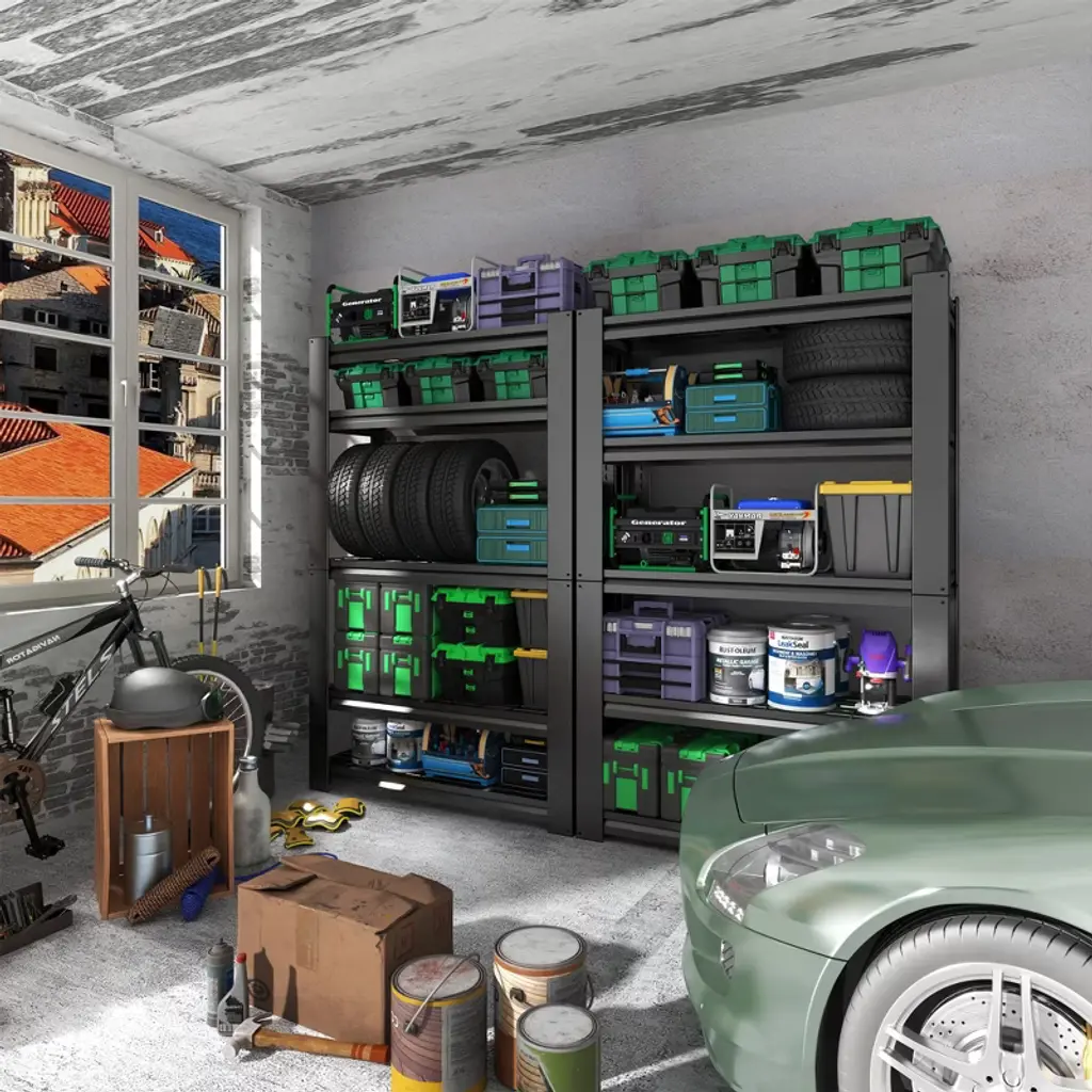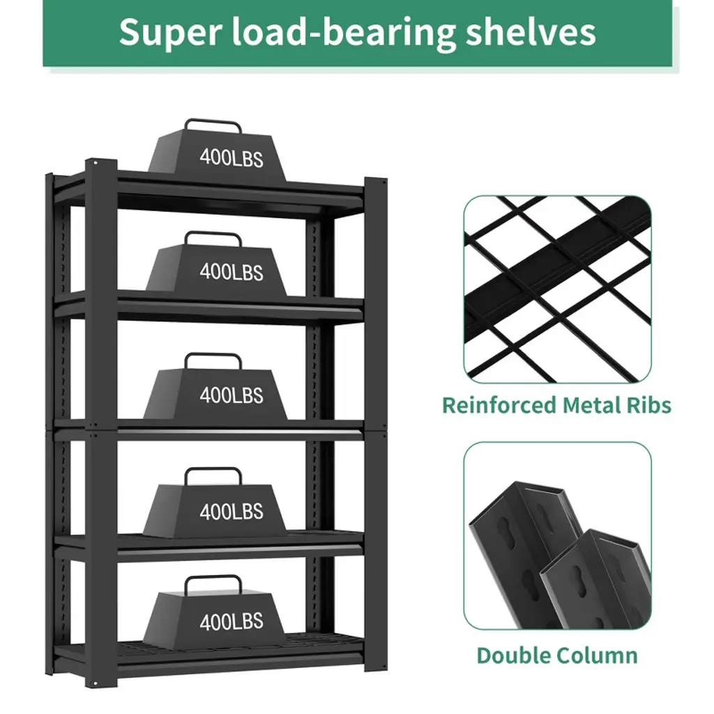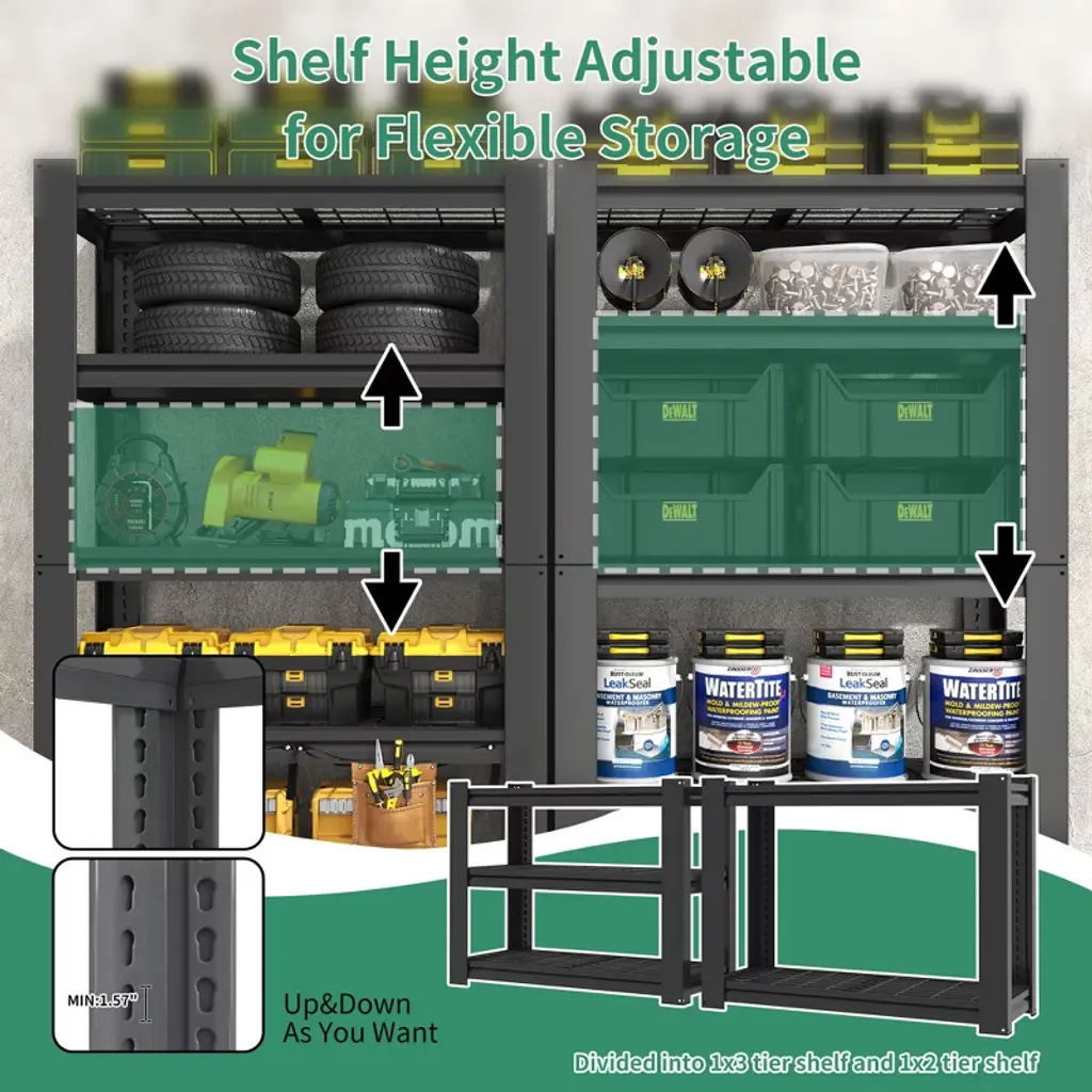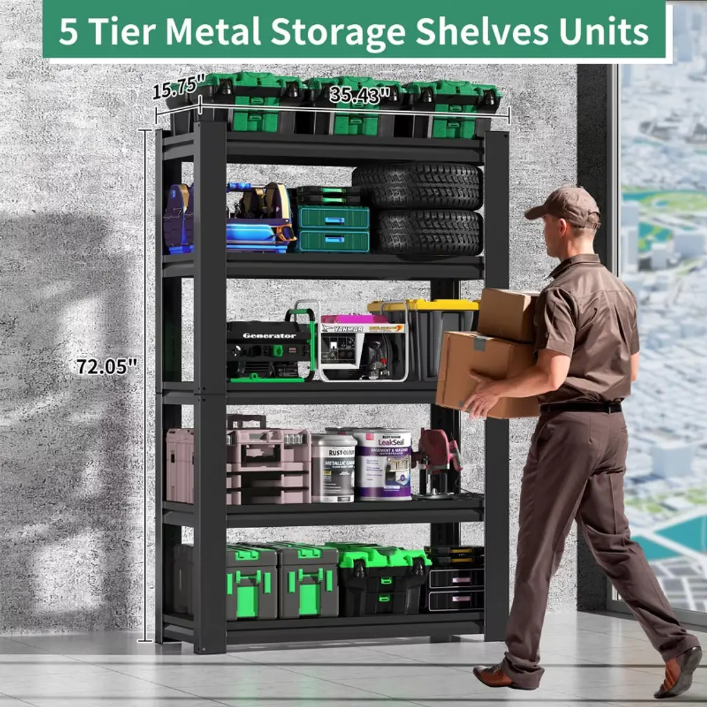 This 5-tier garage shelving unit delivers industrial-strength storage in a space-efficient design. The black steel unit (16"D x 35"W x 72"H) supports 2,500 lbs total, with each shelf holding 500 lbs thanks to thickened legs and under-shelf reinforcing bars. An adjustable interlocking beam system allows 1" height increments, adapting to store tools, boxes, or large equipment. The powder-coated cold-rolled steel resists rust and corrosion, making it ideal for garages, basements, workshops, or kitchens. Freestanding and versatile, the shelving assembles in 20 minutes with the included hammer and gloves—no nuts or bolts required. Shipped with a 1-year warranty, this unit combines durability and flexibility for all storage needs.