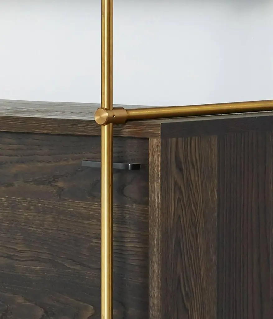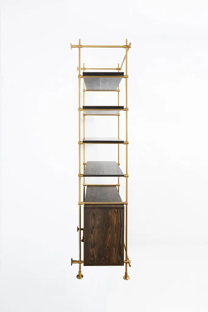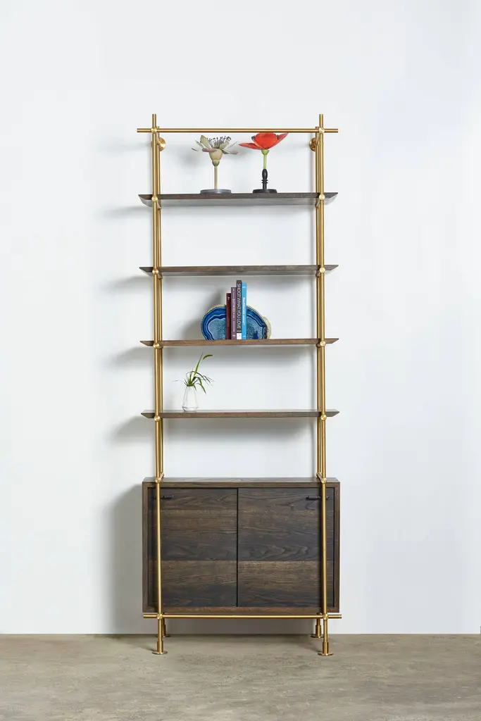 Oak and Brass Bookcase Shelving with Credenza is the single bay version of Amuneal’s collector’s shelving unit featuring solid machined brass fittings and posts in a warm brass finish. The unit mounts to the floor and to the wall to support a series of easily adjustable shelves and credenza cabinet with wood doors. The wood shelves and credenza are fabricated from solid white oak that is milled in-house before receiving a hand-applied oxidized finish that highlights the natural character and beauty of this locally sourced wood. All of our collector’s shelving units are fabricated in Amuneal’s Philadelphia-based furniture studio and can be customized as required for residential and commercial spaces.