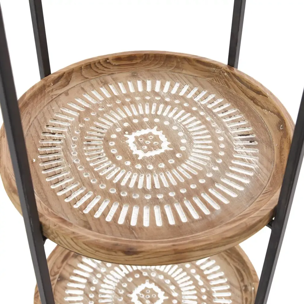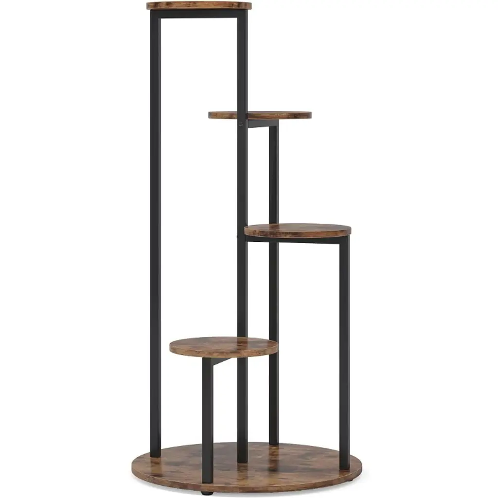 Keep a clutter free home with this durable and expertly crafted shelving unit. Display your favorite books, photos, and memorabilia with style with this shelving unit. Organize your living room or bedroom with this round corner shelf for that chic traditional vibe. This item ships in 1 carton. Suitable for indoor use only. This item ships fully assembled in one piece. Maximum weight limit is 30 lbs. This is a single brown colored display shelf. Wood shelving unit features 4 shelves. Traditional style.