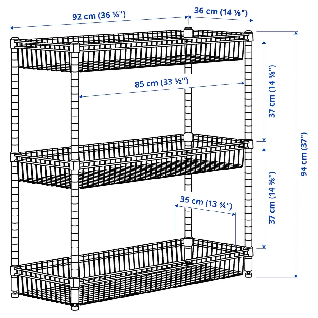 OMAR Shelving unit with 3 baskets - galvanized 36 1/4x14x37 ". In the 3 metal baskets your vegetables, canned food, shampoo bottles or scarves lie safe and secure without falling to the floor. Adjustable shelves make it simple for you to adjust the space to suit your needs. Only for indoor use.