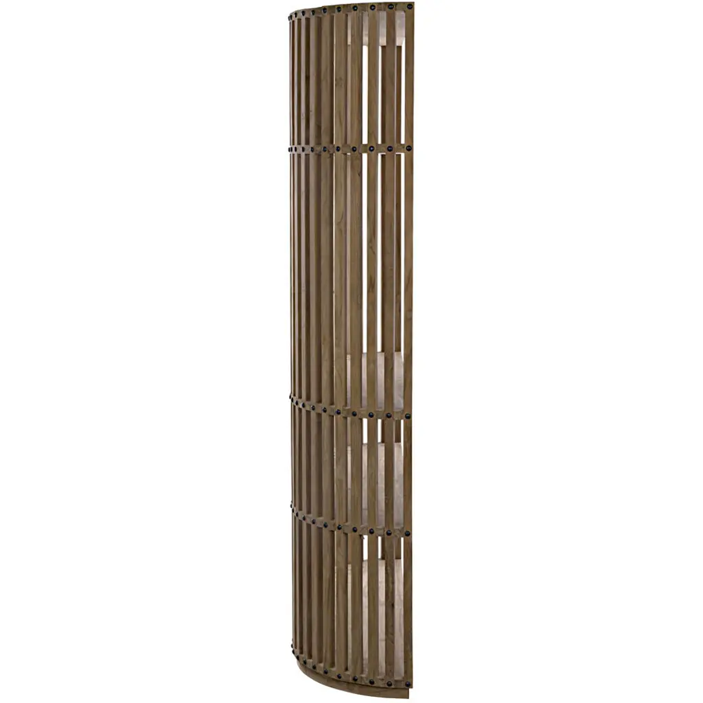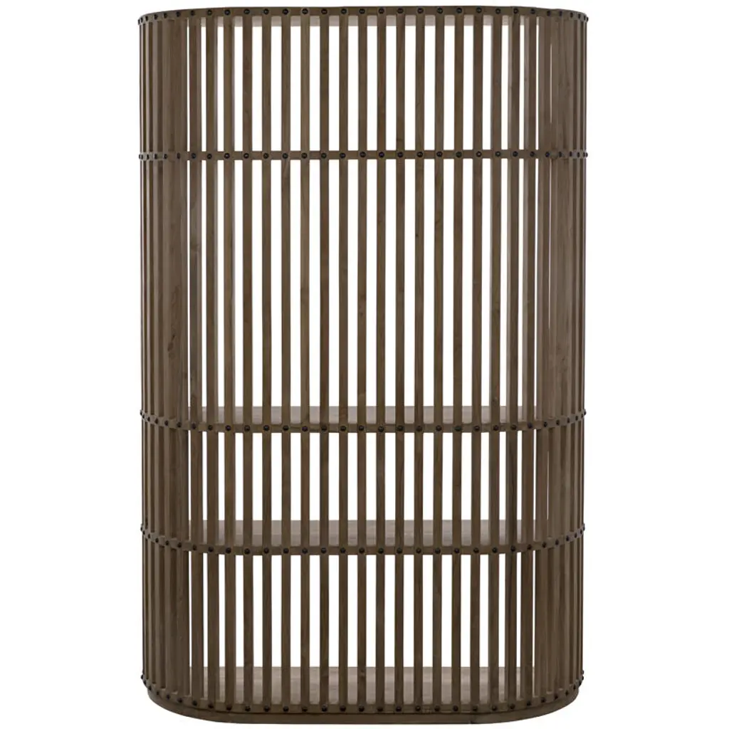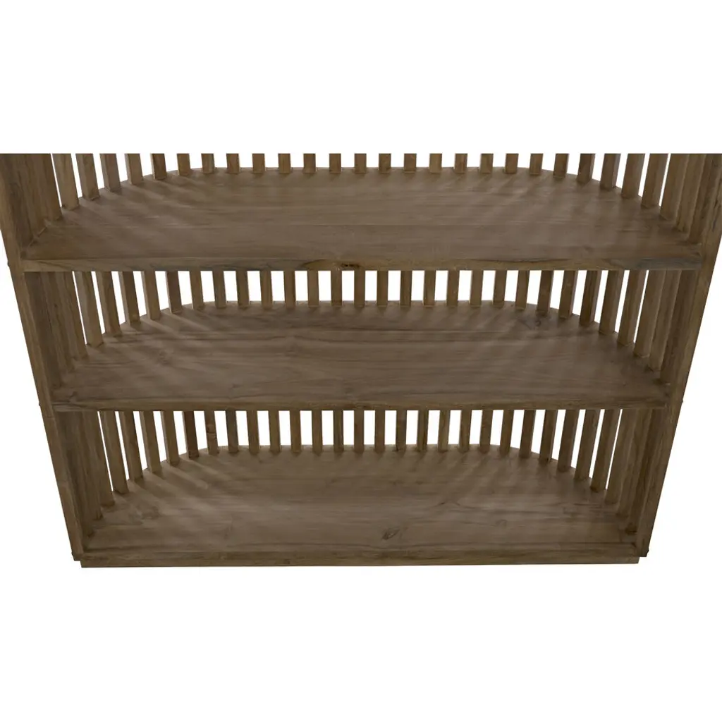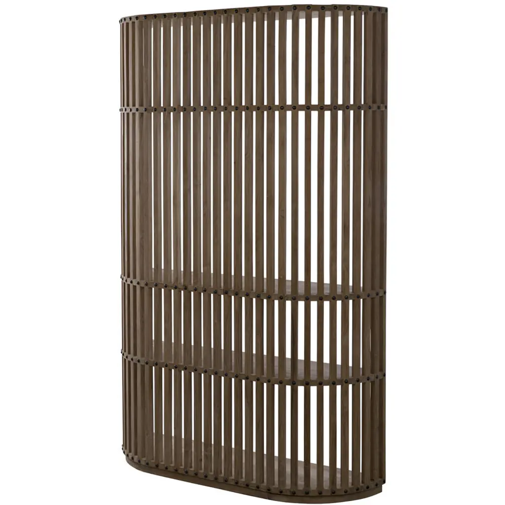 A gently curved shape is complemented by perfectly straight lines in this hand-carved shelving unit. Fully finished, from the back you'll appreciate nailhead inspired accents, and from the front dramatic vertical lines demand attention. Handcrafted of teak.