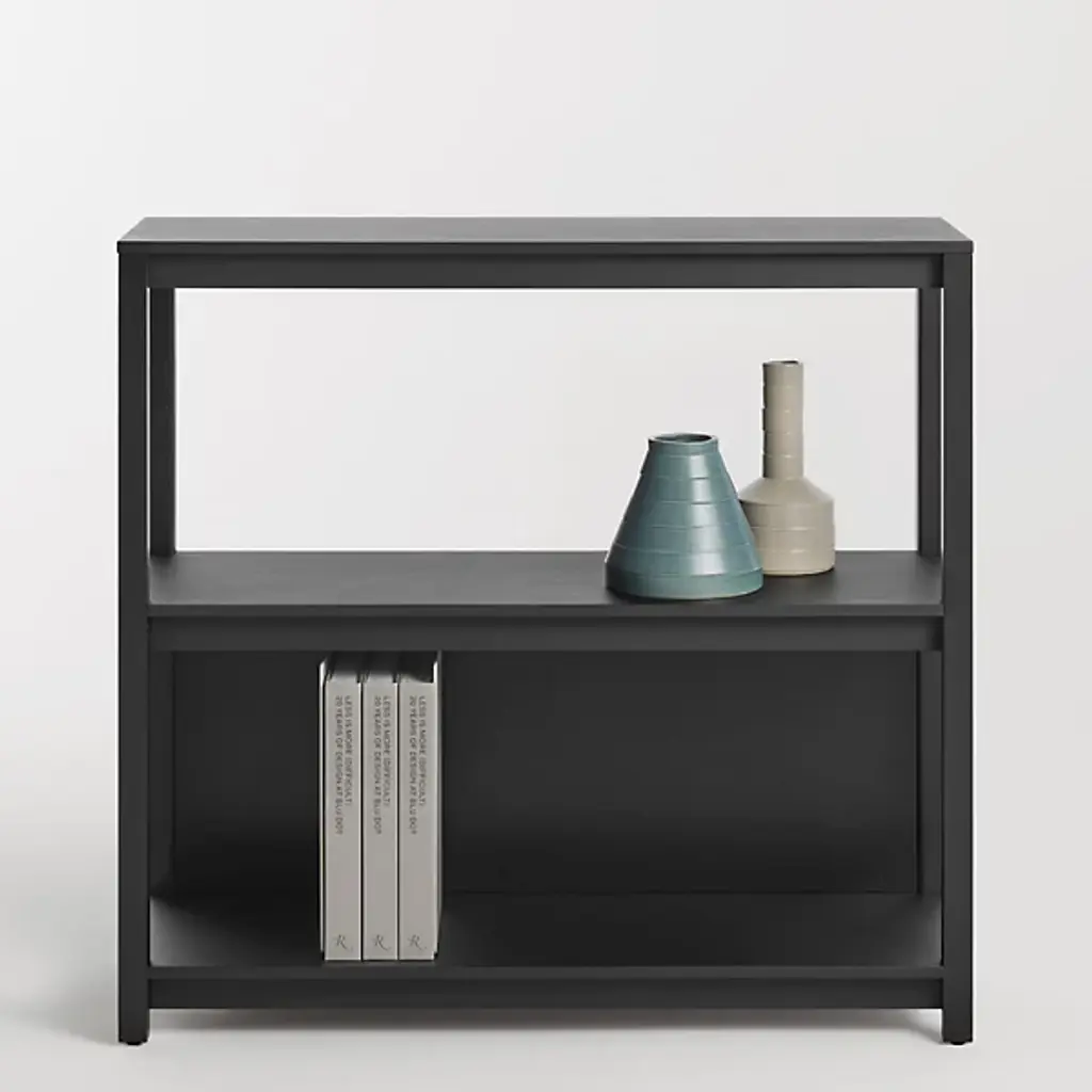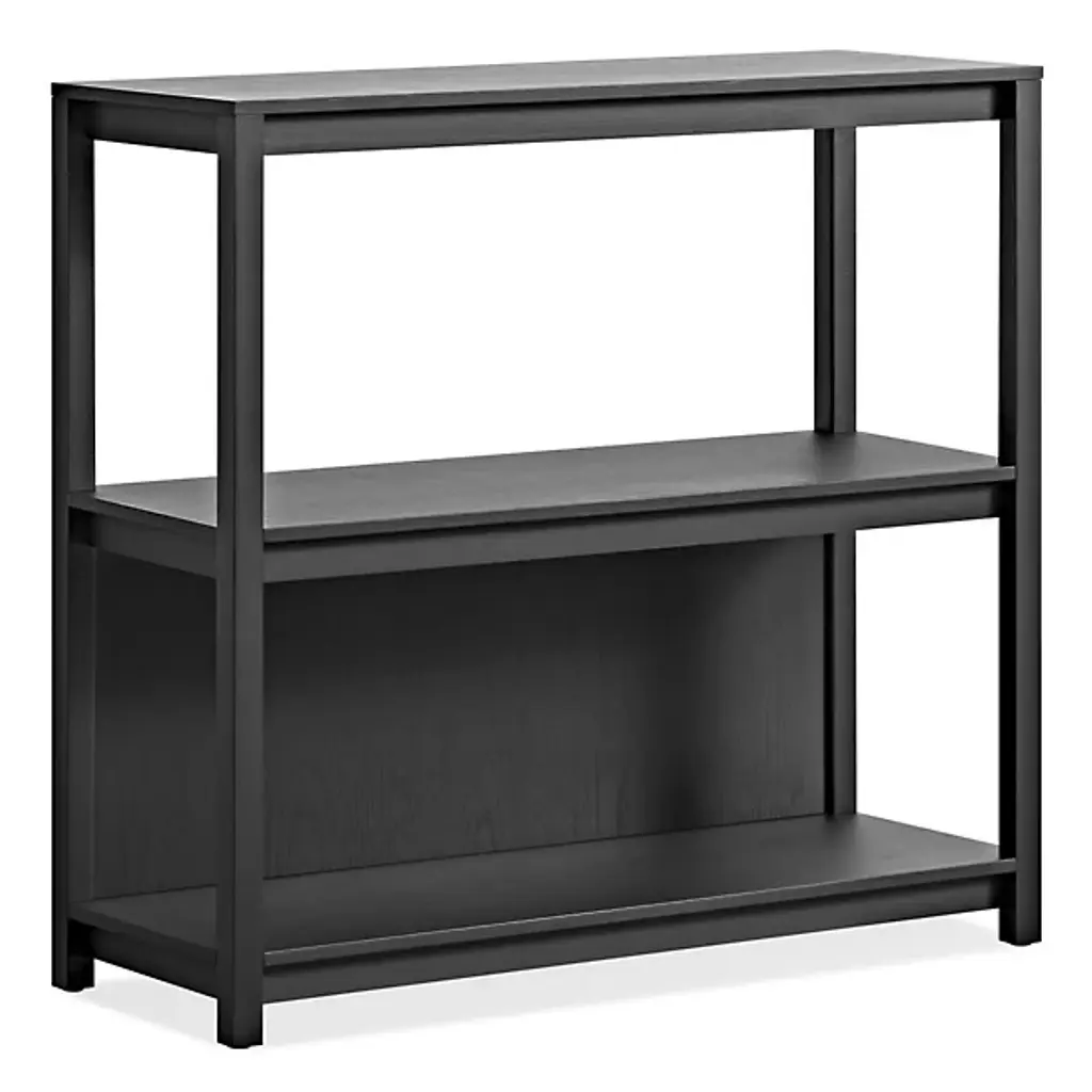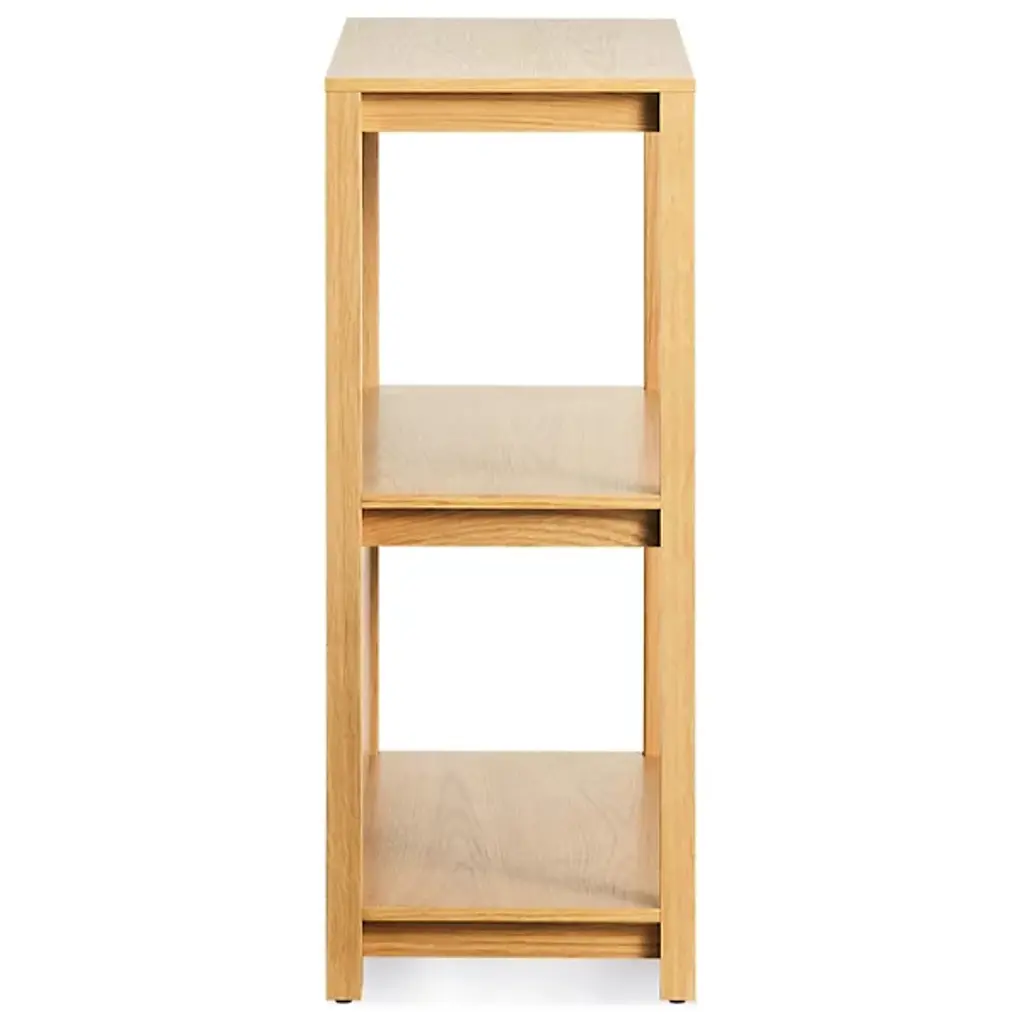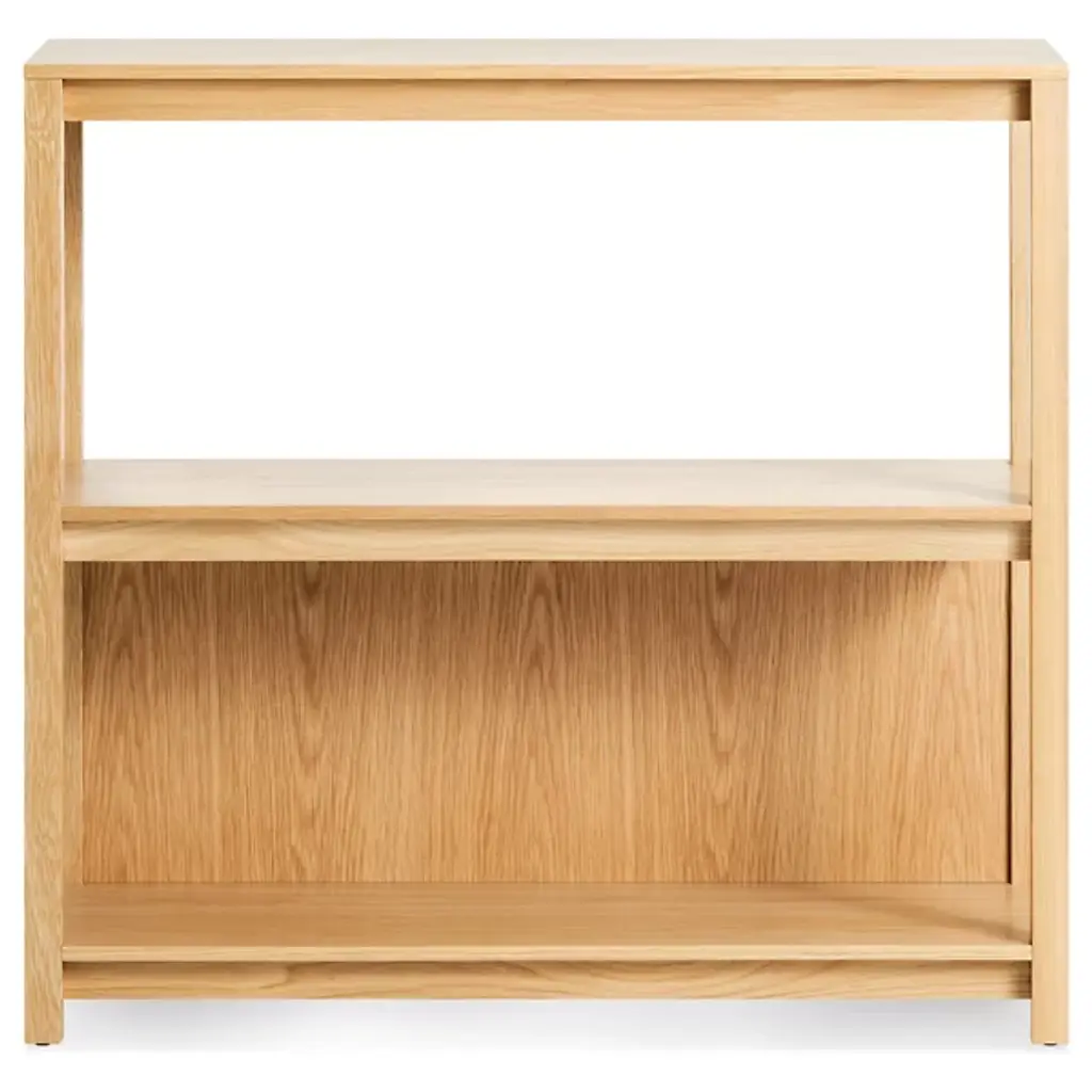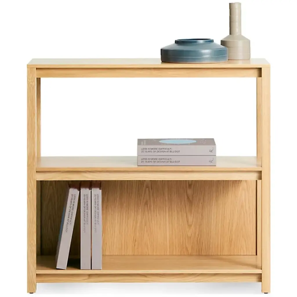 Display your curated collection with the Open Plan Small Low Bookcase by Blu Dot. This modern shelving unit features an open frame made of durable wood. Three fixed-position shelves provide ample display space for books, vinyl records, decor, and more. Adjustable feet glides allow you to level safely on flooring, while anti-tip hardware offers stability. With its clean-lined wood frame and airy open silhouette, this bookcase complements your living rooms and home offices.