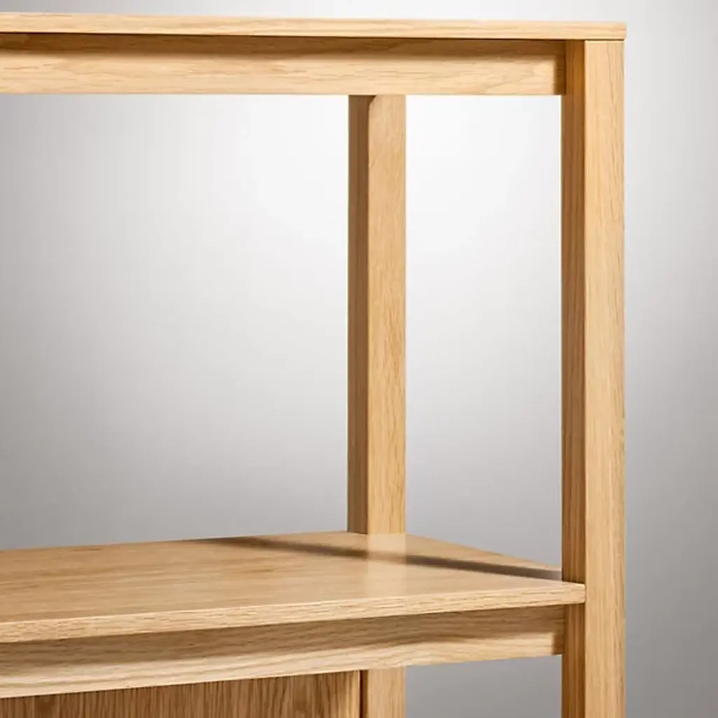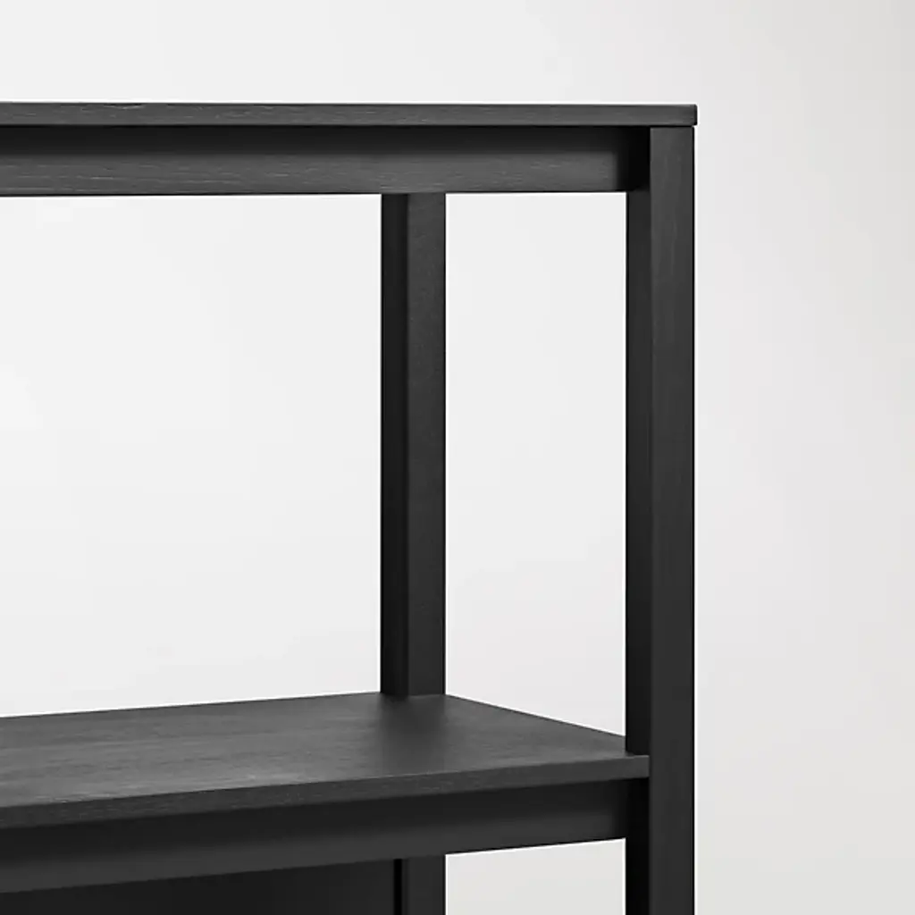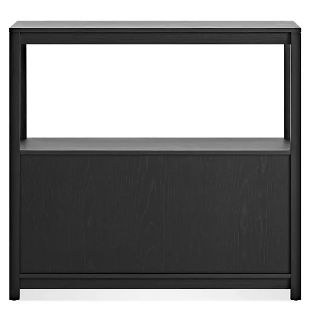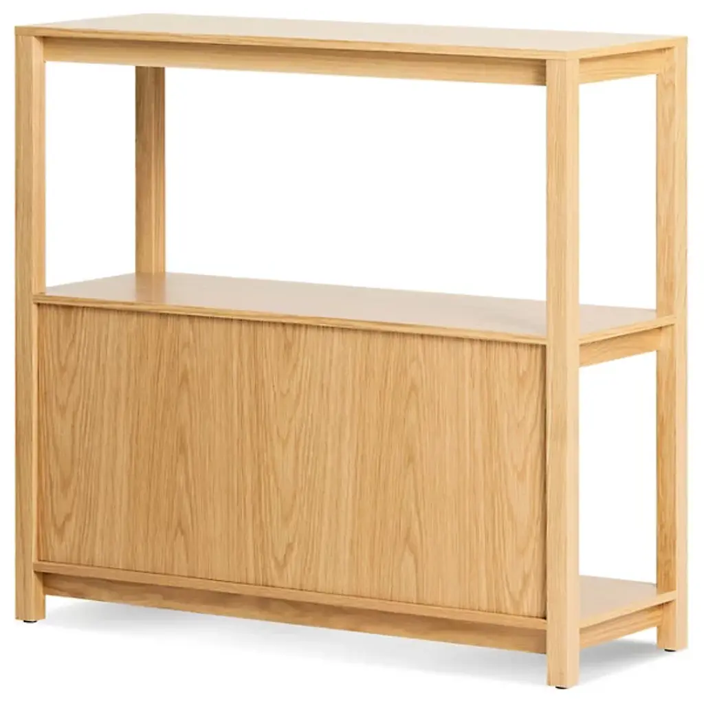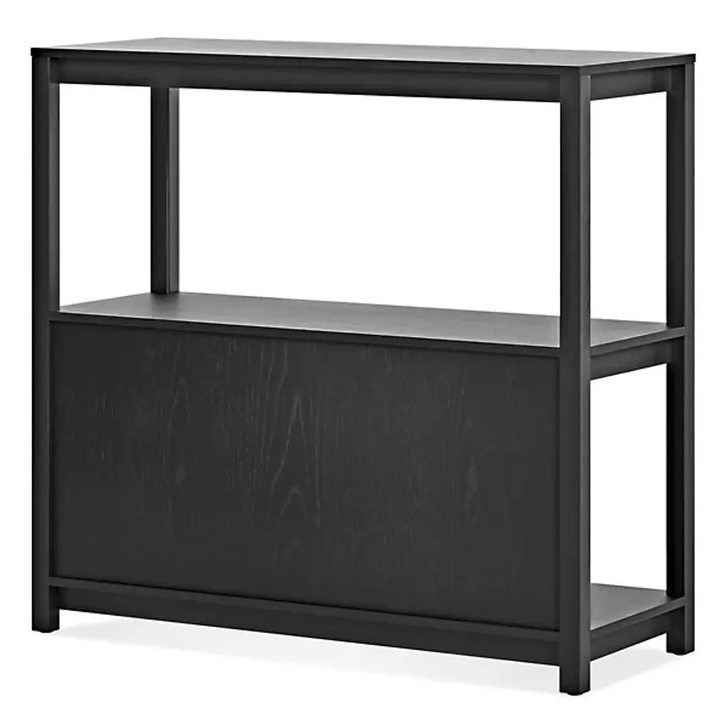 Display your curated collection with the Open Plan Small Low Bookcase by Blu Dot. This modern shelving unit features an open frame made of durable wood. Three fixed-position shelves provide ample display space for books, vinyl records, decor, and more. Adjustable feet glides allow you to level safely on flooring, while anti-tip hardware offers stability. With its clean-lined wood frame and airy open silhouette, this bookcase complements your living rooms and home offices.