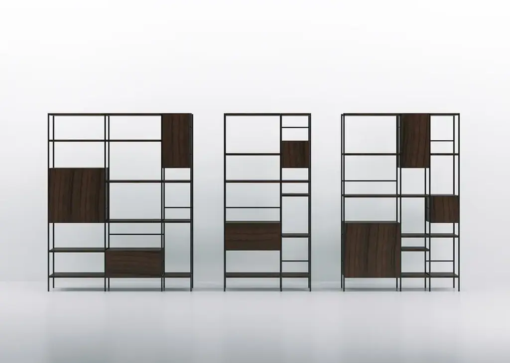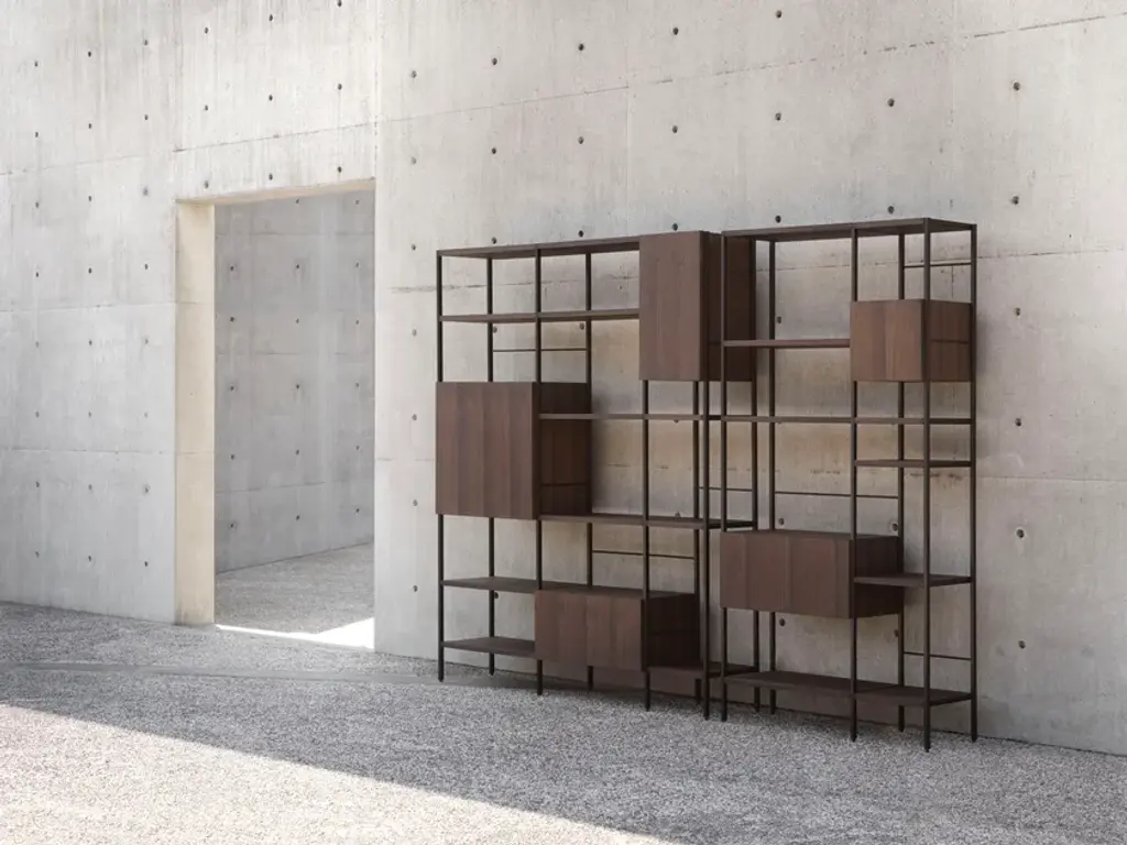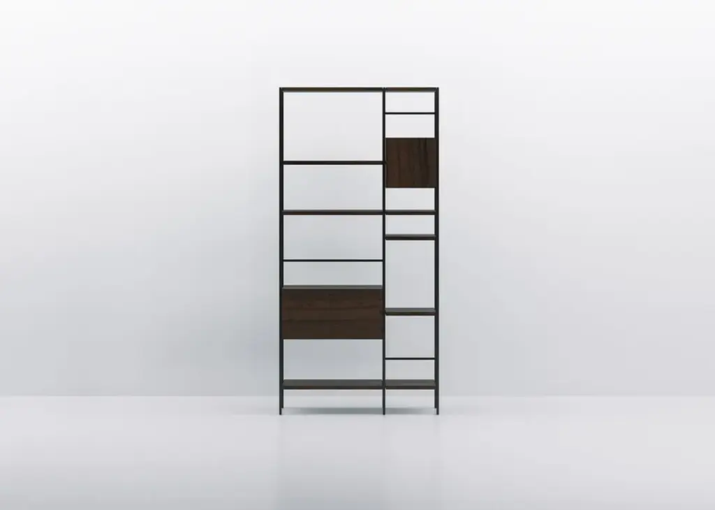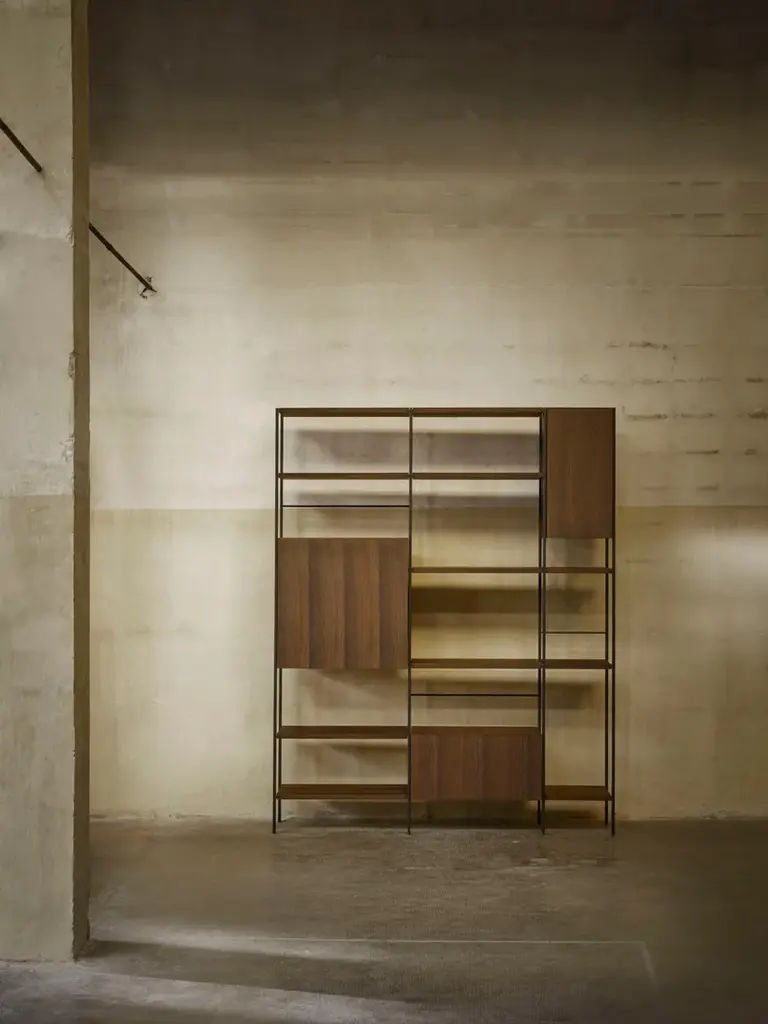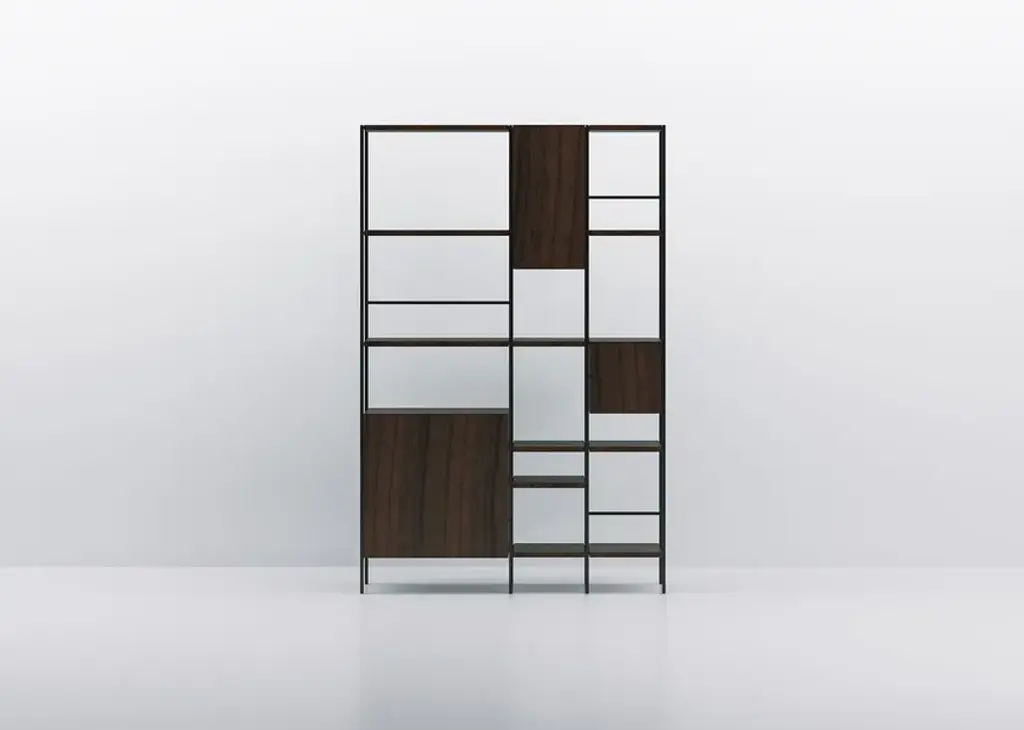With Outline, Giacomo Moor has created an elegantly functional, freestanding system of wooden cabinets and shelves contrasted with an iron support structure that can be placed against a wall or in the center of a space. The unusual round attachment recesses in the shelves and the cabinets break the linearity of the design and allow the components to be inserted by preference, easily sliding them in and out of place when rearranging. The visual contrast between the dimensions of the cabinets and shelves, and the lightness of the structure, unites the contemporary visual impact with that of a handmade cabinet.Frames and cabinetsA round recess placed in the shelves and shoulders of the cabinets makes it possible to insert shelves and cabinets into the round sides of the metal frame, a structural and aesthetic detail. Cabinets with hinged or flap doors (R) depending on type. The back is also perfectly finished. Glass shelves included.The bookcase is self-supporting; back wall supports are recommended. Adjustable feet.Finishes_ Shelves and cabinets in dark-stained walnut veneer;_ frame in painted satin nickel black steel.DimensionsAvailable in three different sizes, each with its own configuration;designed to be used individually or together.D41 L108 H221; D41 L144 H221; D41 L178 H221 cm.