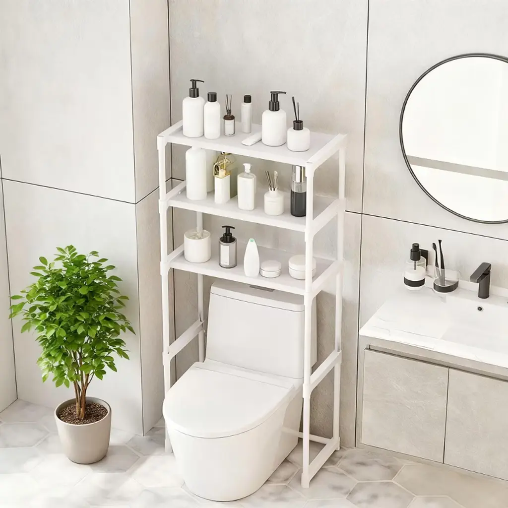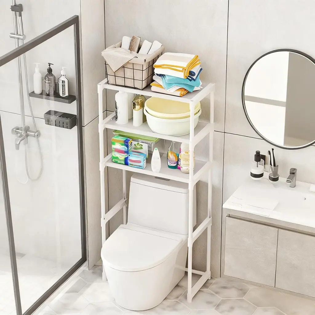 Over The Toilet Storage, 3 Tier Metal Bathroom Shelf Organizer Space SaverProduct Description:Maximize your bathroom's vertical space with this versatile 3-Tier Over The Toilet Shelf. Designed to fit securely over most standard toilets, this freestanding organizer provides substantial storage without requiring wall mounting or tools. The durable white powder-coated steel construction ensures stability and rust resistance, while the three spacious shelves offer ample room for toiletries, towels, and bathroom essentials. Perfect for small bathrooms, powder rooms, and laundry areas, this space-saving solution helps you maintain an organized and clutter-free environment.Key Features:Smart Space-Saving DesignSpecifically engineered to utilize the often-wasted space above your toilet, this shelf unit adds significant storage capacity without reducing your bathroom's footprint. The freestanding design fits securely around most standard toilets, making it ideal for compact bathrooms, apartment living, and any area where floor space is limited.Three-Roomy Storage TiersOrganize all your bathroom necessities across three generous shelves. The practical tiered design provides separate spaces for frequently used items, extra towel storage, and decorative pieces, helping you maintain a tidy and functional bathroom environment with everything within easy reach.Durable Steel ConstructionBuilt from high-quality carbon steel with a durable white powder-coated finish, this shelf unit withstands humid bathroom conditions while resisting rust and corrosion. The sturdy frame provides reliable support for heavier items like towel stacks and toilet paper bundles without wobbling or bending.Tool-Free Freestanding AssemblyEnjoy quick and straightforward setup that requires no drilling, wall anchors, or special tools. The freestanding design means you can position it over your toilet immediately after simple assembly and easily relocate it as needed for cleaning or redecorating.Versatile Multi-Room OrganizerBeyond bathroom use, this shelving unit serves as an effective organizer for various spaces. Use it in laundry rooms for detergent and supplies, on balconies for potted plants and gardening items, or in bedrooms for additional storage¡ªmaking it a versatile organizational solution throughout your home.Specifications:Material: Carbon SteelFinish: White Powder-CoatedDimensions: 19.8" D x 11.8" W x 52.7" HShelves: 3 Tier DesignWeight Capacity: Up to 30 lbs per shelfAssembly Required: Yes (Tool-Free)Mounting Type: Freestanding/Floor MountItem Weight: 2.8 lbsSpecial Feature: Heavy Duty, Space SavingRoom Type: Bathroom, Laundry, Balcony