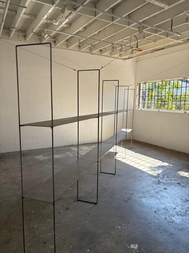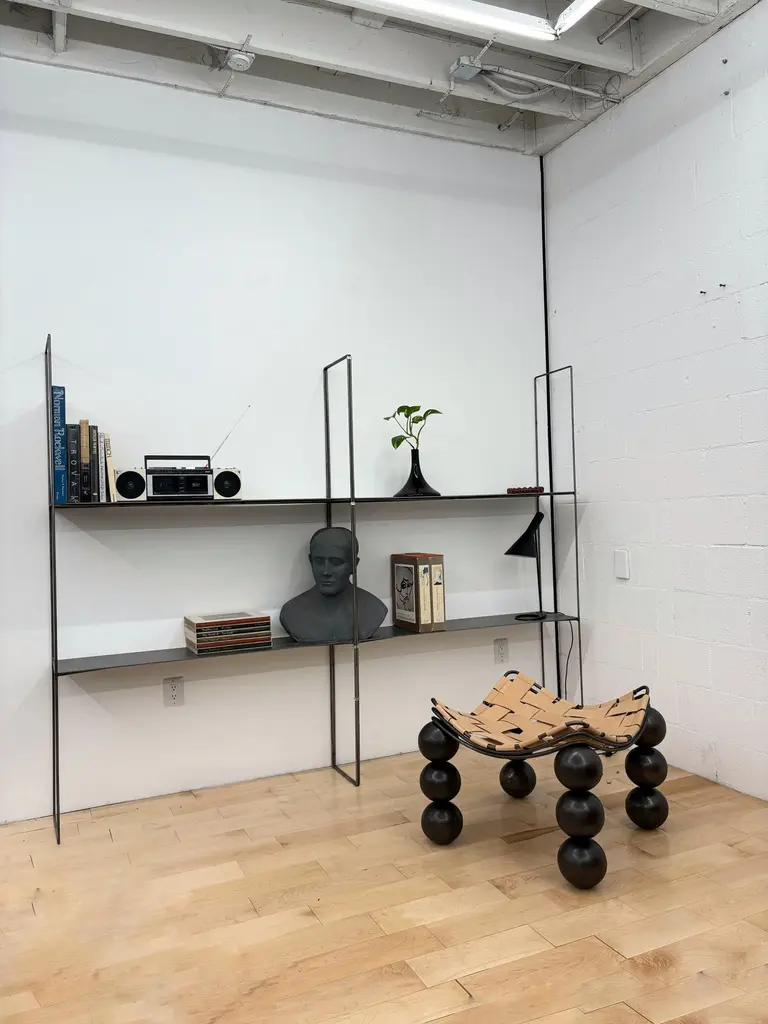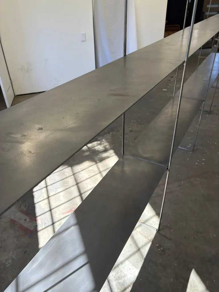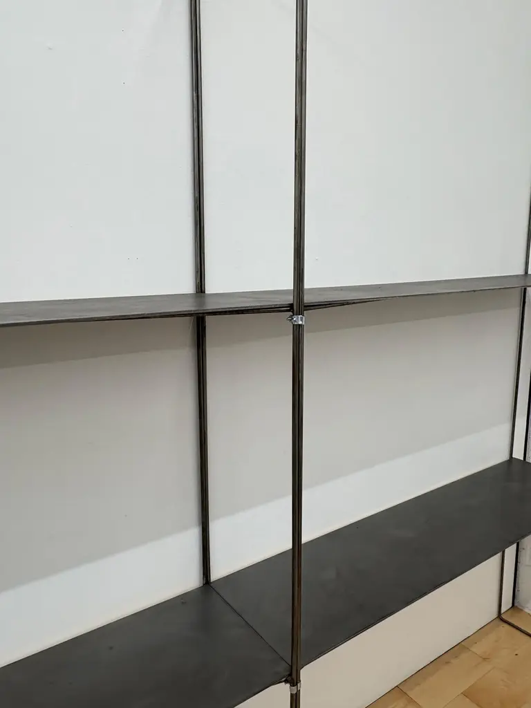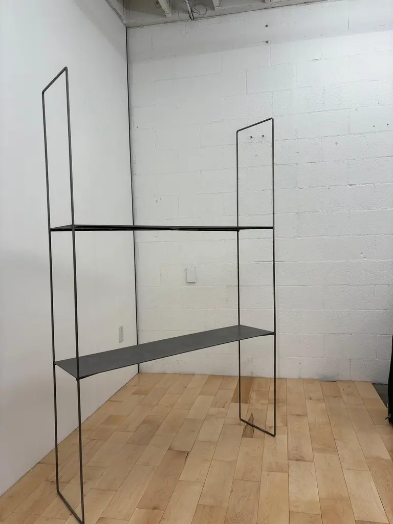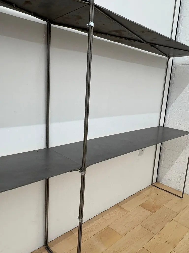 A pair of ultra-minimalist modular steel shelving units, (two pairs available) designed and handcrafted in Los Angeles by Dieppa Design for a contemporary art show. These architecturally inspired shelves feature a raw, industrial aesthetic, with clean lines and modular adaptability. The construction consists of 3/16” thick steel plate shelves with a solid, monolithic feel.Each modular unit measures 4 ft wide, 75 inches high, and 12 inches deep, with two shelf platforms at 25” and 50” from the ground.Their powerful, minimal silhouette makes them perfect for art displays, gallery installations, retail showrooms, or modern residential interiors. Due to their refined minimalism, wall attachment is recommended for stability if used in high-traffic areas.Dimensions (per unit):•Width: 48 inches•Height: 75 inches•Depth: 12 inches•Shelf spacing: 25” to 50” off floor•Shelf plate thickness: 3/16” solid steelPlease note: shelves are hand built, slight variations are to be expected. When placing two shelving unit side-by-side brackets are needed to hold the shelves together.