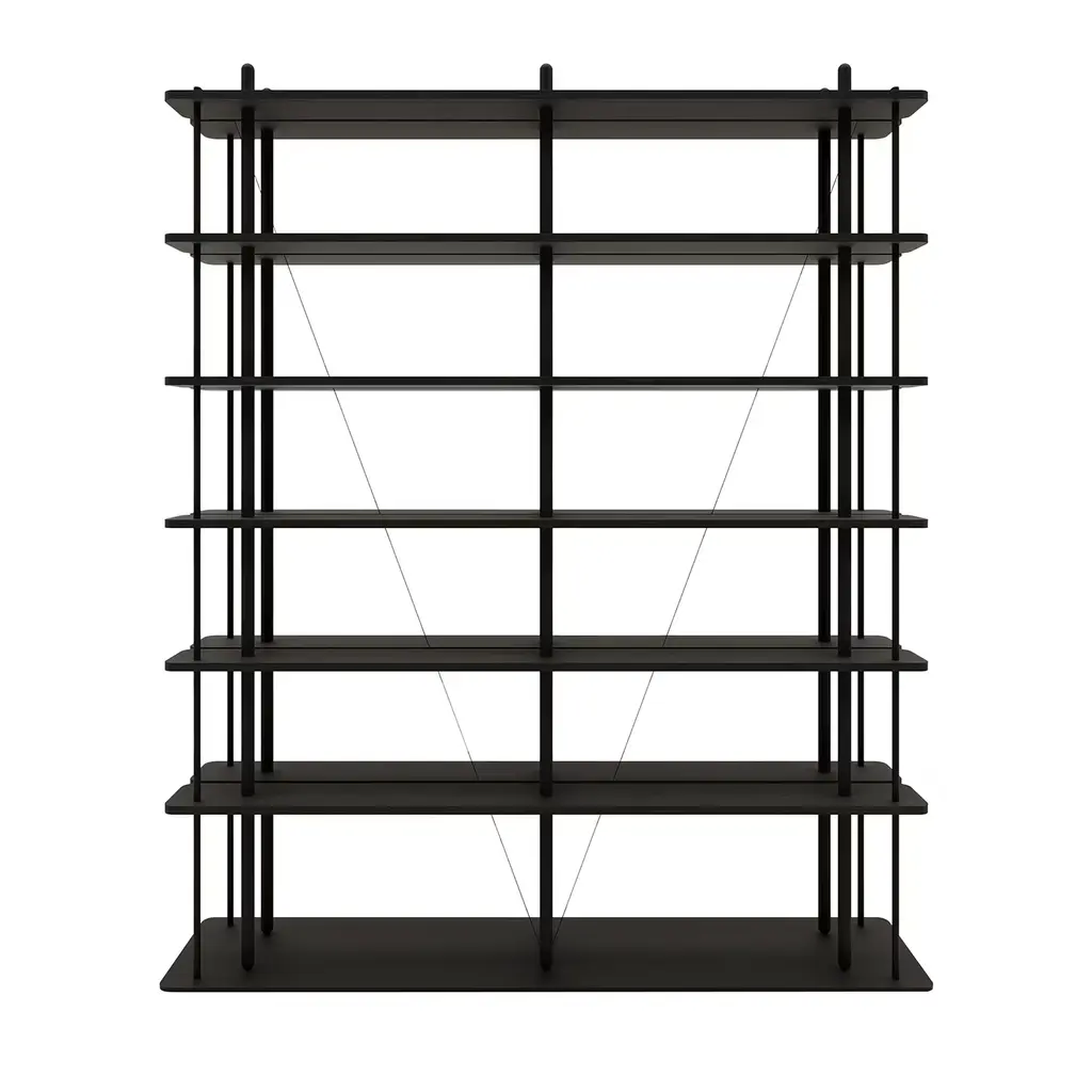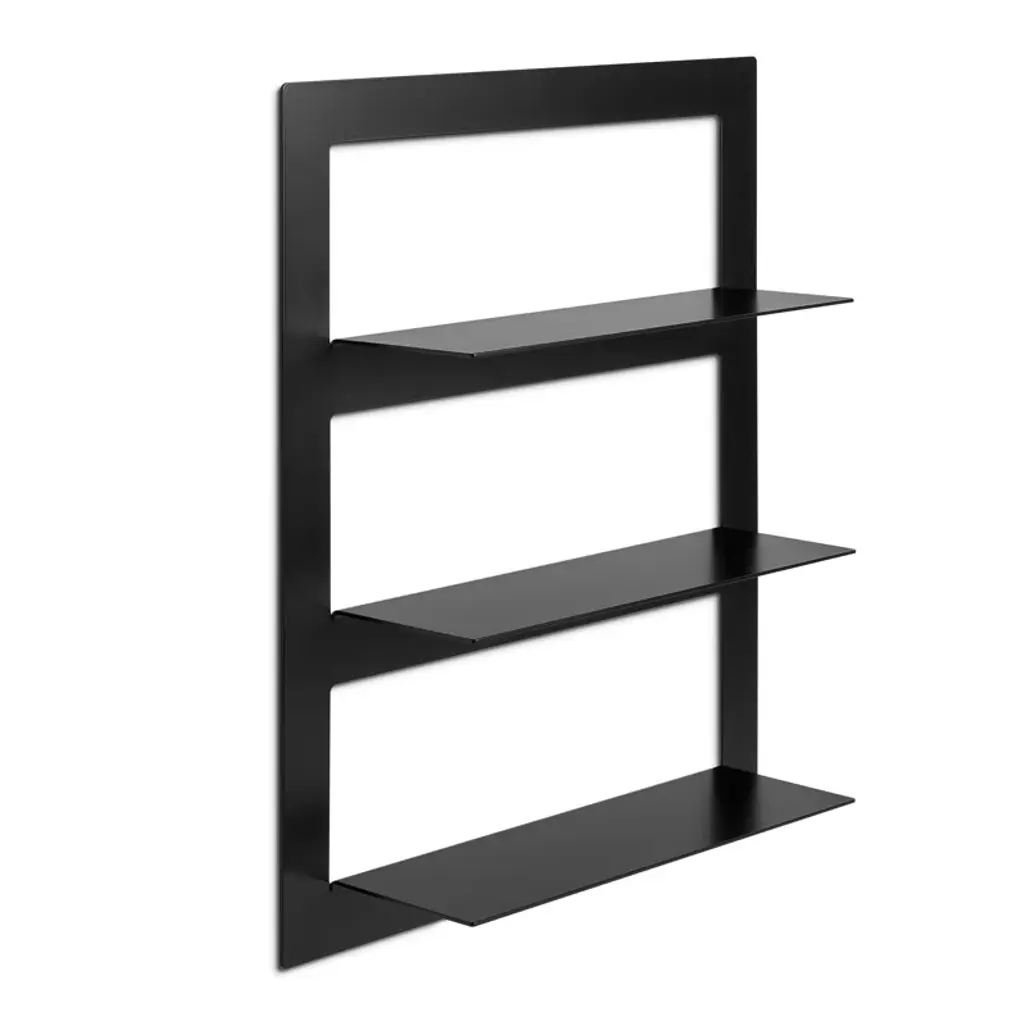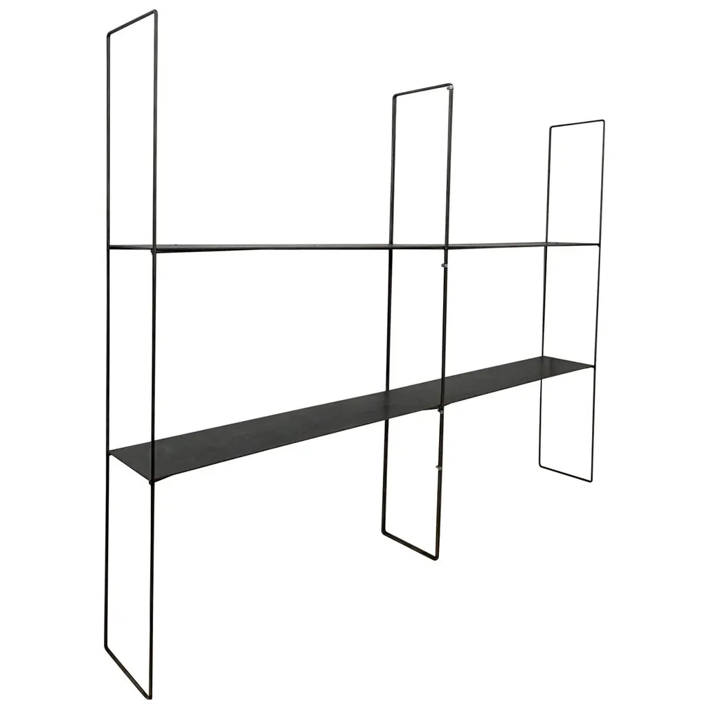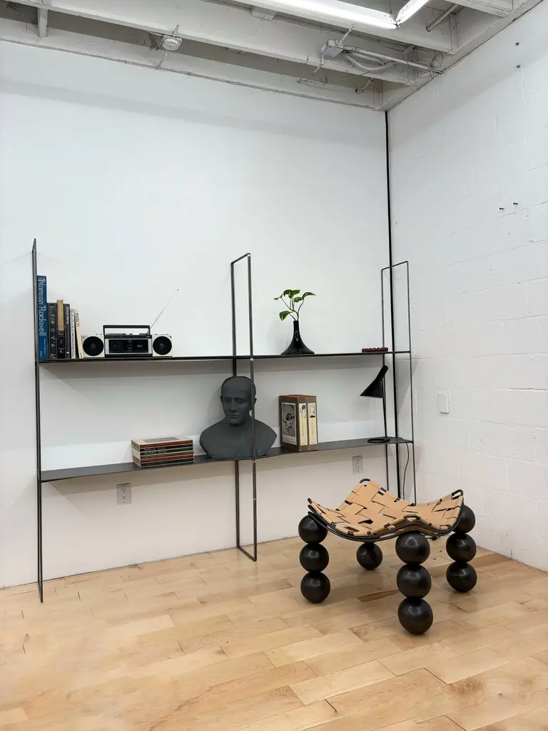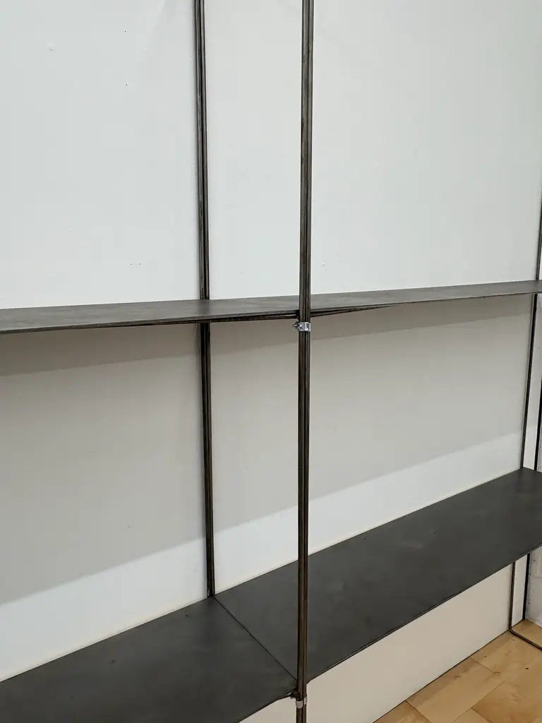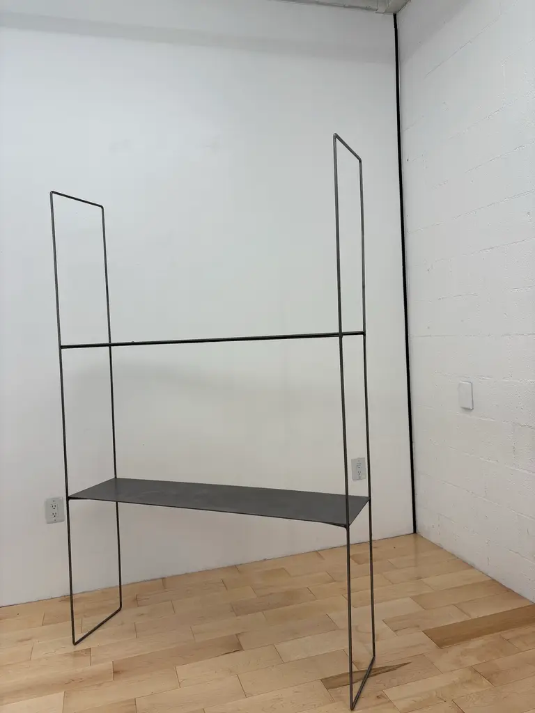 4 individual modular shelves selling as 2 sets of 2. A pair of ultra-minimalist modular steel shelving units, (two pairs available) designed and handcrafted in Los Angeles by Dieppa Design for a contemporary art show. These architecturally inspired shelves feature a raw, industrial aesthetic, with clean lines and modular adaptability. The construction consists of 3/16” thick steel plate shelves with a solid, monolithic feel. Each modular unit measures 4 ft wide, 75 inches high, and 12 inches deep, with two shelf platforms at 25” and 50” from the ground. Their powerful, minimal silhouette makes them perfect for art displays, gallery installations, retail showrooms, or modern residential interiors. Due to their refined minimalism, wall attachment is highly recommended for stability. Dimensions (per unit): • Width: 48 inches • Height: 75 inches • Depth: 12 inches • Shelf spacing: 25” to 50” off floor • Shelf plate thickness: 3/16” solid steel Please note: shelves are hand built, slight variations are to be expected. When placing two shelving unit side-by-side brackets are needed to hold the shelves together.