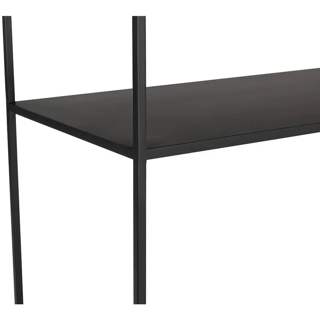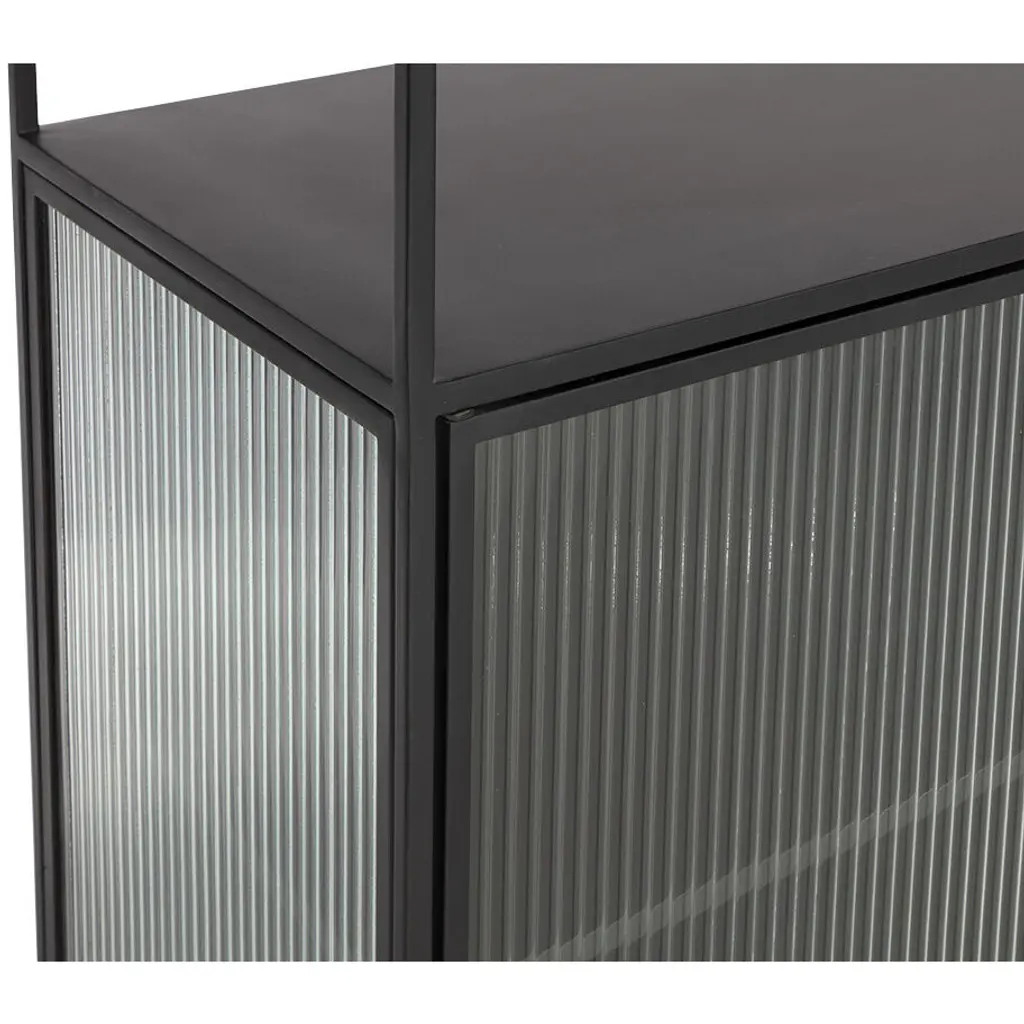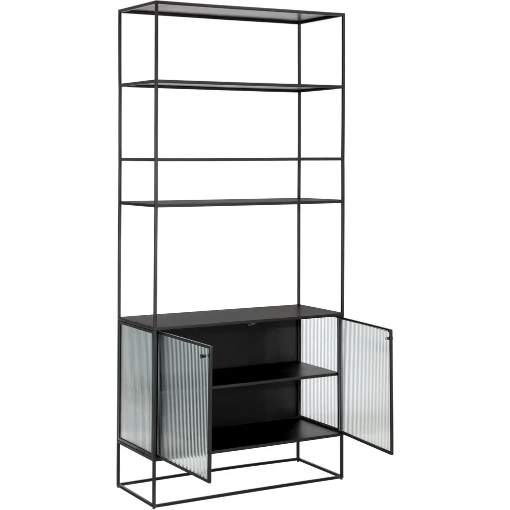 Inspired by mid-century modern designs, this bookcase evokes a timeless and minimalist style. Crafted with a matte black iron frame with shelving units for ample storage, and features fluted glass doors.