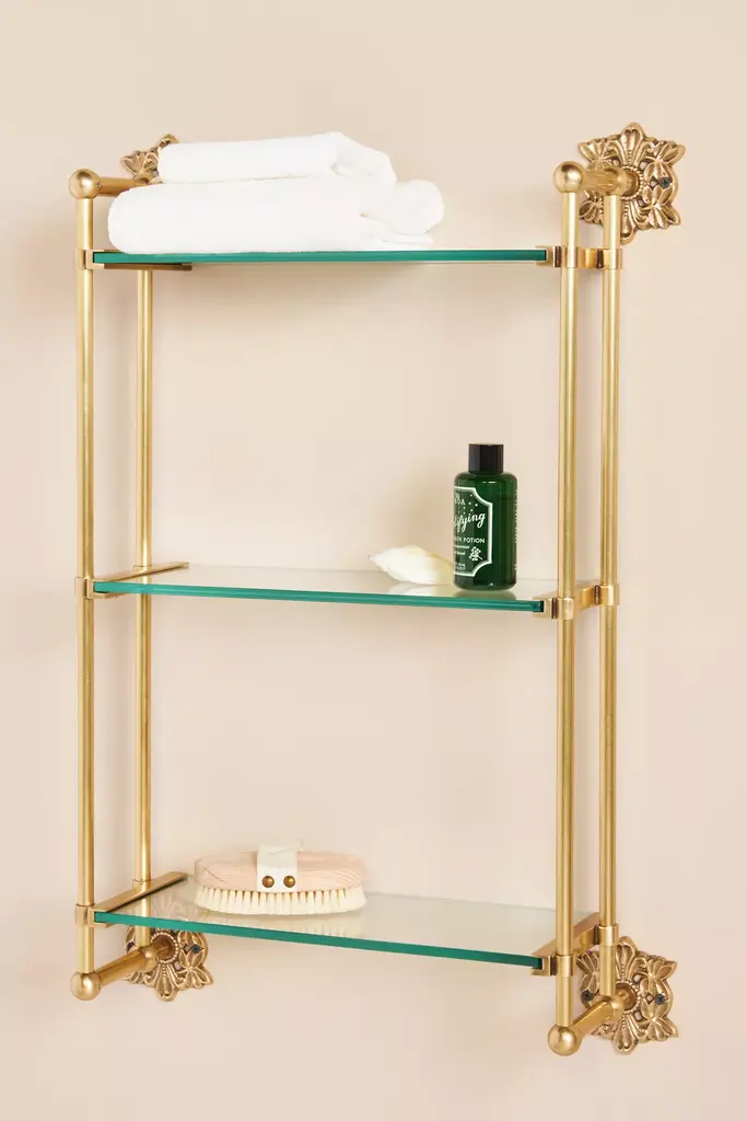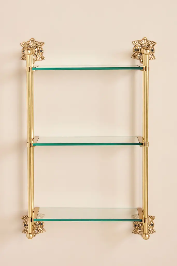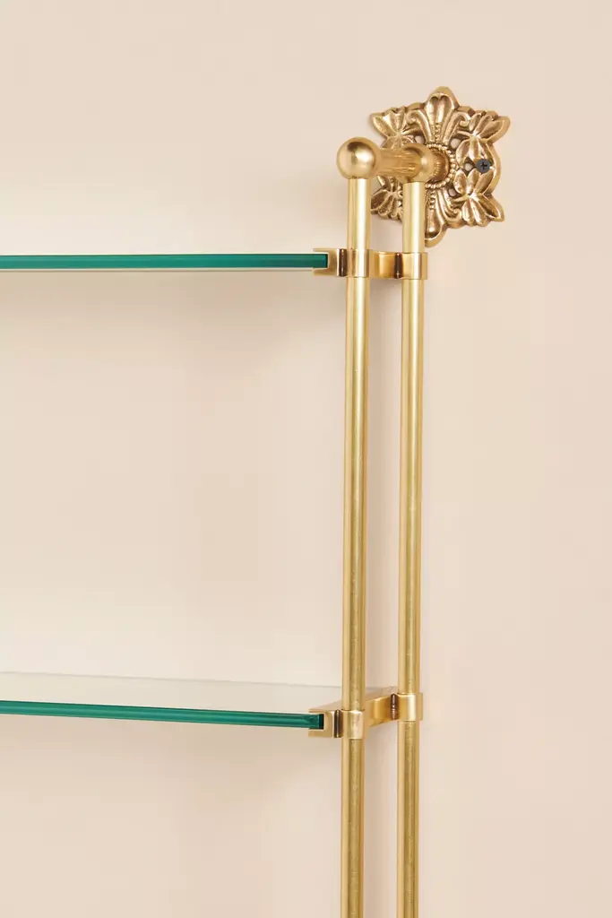 Stunning and vintage-inspired, elegant adornments don this shelf's joinery and edges.