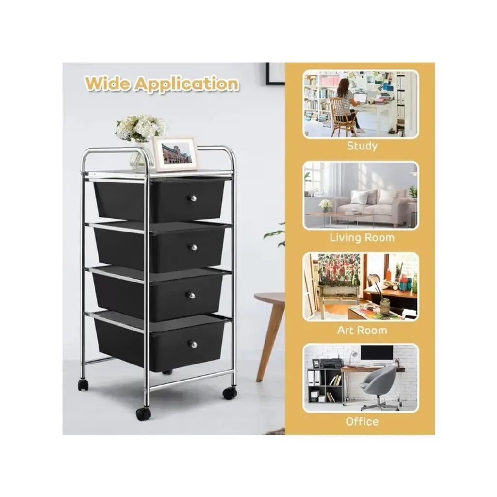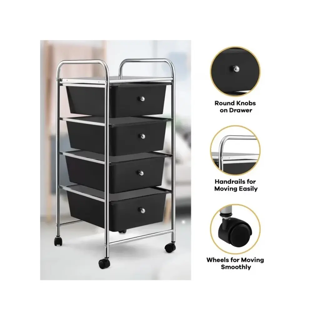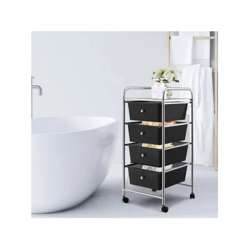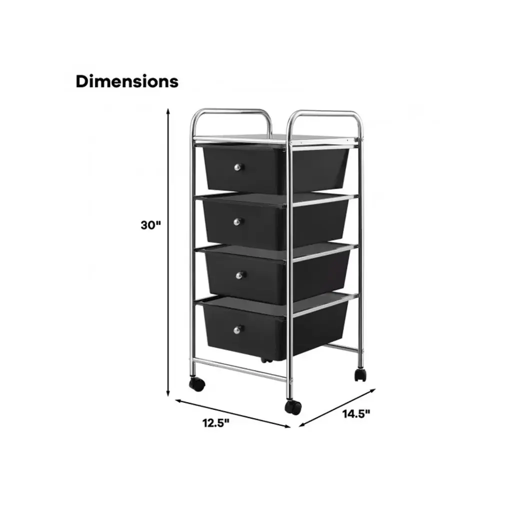 Designed with 4 deep storage bins and one spacious top, the drawer cart can accommodate your various items and leave you a neat room. Every drawer can be slide out smoothly and you can quickly get what you want. In addition, it is equipped with 4 universal wheels, which add convenience when you need to move it from room to room. Also, it is robustly built for long-lasting service. The durable and rust-free steel frame helps to maintain its shape even under heavyweight. If you are looking for a 4-drawer storage cart like this, do not hesitate to place an order! 4 drawers plus a spacious top provide you with enough storage spaceSlide-out drawer design allows quick and convenient accessThe strong steel frame makes it stable and durableUniversal casters allow you to move it effortlesslyTall handles make it easy to push and pullAn easy assembly according to the detailed instructionsWide application for home/school/beauty salon/office