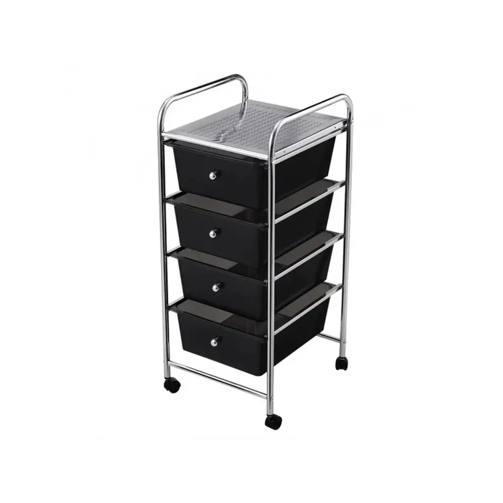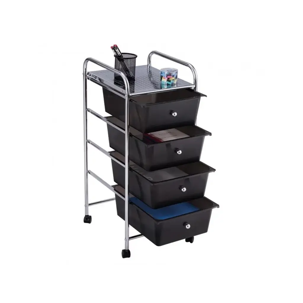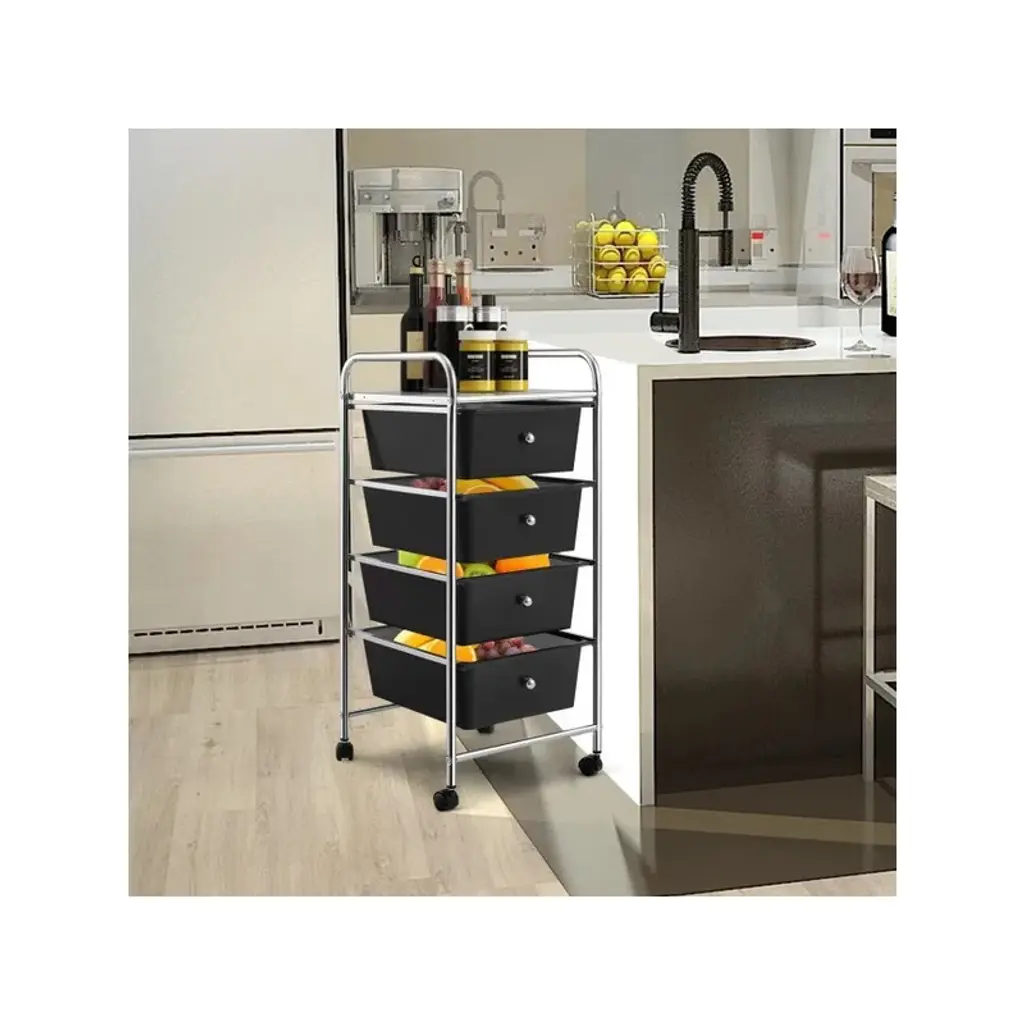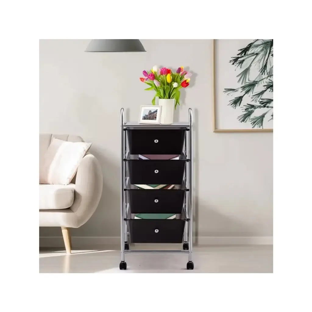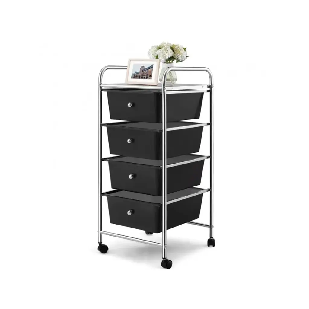 Designed with 4 deep storage bins and one spacious top, the drawer cart can accommodate your various items and leave you a neat room. Every drawer can be slide out smoothly and you can quickly get what you want. In addition, it is equipped with 4 universal wheels, which add convenience when you need to move it from room to room. Also, it is robustly built for long-lasting service. The durable and rust-free steel frame helps to maintain its shape even under heavyweight. If you are looking for a 4-drawer storage cart like this, do not hesitate to place an order! 4 drawers plus a spacious top provide you with enough storage spaceSlide-out drawer design allows quick and convenient accessThe strong steel frame makes it stable and durableUniversal casters allow you to move it effortlesslyTall handles make it easy to push and pullAn easy assembly according to the detailed instructionsWide application for home/school/beauty salon/office