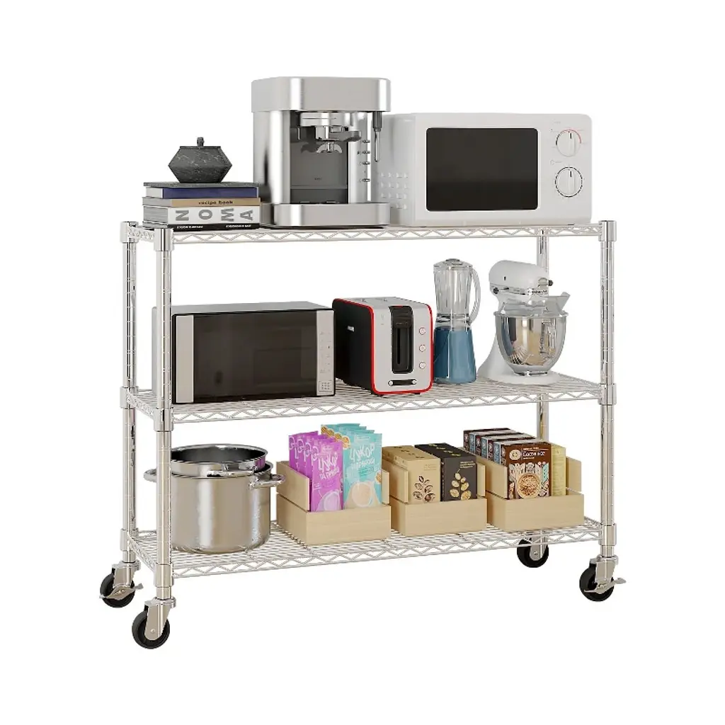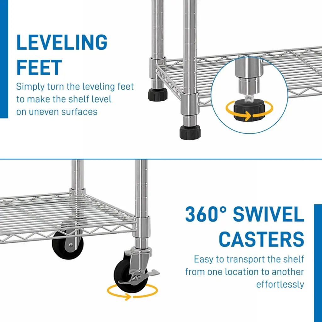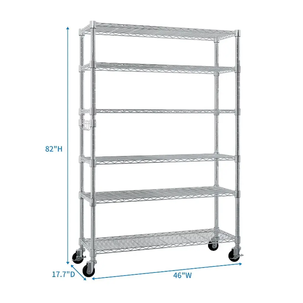 Maximize your storage potential with this 6-Tier NSF Certified Wire Shelving Unit, designed for both commercial and residential use. Measuring 48"L x 18"W x 72"H, this freestanding rack offers generous vertical storage while maintaining a compact footprint. Each of the six shelves is removable and height-adjustable, letting you tailor the configuration to suit your needs¡ªstore tall kitchen appliances, stack cleaning supplies, or organize tools in the garage with ease. Built with industrial-grade steel, this rack features a shiny chrome-plated finish that resists rust, corrosion, and daily wear. Whether in a restaurant kitchen or your home pantry, the NSF certification guarantees safe use in food service environments. The unit also includes four heavy-duty caster wheels, two of which lock for secure placement. Move your shelving unit with ease for cleaning or rearranging your space.