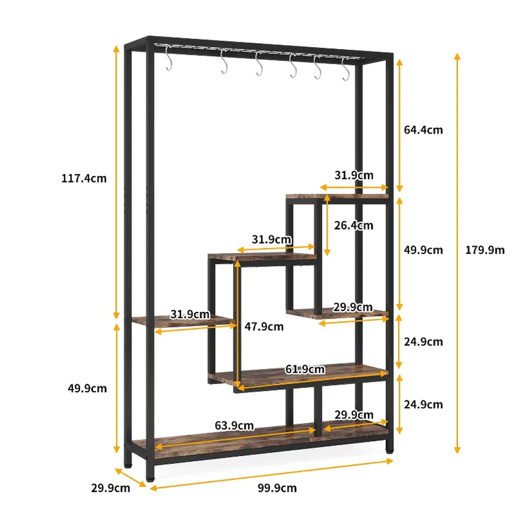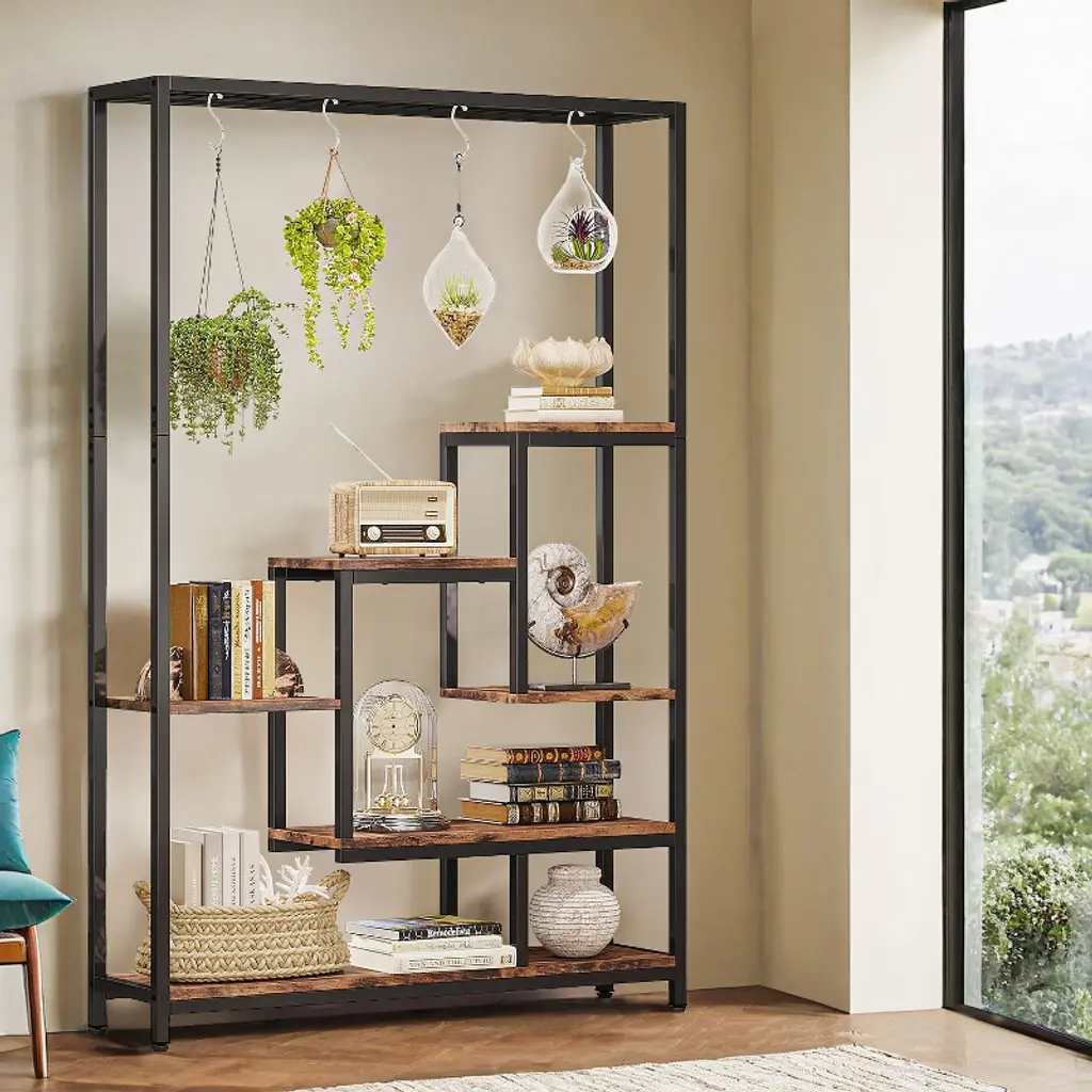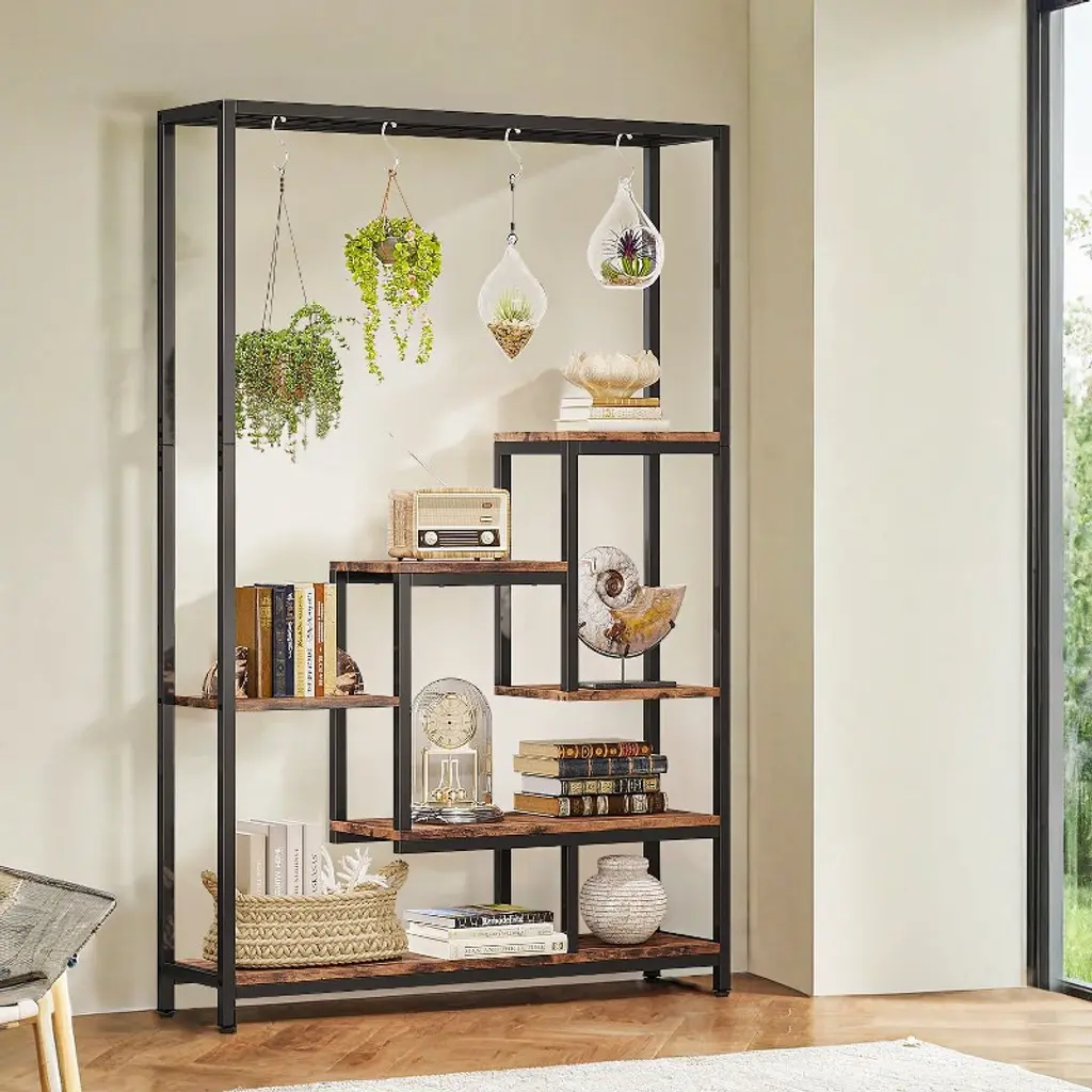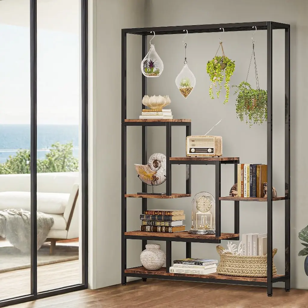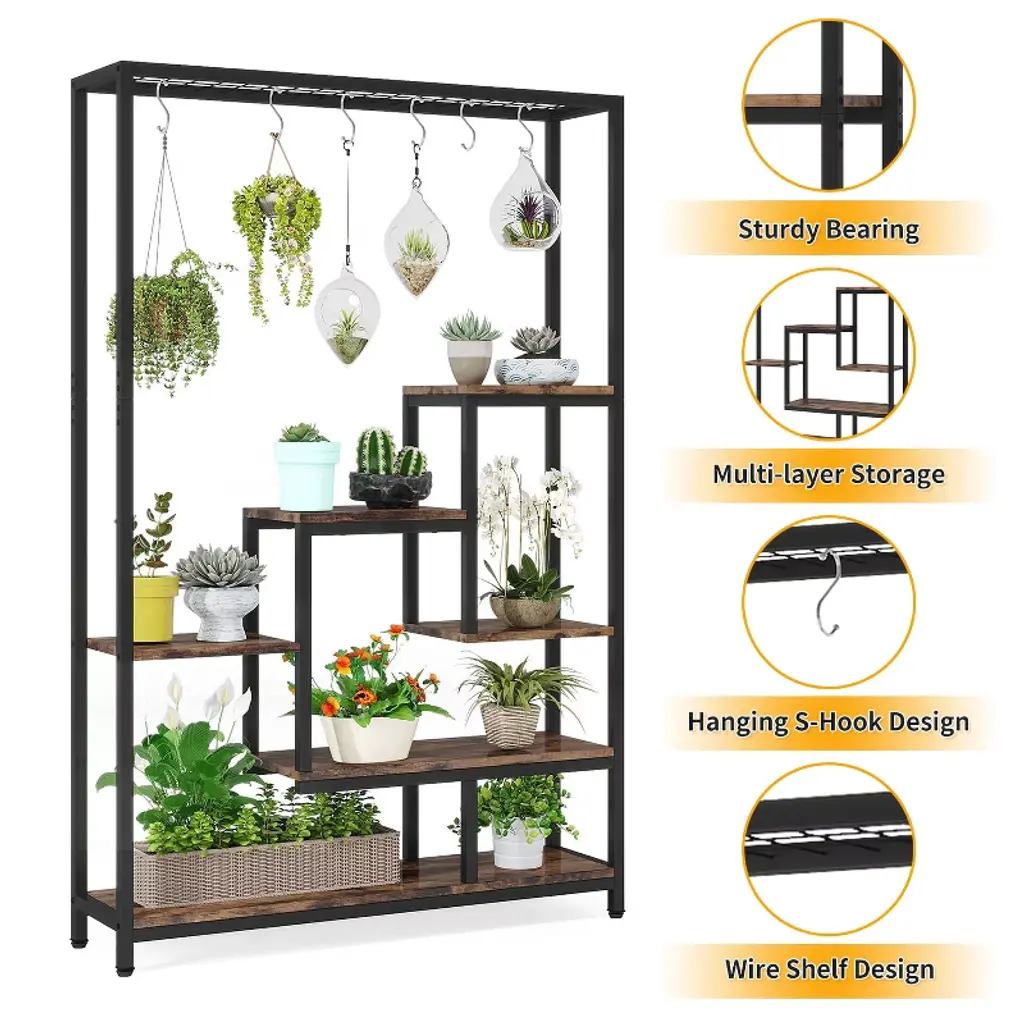 Our indoor plant stand features a 7-shelf design with wide and spacious shelves. Each shelf is capable of holding at least 8 regular-sized plant pots, providing ample room for your greenery. The top wire shelf is also perfect for displaying small bonsai plants, and the attached S-hooks allow for easy hanging display.Designed with a ladder shelf structure, our garden plant stand offers plenty of space for storing and growing plants of various sizes. The open design ensures that each plant receives enough sunlight for optimal growth. Our 5-tier flower stand maximizes storage space without taking up too much room. It efficiently utilizes vertical space and fits perfectly in corners, making it an ideal addition to your living room, dining room, patio, balcony, or garden. Overall: 39.37'' W x 11.81'' D x 70.86'' H Materials: Particle board & metal frame