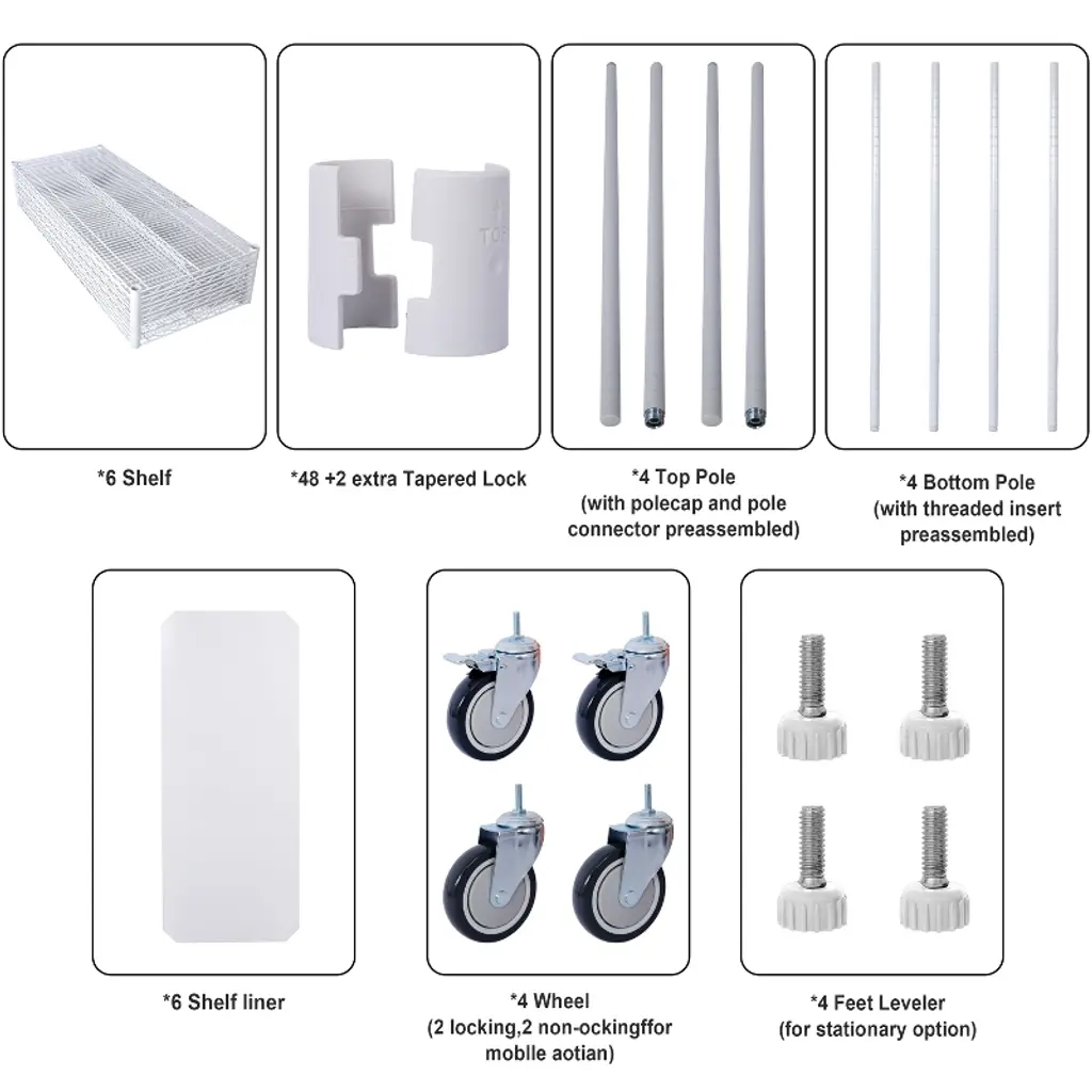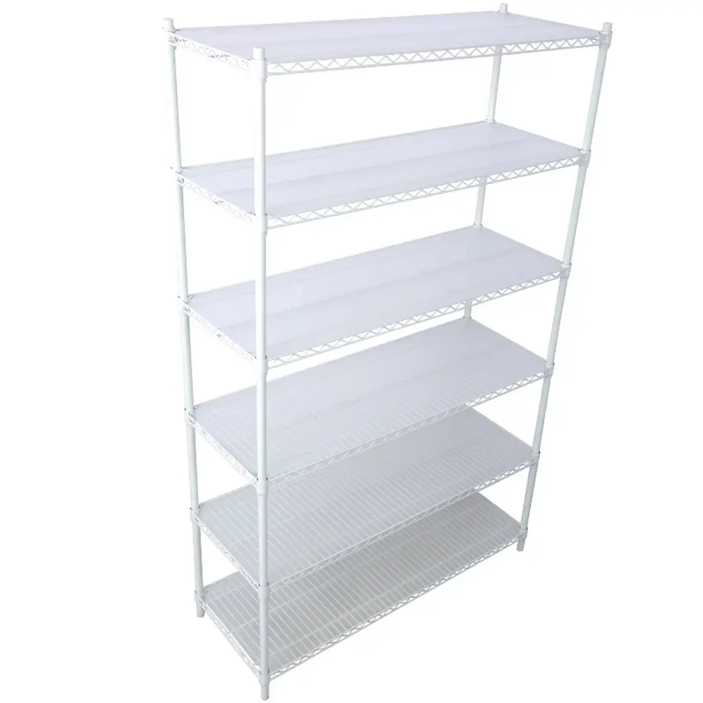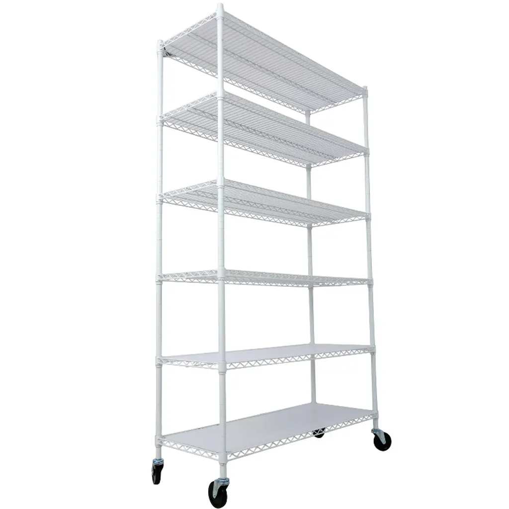 Our wire shelving units feature 6 tiers with a large capacity and a heavy-duty design to ensure stability, and it is recommended that heavier items be placed on the bottom shelf. Moreover, they are waterproof to ensure that they will not be damaged by moisture.