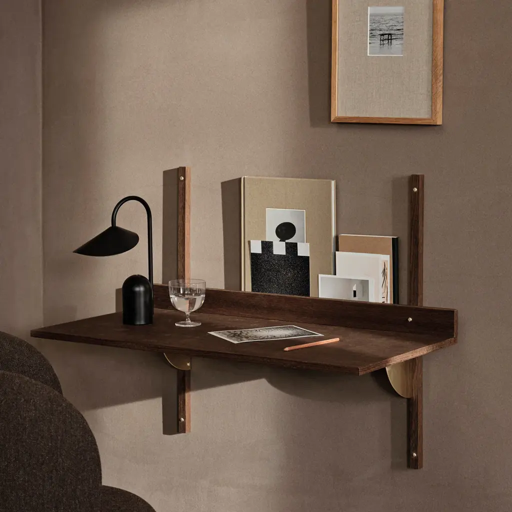 A new and modern take on Mid-century shelving units, Sector is defined by its sturdy simplicity and classic combination of wood and brass. Use the Sector Desk as a standalone surface or combine it with the Sector Shelves of your choice to form one integrated and cohesive workspace. A short border at the end of the desk forms a small, narrow space that's ideal for propping up hand-written notes or a favorite photograph. Choose between natural oak veneer or black stained ash veneer with brackets of either polished or blackened brass. The desk can hold up to 20 kg, provided it has been properly mounted onto an appropriate wall. The included rawlplugs can only be used for brick or concrete walls.