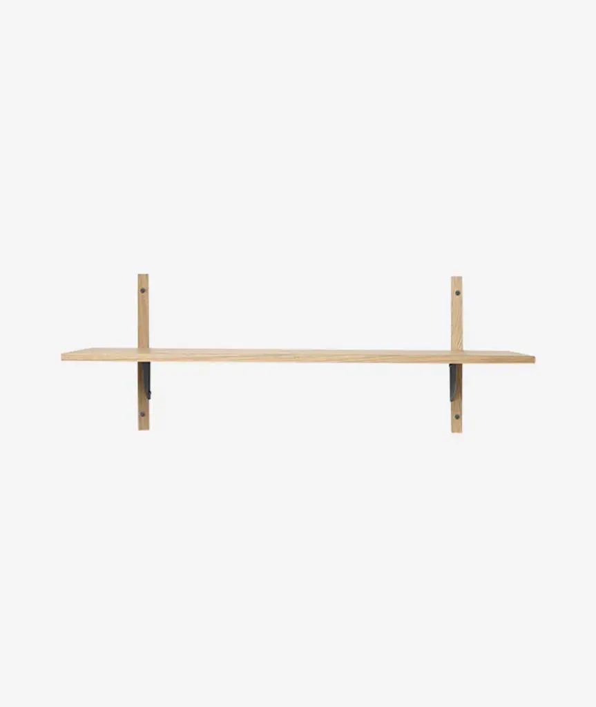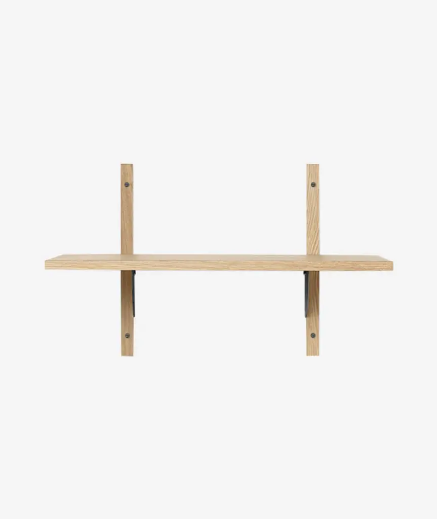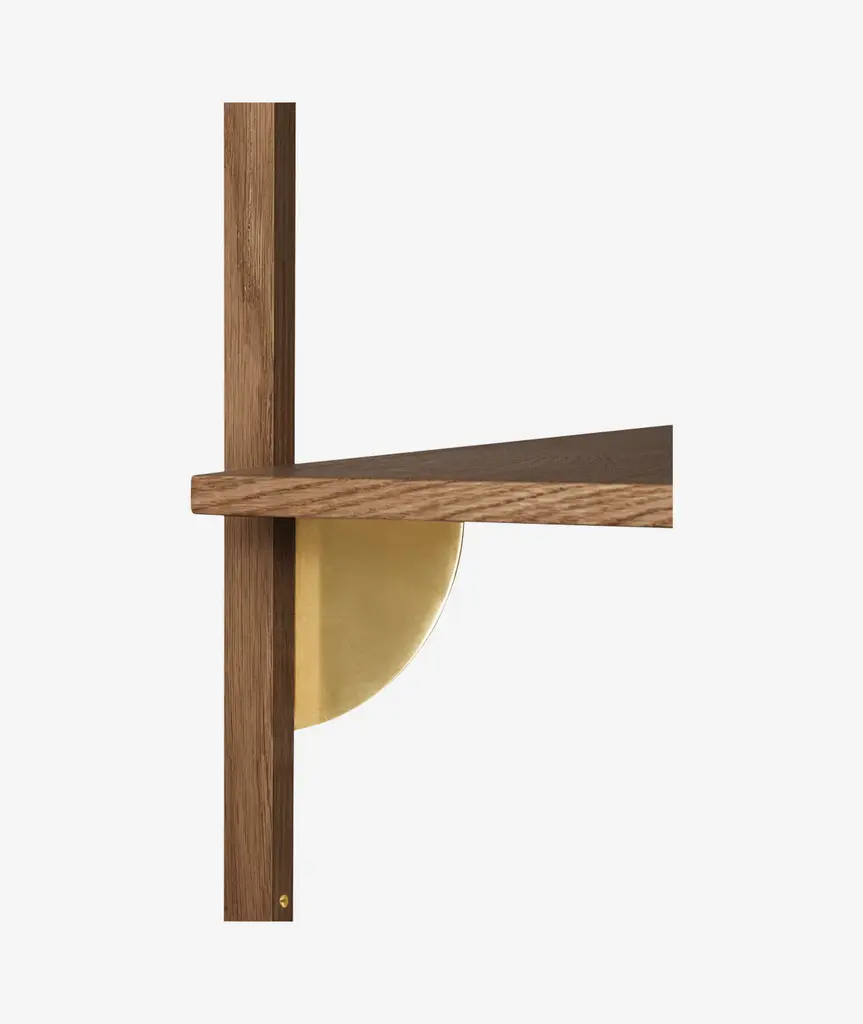 A new and modern take on Mid-century shelving units, Sector is defined by its sturdy simplicity and classic combination of wood and brass – available with natural oak veneer or black stained ash veneer shelves, and polished brass or blackened brass brackets. The shelf attaches to a wall with the accompanying solid wood uprights with visible screws. Use it to display favorite objects in a living room or storage jars in a kitchen.