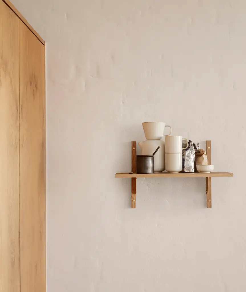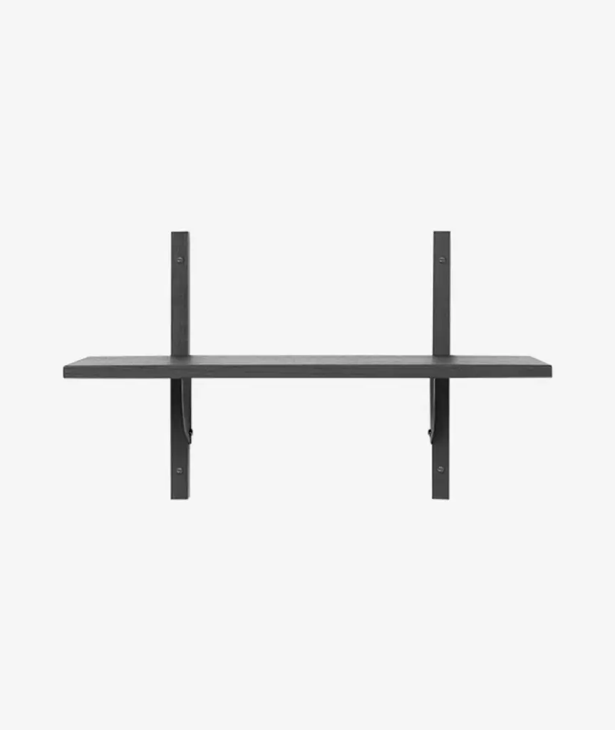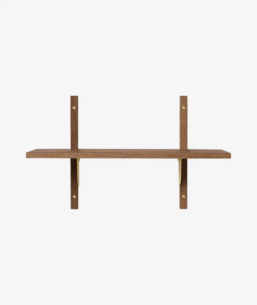 A new and modern take on Mid-century shelving units, Sector is defined by its sturdy simplicity and classic combination of wood and brass – available with natural oak veneer or black stained ash veneer shelves, and polished brass or blackened brass brackets. The shelf attaches to a wall with the accompanying solid wood uprights with visible screws. Use it to display favorite objects in a living room or storage jars in a kitchen.