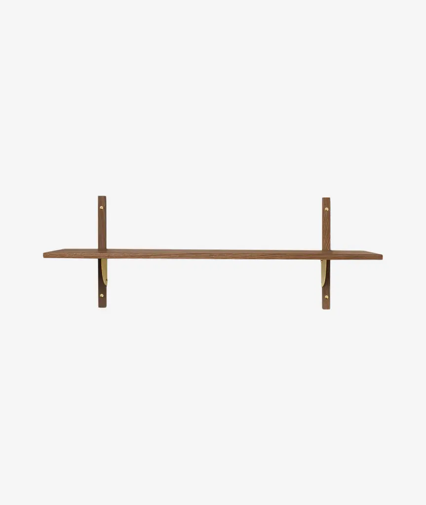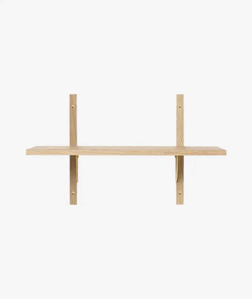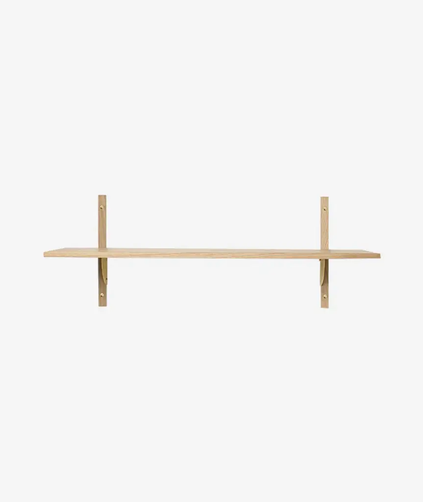 A new and modern take on Mid-century shelving units, Sector is defined by its sturdy simplicity and classic combination of wood and brass – available with natural oak veneer or black stained ash veneer shelves, and polished brass or blackened brass brackets. The shelf attaches to a wall with the accompanying solid wood uprights with visible screws. Use it to display favorite objects in a living room or storage jars in a kitchen.