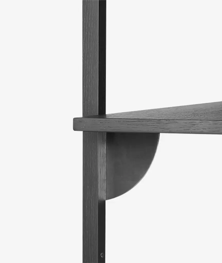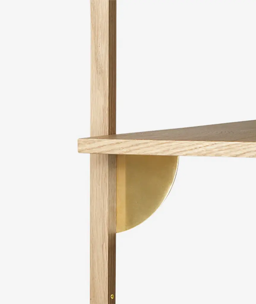 A new and modern take on Mid-century shelving units, Sector is defined by its sturdy simplicity and classic combination of wood and brass – available with natural oak veneer or black stained ash veneer shelves, and polished brass or blackened brass brackets. The shelf attaches to a wall with the accompanying solid wood uprights with visible screws. Use it to display favorite objects in a living room or storage jars in a kitchen.