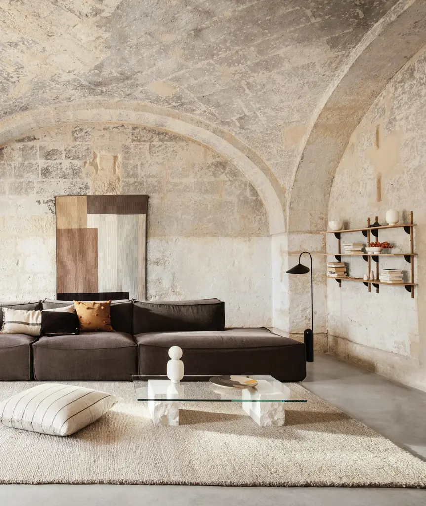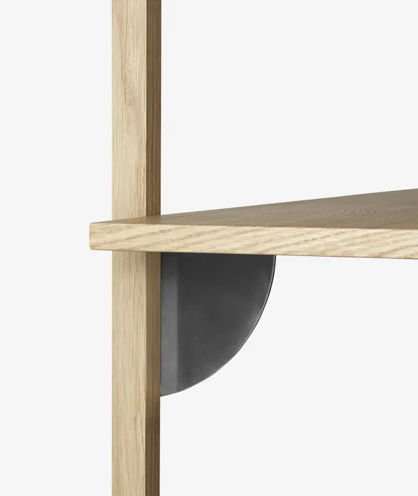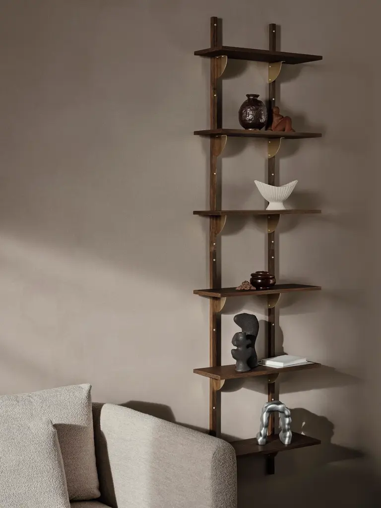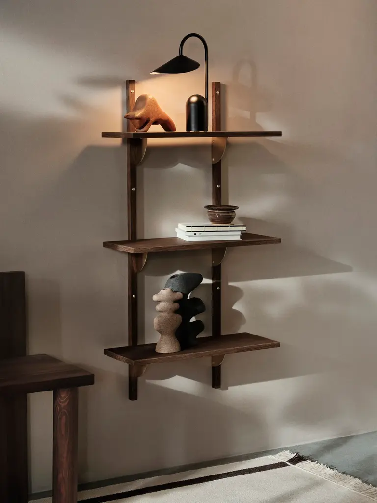 A new and modern take on Mid-century shelving units, Sector is defined by its sturdy simplicity and classic combination of wood and brass – available with natural oak veneer or black stained ash veneer shelves, and polished brass or blackened brass brackets. The shelf attaches to a wall with the accompanying solid wood uprights with visible screws. Use it to display favorite objects in a living room or storage jars in a kitchen.