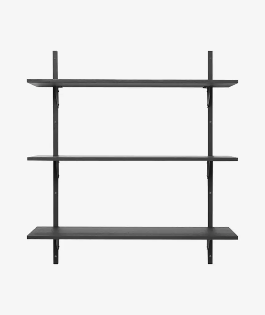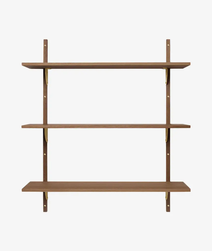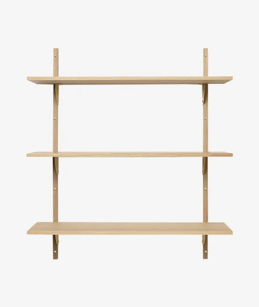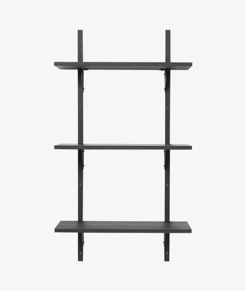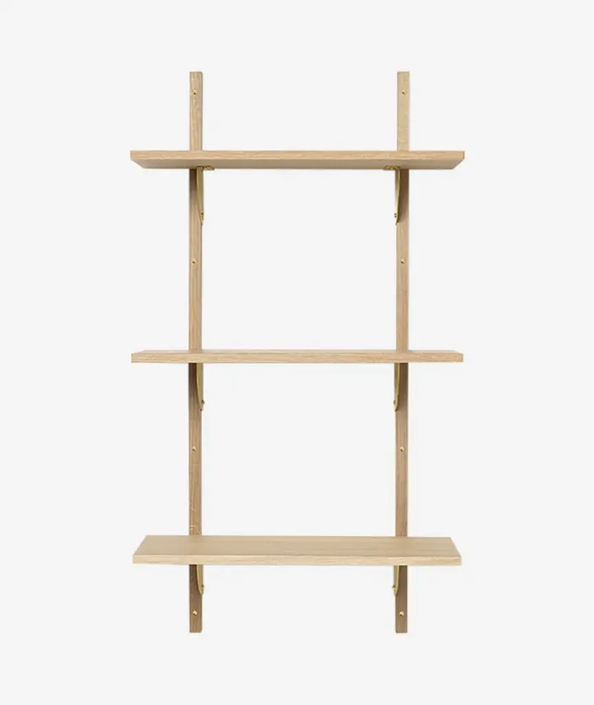 A new and modern take on Mid-century shelving units, Sector is defined by its sturdy simplicity and classic combination of wood and brass – available with natural oak veneer or black stained ash veneer shelves, and polished brass or blackened brass brackets. The shelf attaches to a wall with the accompanying solid wood uprights with visible screws. Use it to display favorite objects in a living room or storage jars in a kitchen.