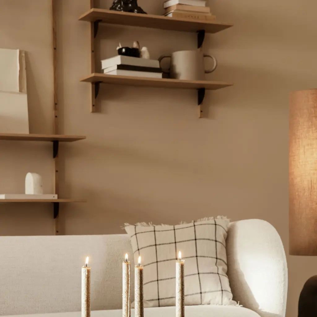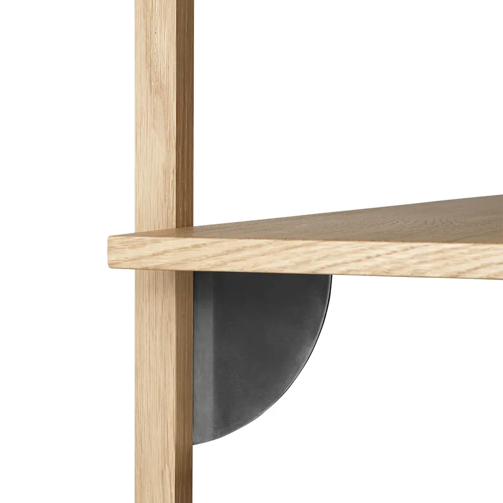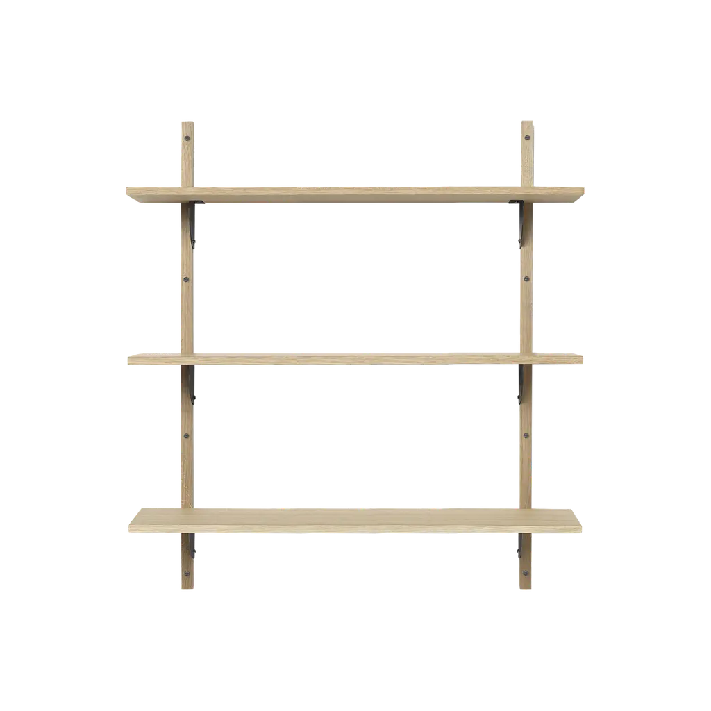 Mid-century modern design cues meet minimalism in the Ferm Living Sector collection. The Triple Narrow shelving unit features the range’s signature clean lines and exposed hardware, offering the perfect storage and item display solution for modern homes. Crafted with a blend of oak and brass, this version of the Sector shelving system features natural oak shelves, solid oak supports with a natural finish, and black brass hardware. The shelves attach to a brick or concrete wall with ease thanks to the included wall plugs. Ideal for any area of the home, this triple-shelf unit can be used for various items, on its own or alongside the Sector desk.
