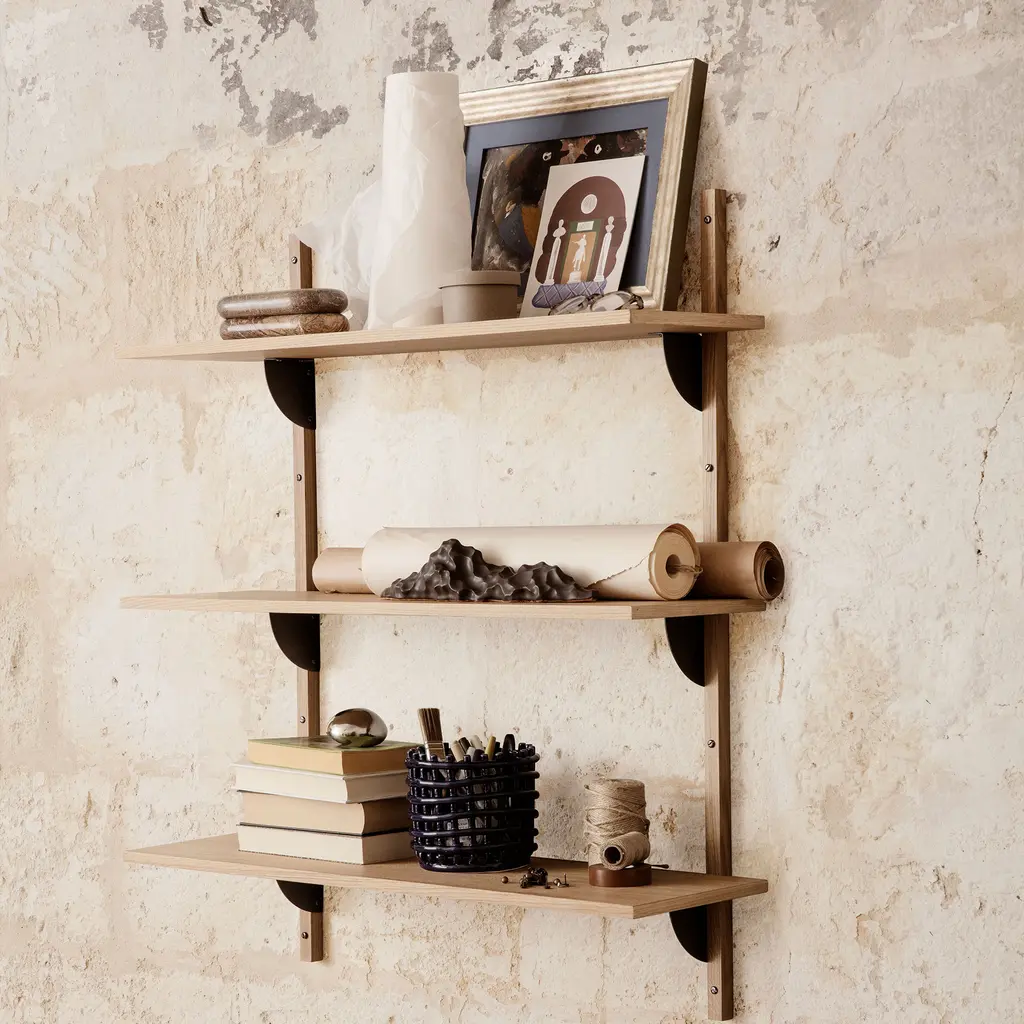 From living rooms to kitchens and offices, having a sturdy storage system that allows you to organize and showcase items in style is crucial. The Ferm Living Sector Triple Wide shelving unit also brings mid-century modern design cues into your home. Keeping minimalist design and quality in perfect balance, this shelving system combines natural oak and black brass brackets with exposed black screws. The open style of the shelves provides an easy way to display objects like books, vases, potted plants, jars of spices, and photos – to name a few. Plus, this product complements the Sector desk perfectly, offering a convenient solution to create the ideal home office, even in compact spaces.
