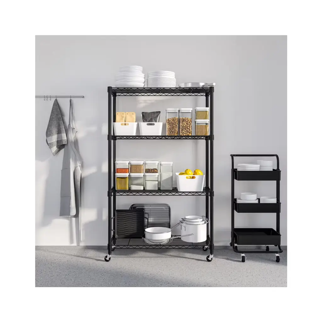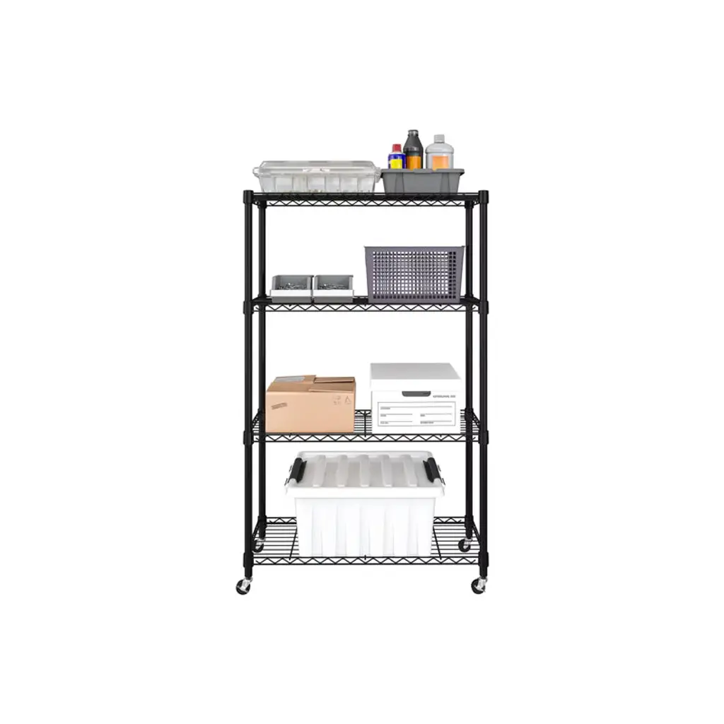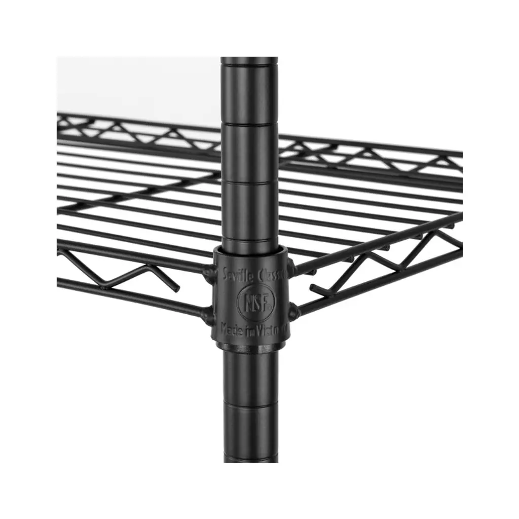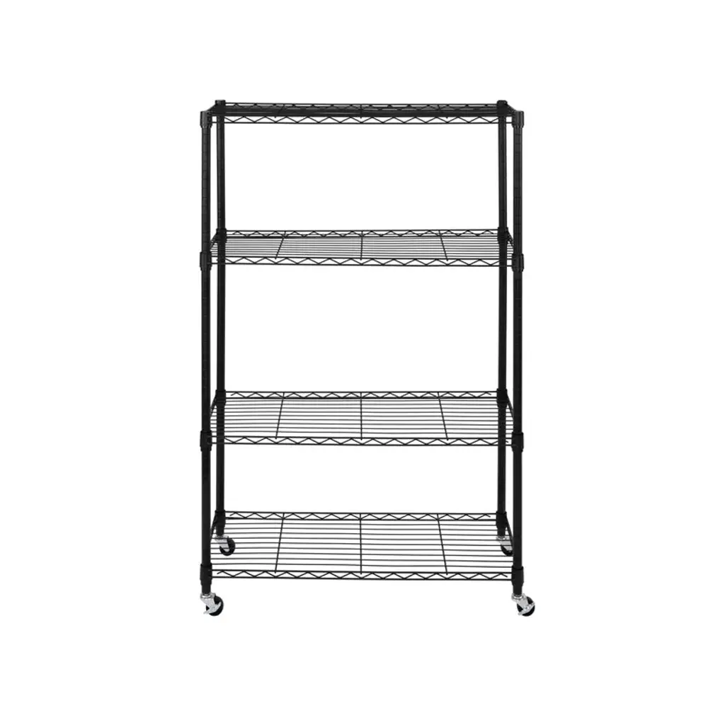 Store more at home or at the office with the Seville Classics 4-Tier Steel Wire Shelving System. This multipurpose shelving unit is ideal for use around the home, garage and office. Units are built with commercial-grade steel and finished for added durability and resistance to corrosion in dry storage environments. The system features wide (36" x 14") shelves engineered from heavy-duty steel wire for strength and low weight. The shelves attach to 1" thick poles with clip-on, slip sleeves and can be adjusted at 1" H increments. This model includes wheels and leveling feet for mobility and stability when you need it. The wheels feature steel hardware and include two that lock for stability when you need it. The system stands approximately 54" tall on leveling feet and 56.5" tall on wheels. This unit is designed for heavy-duty commercial-grade use and has been certified by the NSF to NSF/ANSI 2, the food equipment standard for dry storage and heated environments. Our shelves are engineered for professional use in restaurants and food service industry while being easy to use in your home. This metal shelving is designed to be freestanding with multipurpose use and utility in mind.