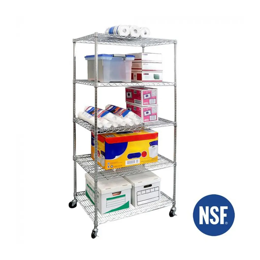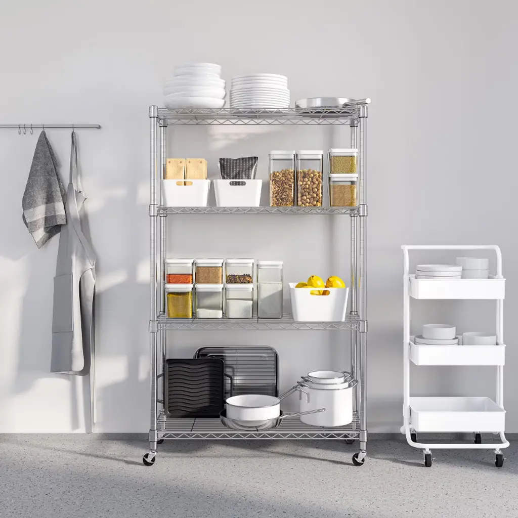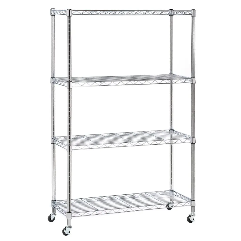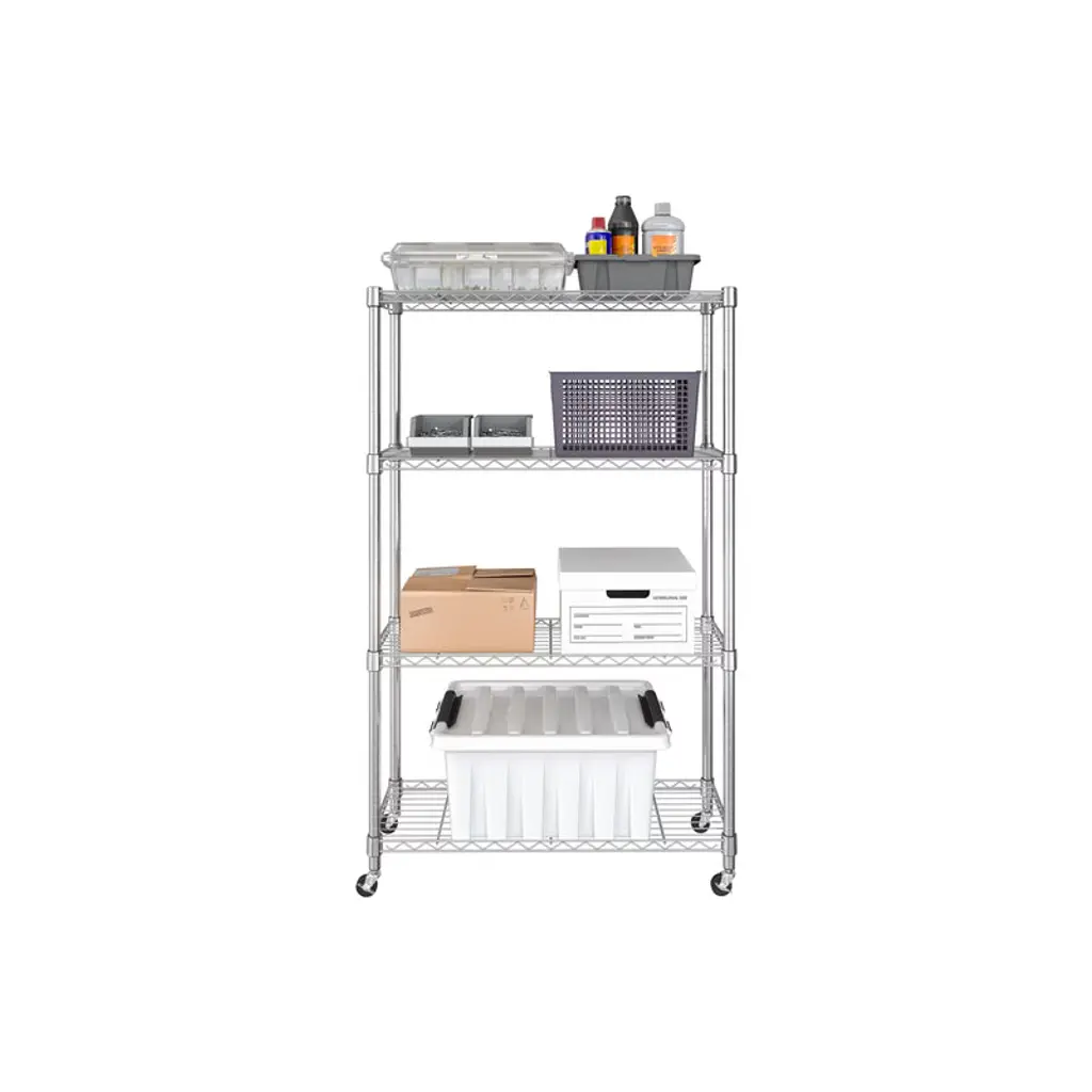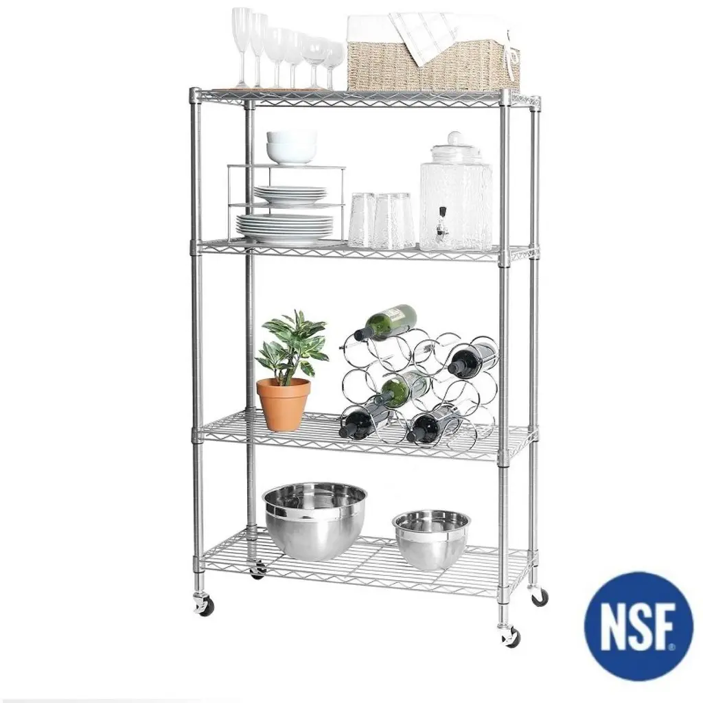 Store more at home or at the office with the Seville Classics 4-Tier Steel Wire Shelving System. This multipurpose shelving unit is ideal for use around the home, garage and office. Units are built with commercial-grade steel and finished for added durability and resistance to corrosion in dry storage environments. The system features wide (36" x 14") shelves engineered from heavy-duty steel wire for strength and low weight. The shelves attach to 1" thick poles with clip-on, slip sleeves and can be adjusted at 1" H increments. This model includes wheels and leveling feet for mobility and stability when you need it. The wheels feature steel hardware and include two that lock for stability when you need it. The system stands approximately 54" tall on leveling feet and 56.5" tall on wheels. This unit is designed for heavy-duty commercial-grade use and has been certified by the NSF to NSF/ANSI 2, the food equipment standard for dry storage and heated environments. Our shelves are engineered for professional use in restaurants and food service industry while being easy to use in your home. This metal shelving is designed to be freestanding with multipurpose use and utility in mind.