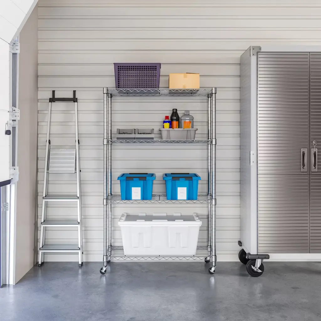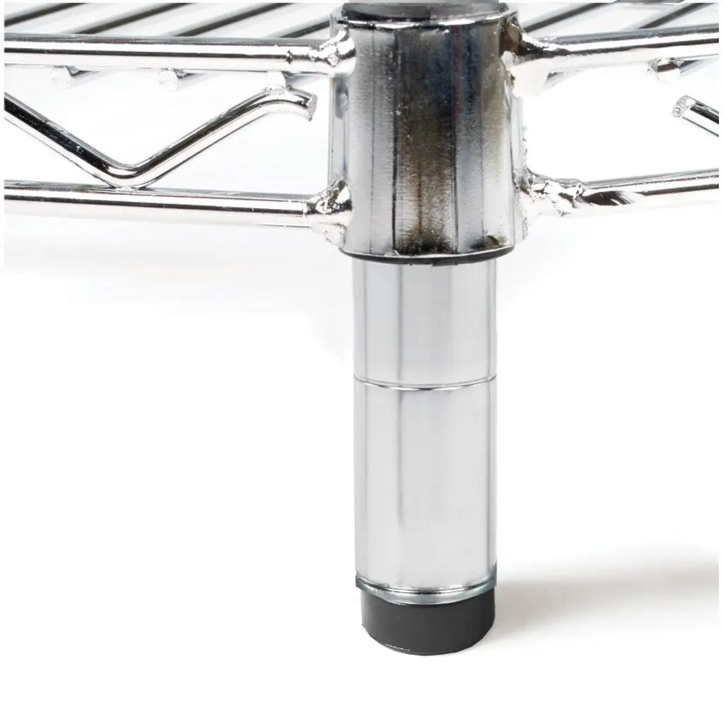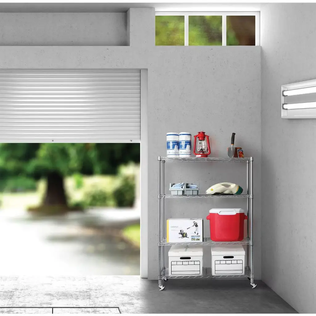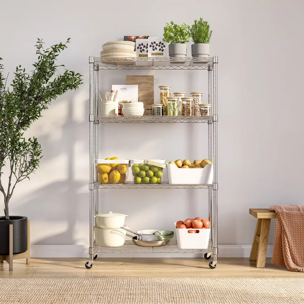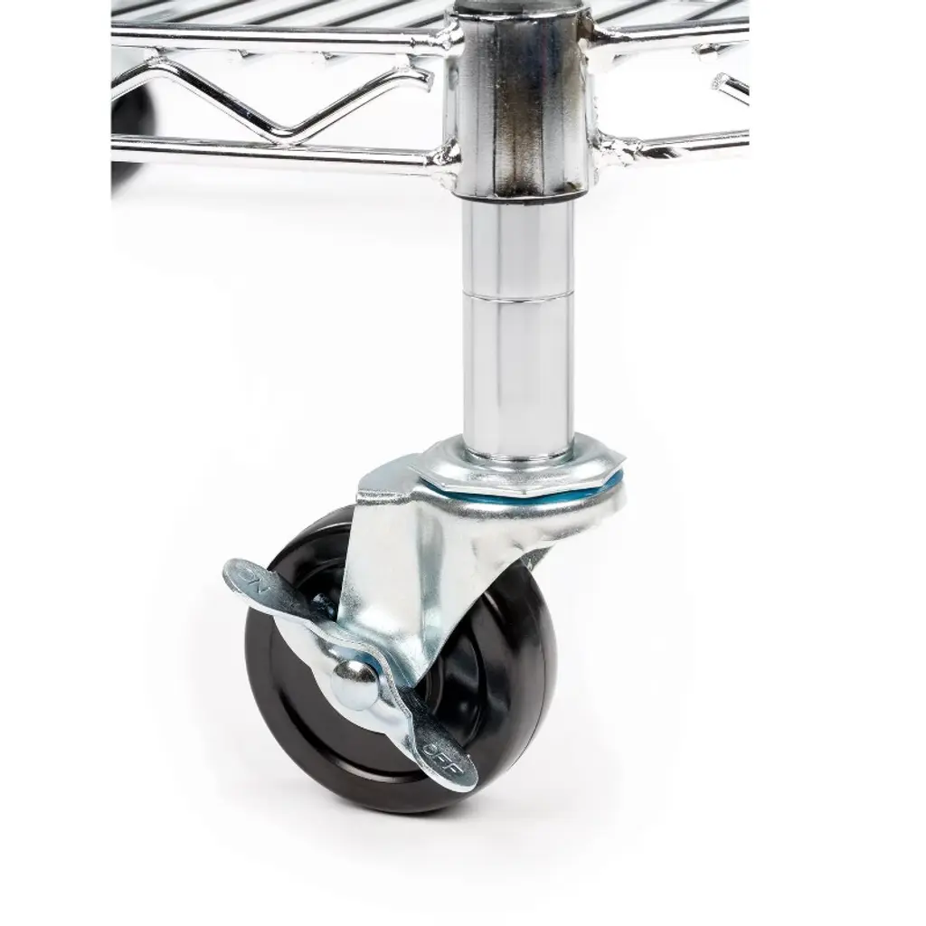 Store more at home or at the office with the Seville Classics 4-Tier Steel Wire Shelving System. This multipurpose shelving unit is ideal for use around the home, garage and office. Units are built with commercial-grade steel and finished for added durability and resistance to corrosion in dry storage environments. The system features wide (36" x 14") shelves engineered from heavy-duty steel wire for strength and low weight. The shelves attach to 1" thick poles with clip-on, slip sleeves and can be adjusted at 1" H increments. This model includes wheels and leveling feet for mobility and stability when you need it. The wheels feature steel hardware and include two that lock for stability when you need it. The system stands approximately 54" tall on leveling feet and 56.5" tall on wheels. This unit is designed for heavy-duty commercial-grade use and has been certified by the NSF to NSF/ANSI 2, the food equipment standard for dry storage and heated environments. Our shelves are engineered for professional use in restaurants and food service industry while being easy to use in your home. This metal shelving is designed to be freestanding with multipurpose use and utility in mind.