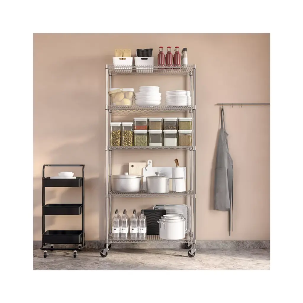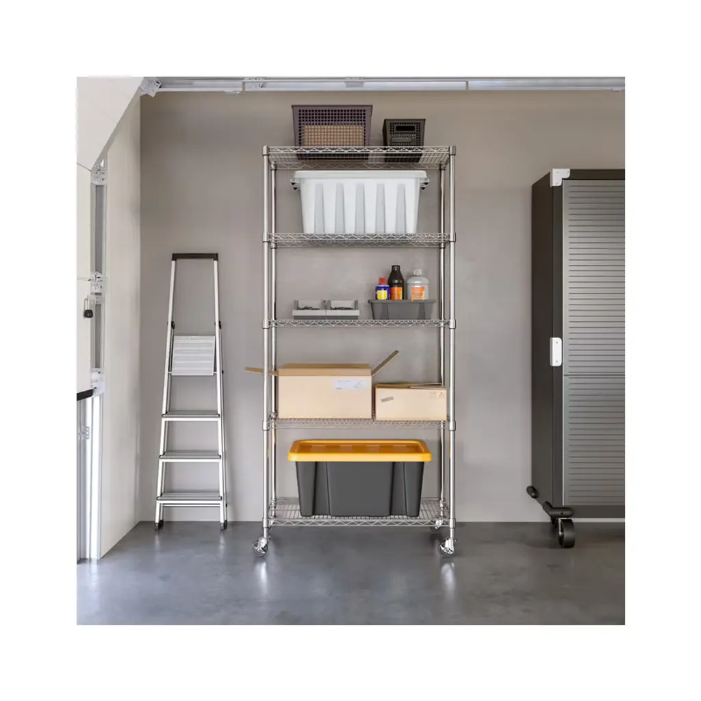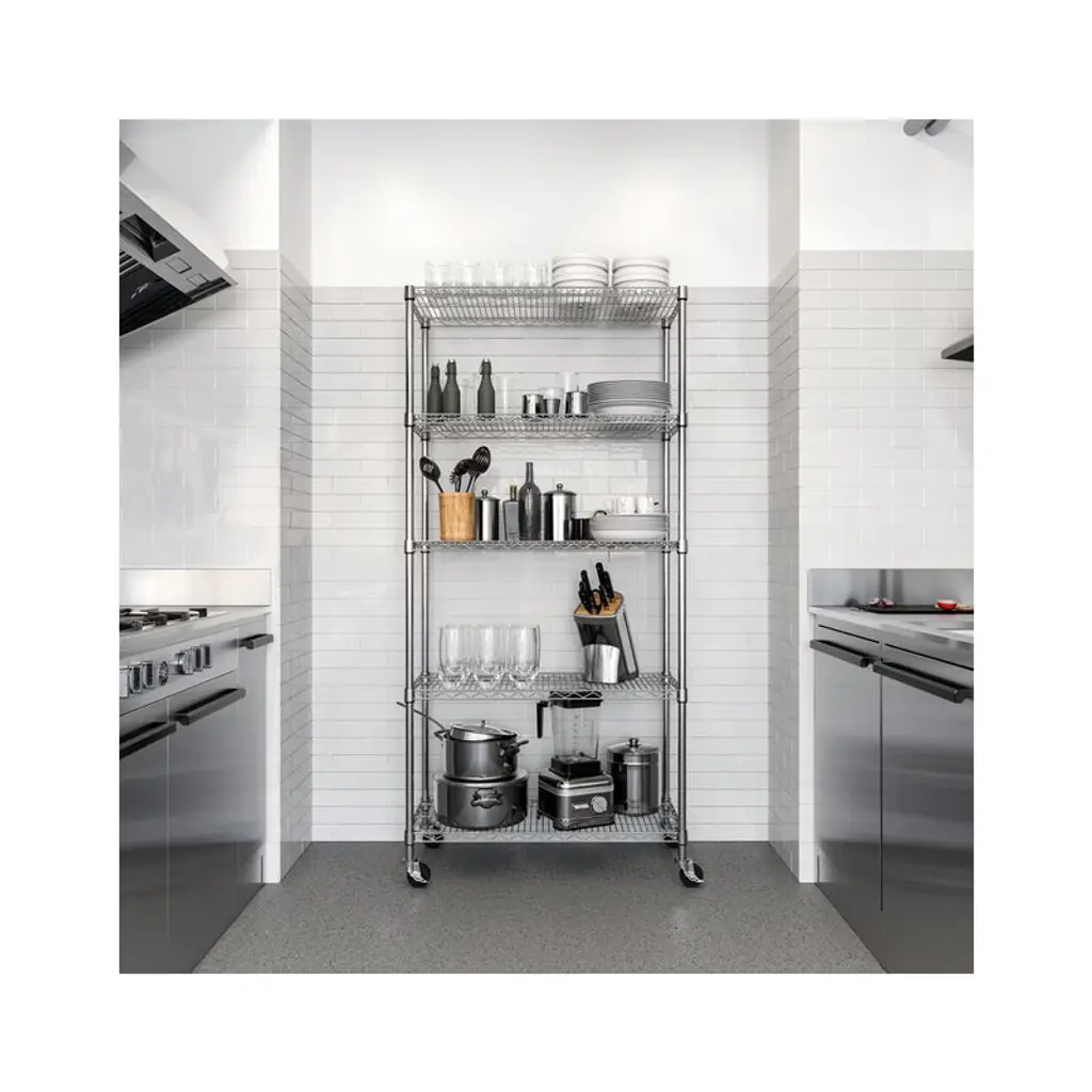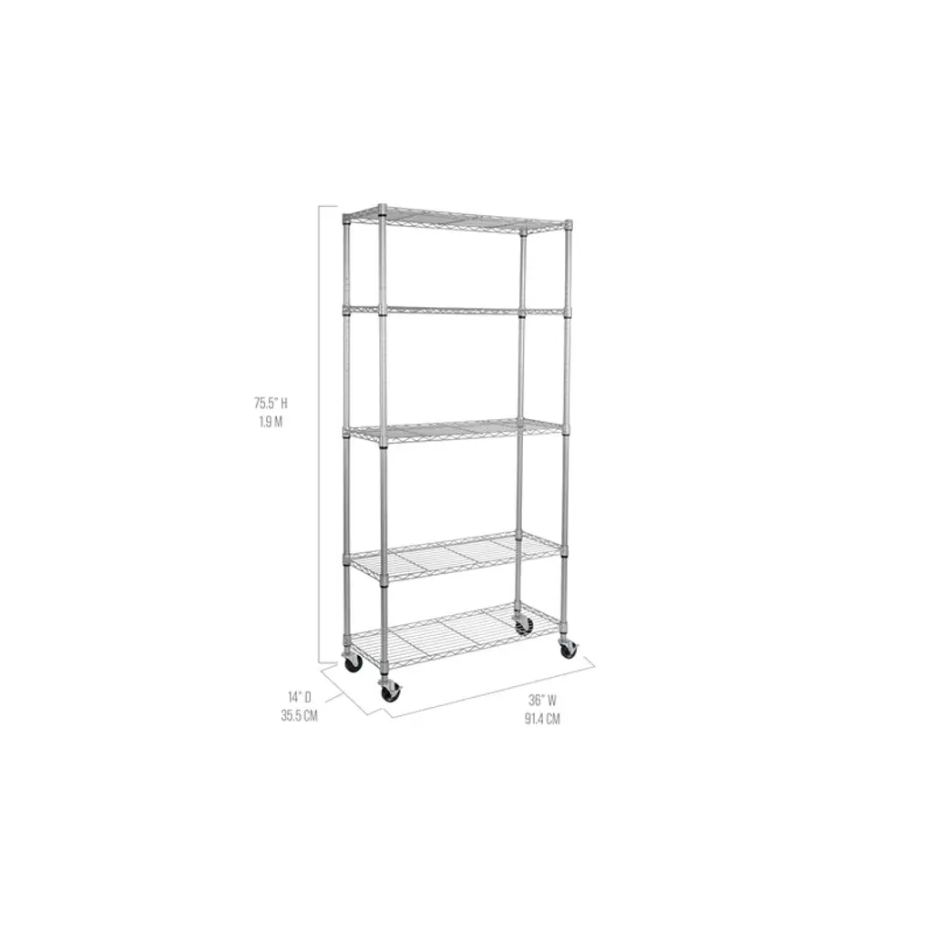 Organize any space with Seville Classics UltraDurable 5-Tier Commercial-Grade NSF-Certified Steel Wire Shelving System. This heavy-duty shelving is constructed from industrial-strength steel and measures 36" wide by 14" deep by and 76" high fully assembled on wheels (72" high on leveling feet). The 5 shelves and 4 poles are plated steel for protection against corrosion in dry environments. Shelves are adjustable in 1" increments. Includes four 4" heavy-duty rubber wheels and four adjustable leveling feet. NSF Certified - NSF/ANSI Standard 2 - Food Equipment for commercial and restaurant use. This shelving system can store up to 300 lbs. per shelf on leveling feet (1,500 lbs. total). On wheels this shelving system can store up to 500 lbs. per shelf. No tools are required for assembly.