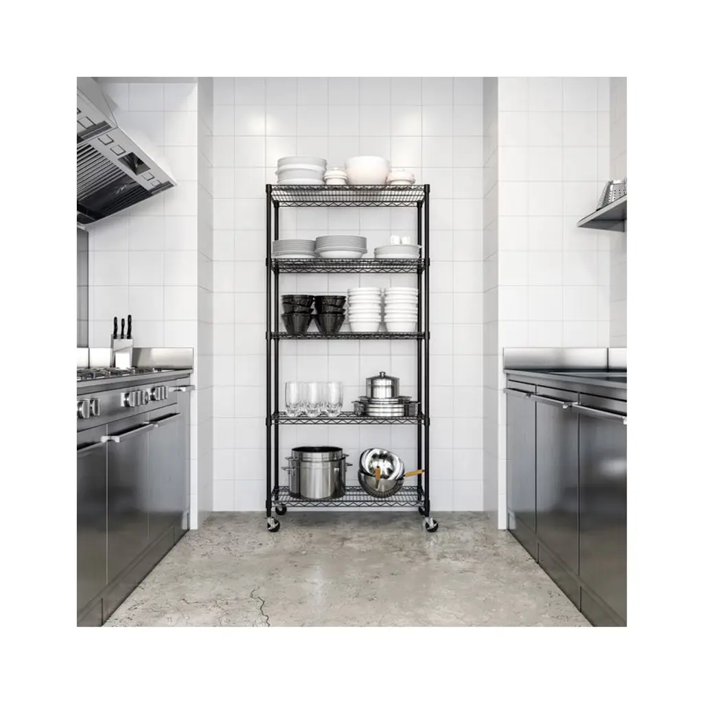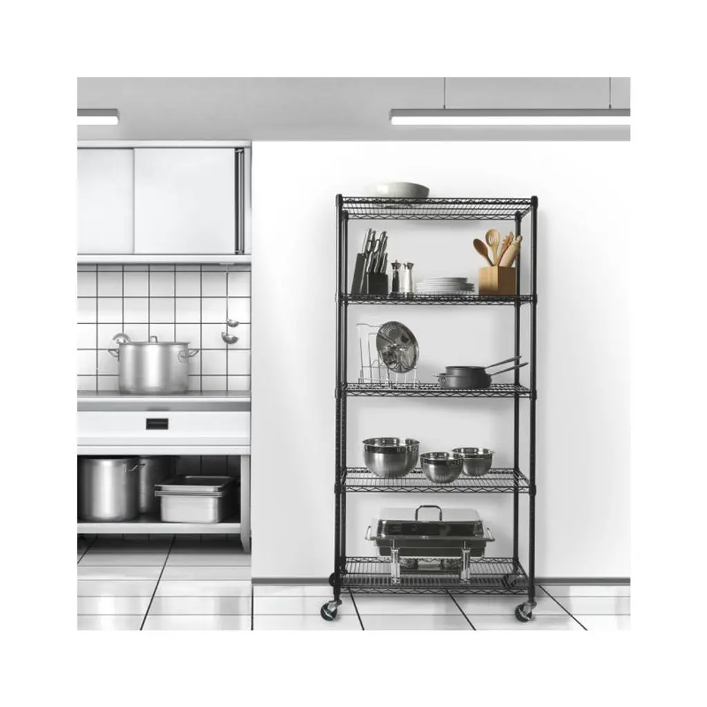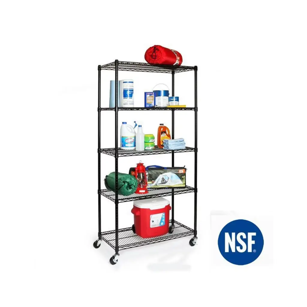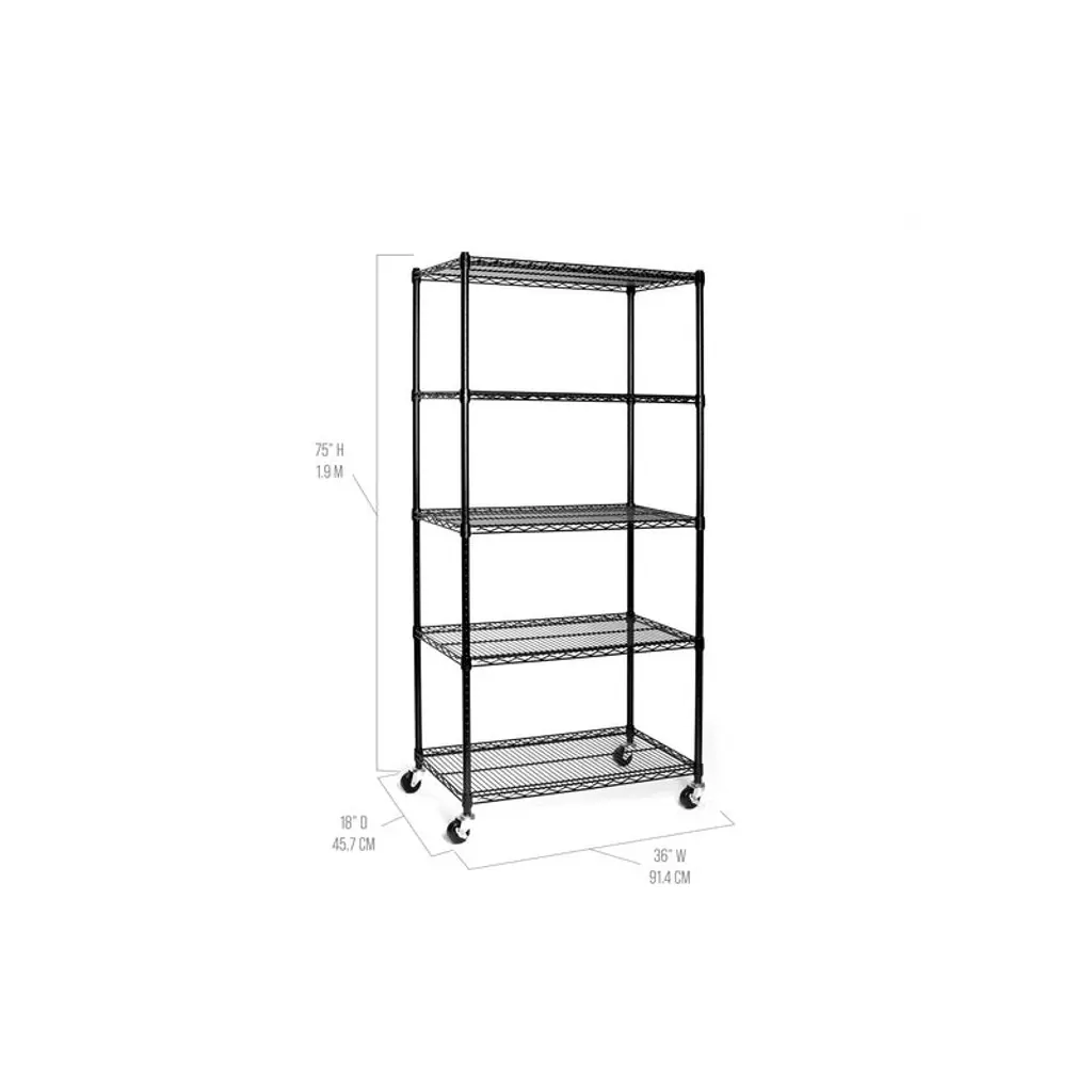 Organize any space with Seville Classics UltraDurable(R) 5-Tier Commercial-Grade NSF-Certified Steel Wire Shelving System. This heavy-duty shelving is constructed from industrial-strength steel and measures 36" wide by 18" deep by and 75" high fully assembled on wheels (72" high on leveling feet). The 5 shelves and 4 poles are coated in a durable epoxy finish for protection against corrosion in dry environments. Shelves are adjustable in 1" increments. Includes four 3" heavy-duty rubber wheels and four adjustable leveling feet. NSF Certified - NSF/ANSI Standard 2 - Food Equipment for commercial and restaurant use. This shelving system can store up to 800 lbs. per shelf on leveling feet (4,000 lbs. total). On wheels this shelving system can store up to 500 lbs. total. No tools are required for assembly.