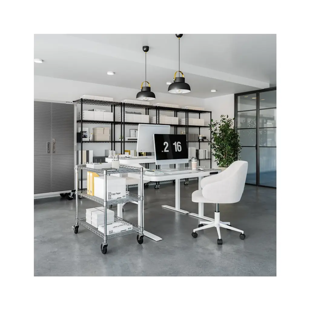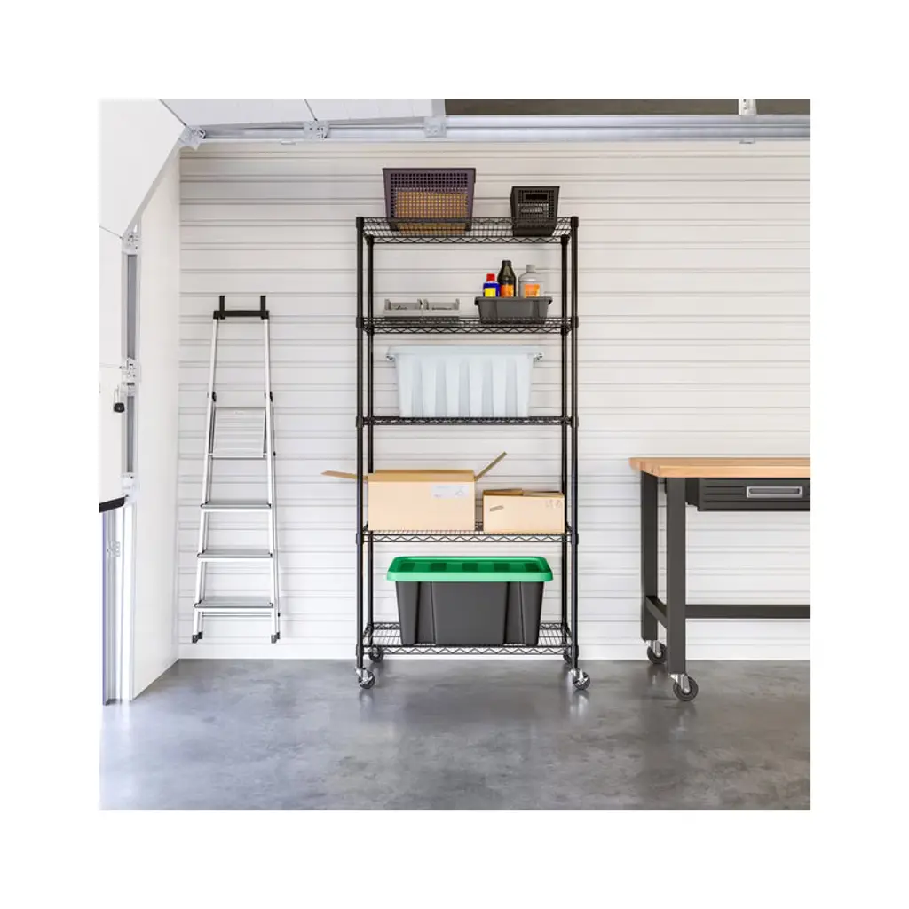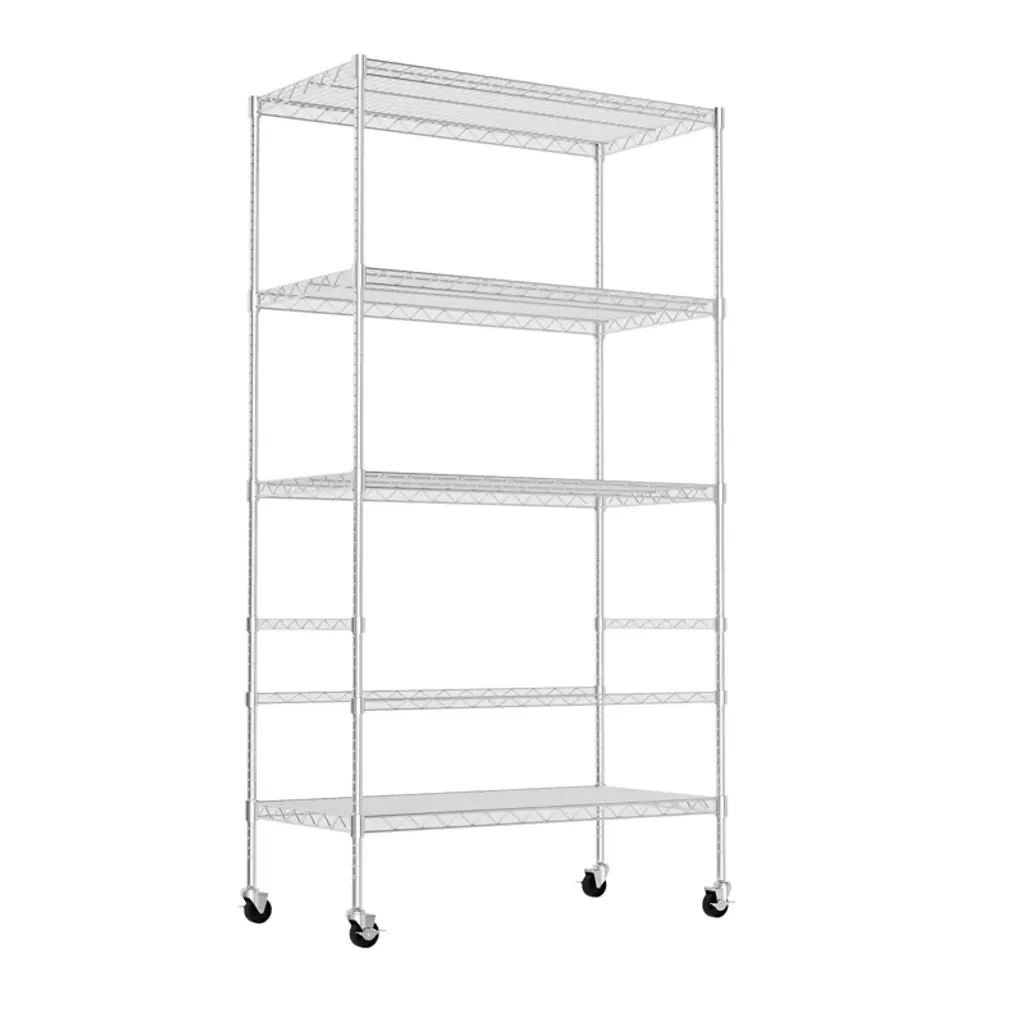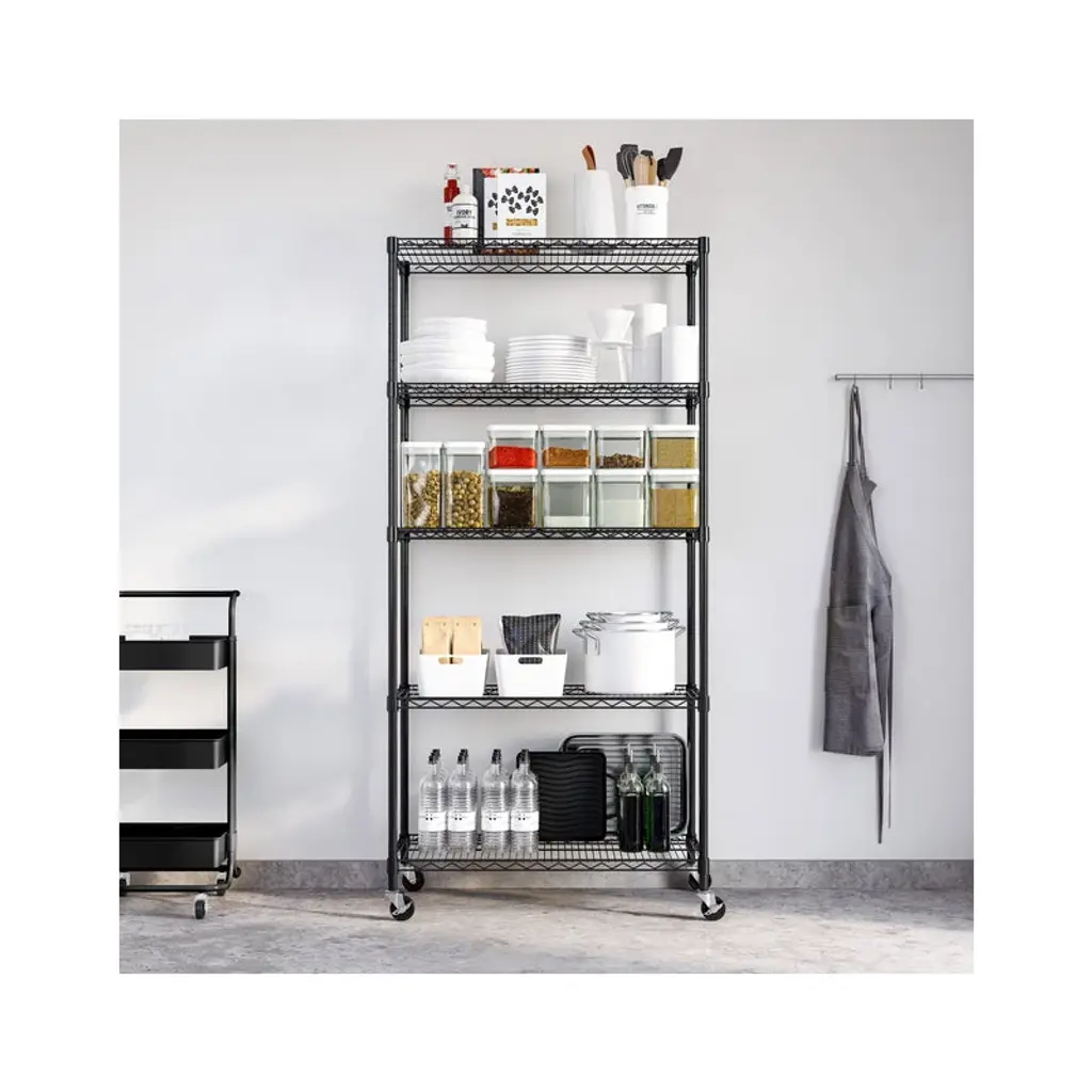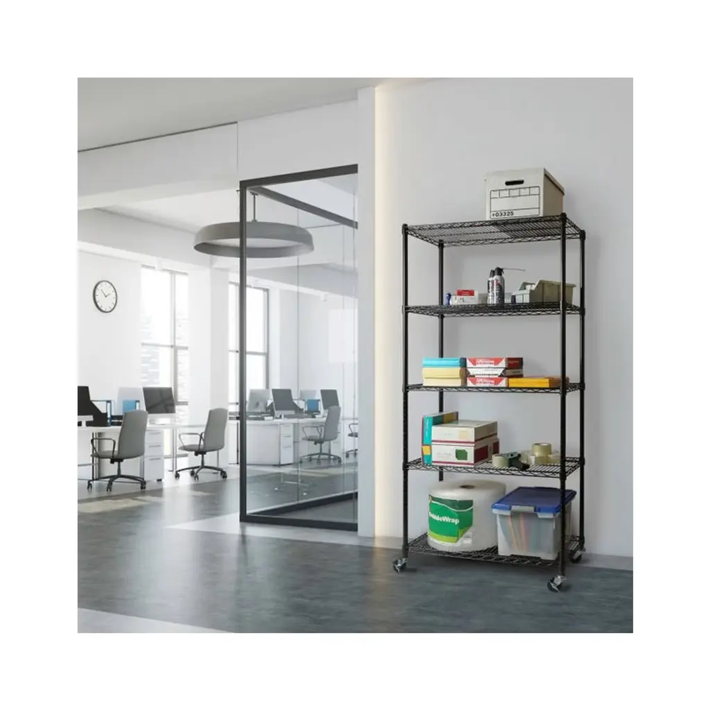 Organize any space with Seville Classics UltraDurable(R) 5-Tier Commercial-Grade NSF-Certified Steel Wire Shelving System. This heavy-duty shelving is constructed from industrial-strength steel and measures 36" wide by 18" deep by and 75" high fully assembled on wheels (72" high on leveling feet). The 5 shelves and 4 poles are coated in a durable epoxy finish for protection against corrosion in dry environments. Shelves are adjustable in 1" increments. Includes four 3" heavy-duty rubber wheels and four adjustable leveling feet. NSF Certified - NSF/ANSI Standard 2 - Food Equipment for commercial and restaurant use. This shelving system can store up to 800 lbs. per shelf on leveling feet (4,000 lbs. total). On wheels this shelving system can store up to 500 lbs. total. No tools are required for assembly.