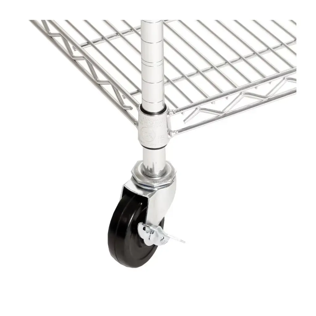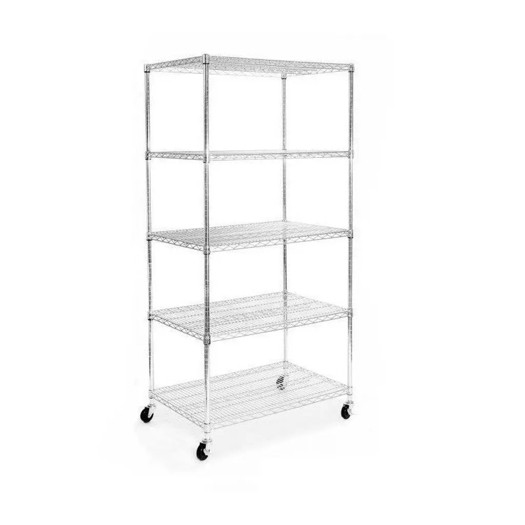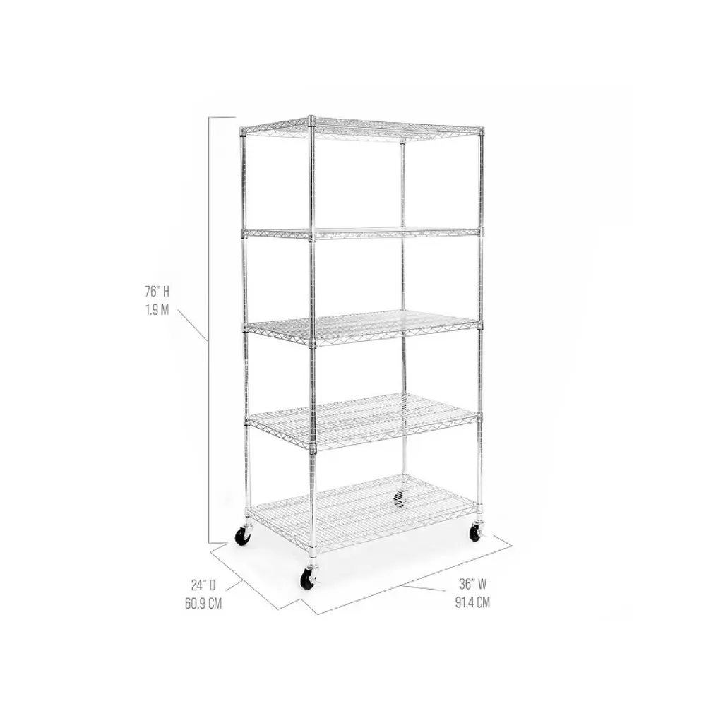 Organize any space with Seville Classics UltraDurable 5-Tier Commercial-Grade NSF-Certified Steel Wire Shelving System. This heavy-duty shelving is constructed from industrial-strength steel and measures 36 in. wide by 24 in. deep by and 75 in. high fully assembled on wheels (72 in. high on leveling feet). The 5 shelves and 4 poles are plated steel for protection against corrosion in dry environments. Shelves are adjustable in 1 in. increments. Includes four 3 in. heavy-duty rubber wheels and four adjustable leveling feet. NSF Certified - NSF/ANSI Standard 2 - Food Equipment for commercial and restaurant use. This shelving system can store up to 800 lbs. per shelf on leveling feet (4,000 lbs. total). On wheels this shelving system can store up to 500 lbs. total. No tools are required for assembly.