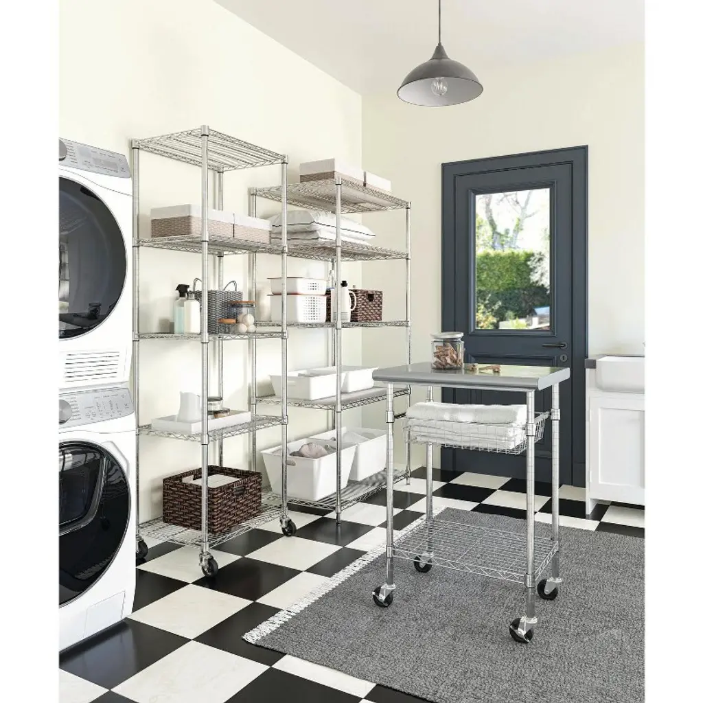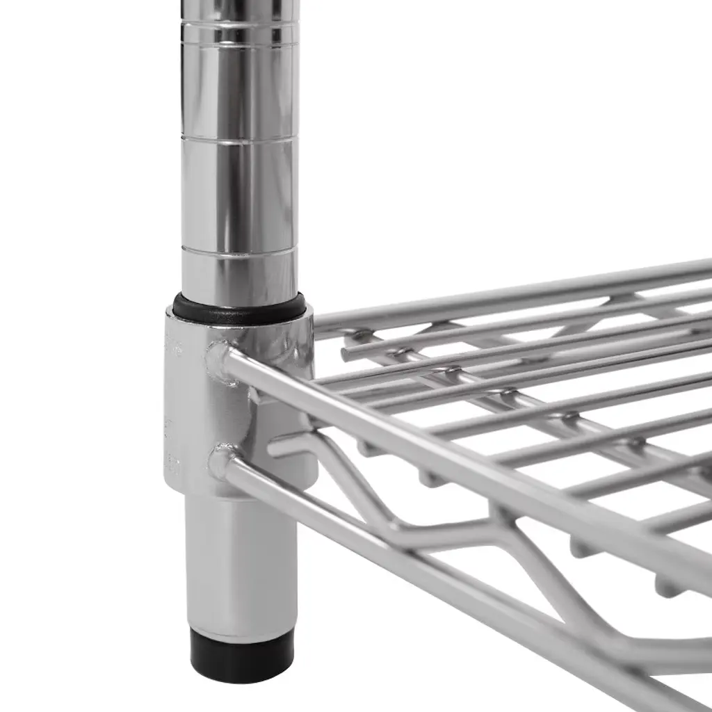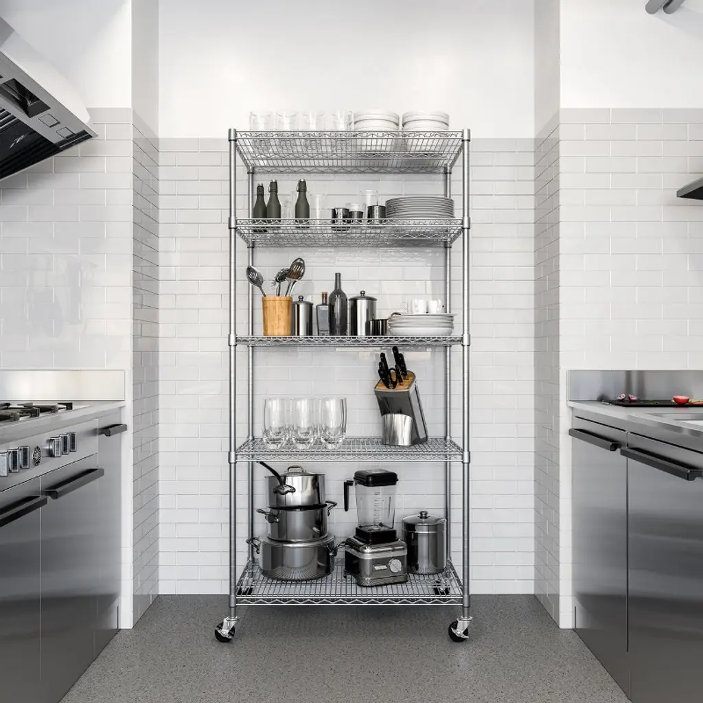Organize any space with Seville Classics UltraDurable 5-Tier Commercial-Grade NSF-Certified Steel Wire Shelving System. This heavy-duty shelving is constructed from industrial-strength steel and measures 36 in. wide by 24 in. deep by and 75 in. high fully assembled on wheels (72 in. high on leveling feet). The 5 shelves and 4 poles are plated steel for protection against corrosion in dry environments. Shelves are adjustable in 1 in. increments. Includes four 3 in. heavy-duty rubber wheels and four adjustable leveling feet. NSF Certified - NSF/ANSI Standard 2 - Food Equipment for commercial and restaurant use. This shelving system can store up to 800 lbs. per shelf on leveling feet (4,000 lbs. total). On wheels this shelving system can store up to 500 lbs. total. No tools are required for assembly.