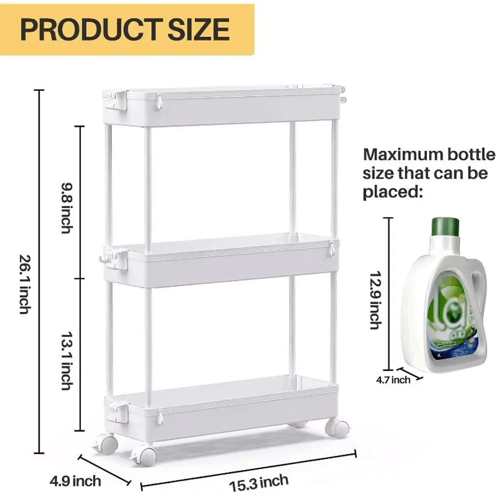 Slim 3-Tier Rolling Cart – Just 4.9" wide to slide into tight spots in kitchen, bath, laundry or office. 360° locking wheels for smooth, stable moves. Removable shelves and 3 side hooks add flexible storage. Durable plastic design installs in minutes to keep any space neat and organized. Shelf Type: Tiered Shelf Frame Material: Plastic Number Of Shelves: 3 Item Dimensions D x W x H: 4.9"D x 15.3"W x 26.1"H Product Care Instructions: Wipe with Dry Cloth Maximum Weight Recommendation: 44 Pounds