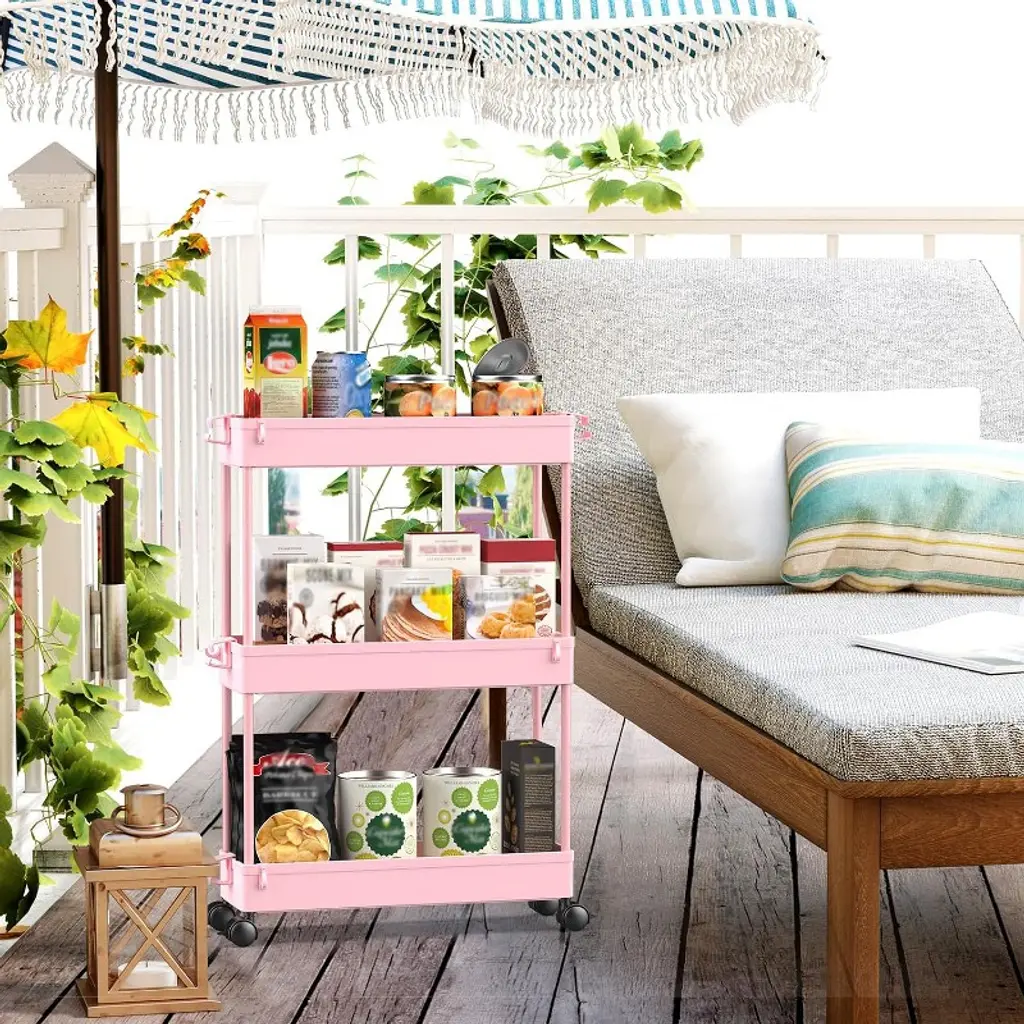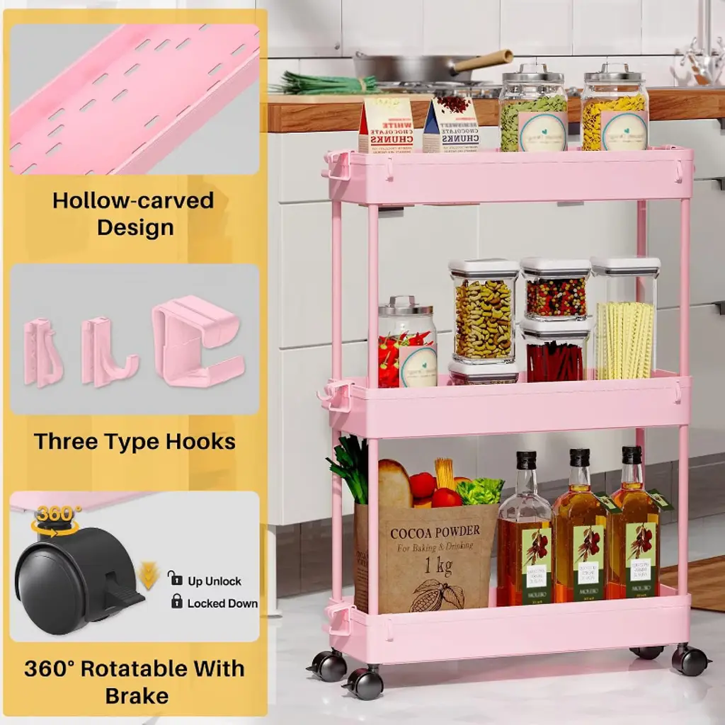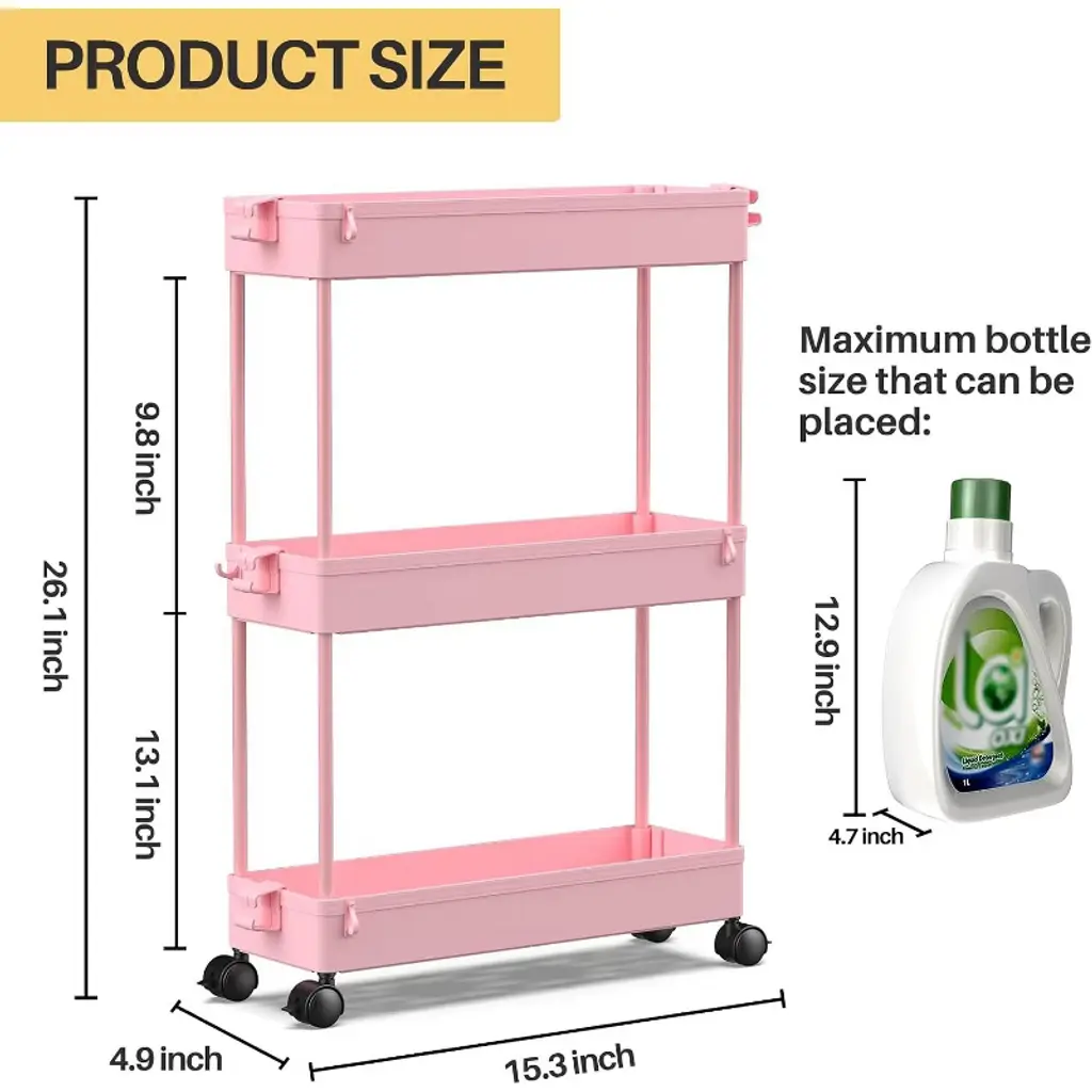 Slim 3-Tier Rolling Cart – Just 4.9" wide to slide into tight spots in kitchen, bath, laundry or office. 360° locking wheels for smooth, stable moves. Removable shelves and 3 side hooks add flexible storage. Durable plastic design installs in minutes to keep any space neat and organized. Shelf Type: Tiered Shelf Frame Material: Plastic Number Of Shelves: 3 Item Dimensions D x W x H: 4.9"D x 15.3"W x 26.1"H Product Care Instructions: Wipe with Dry Cloth Maximum Weight Recommendation: 44 Pounds