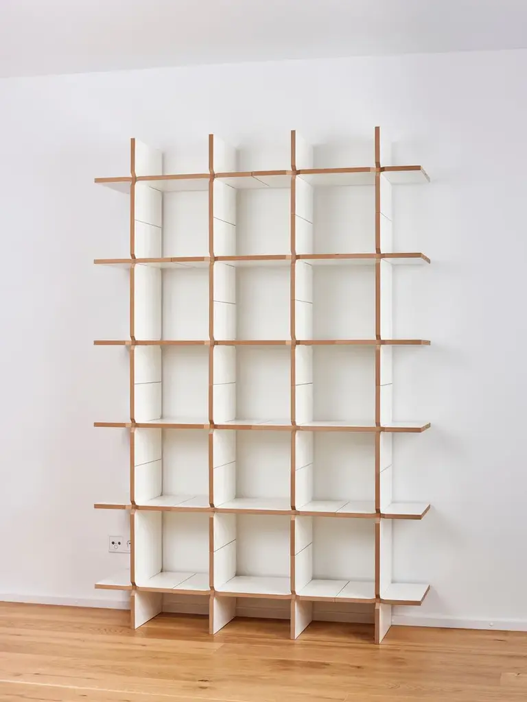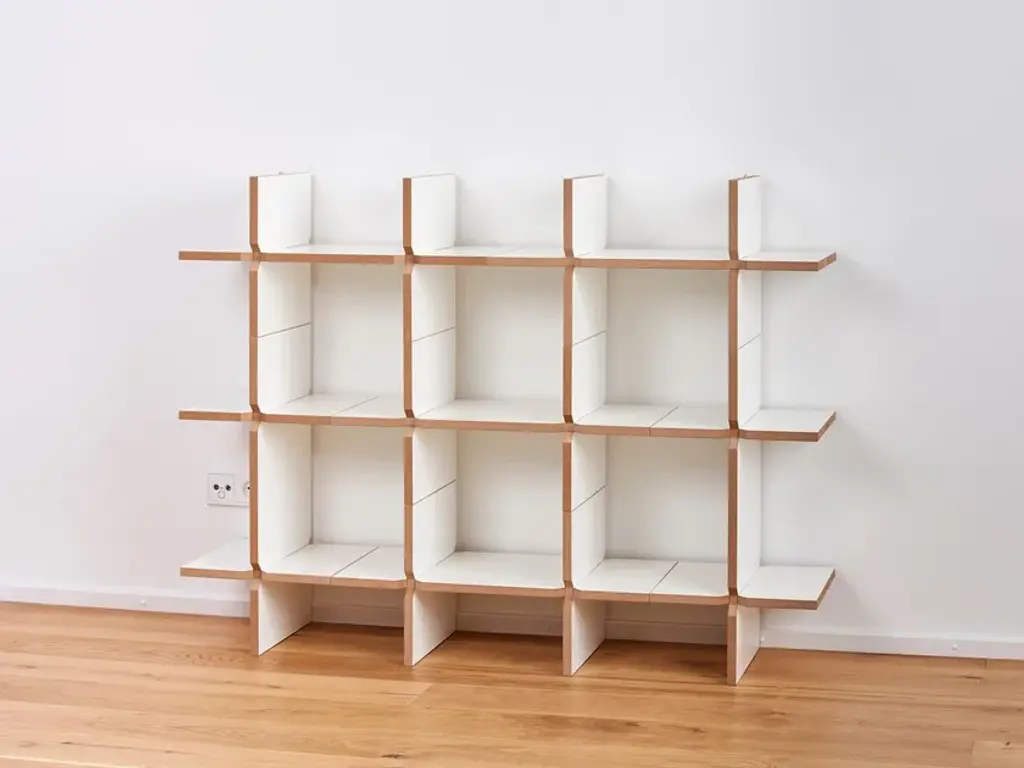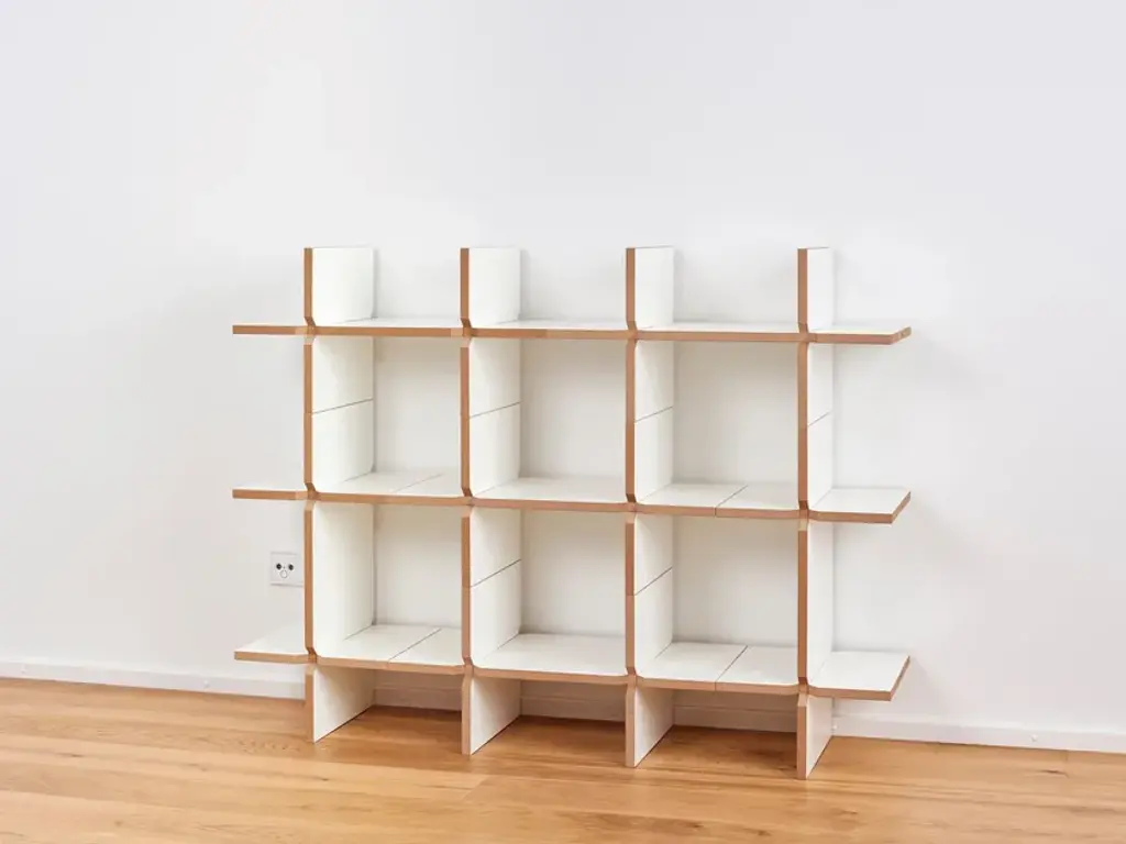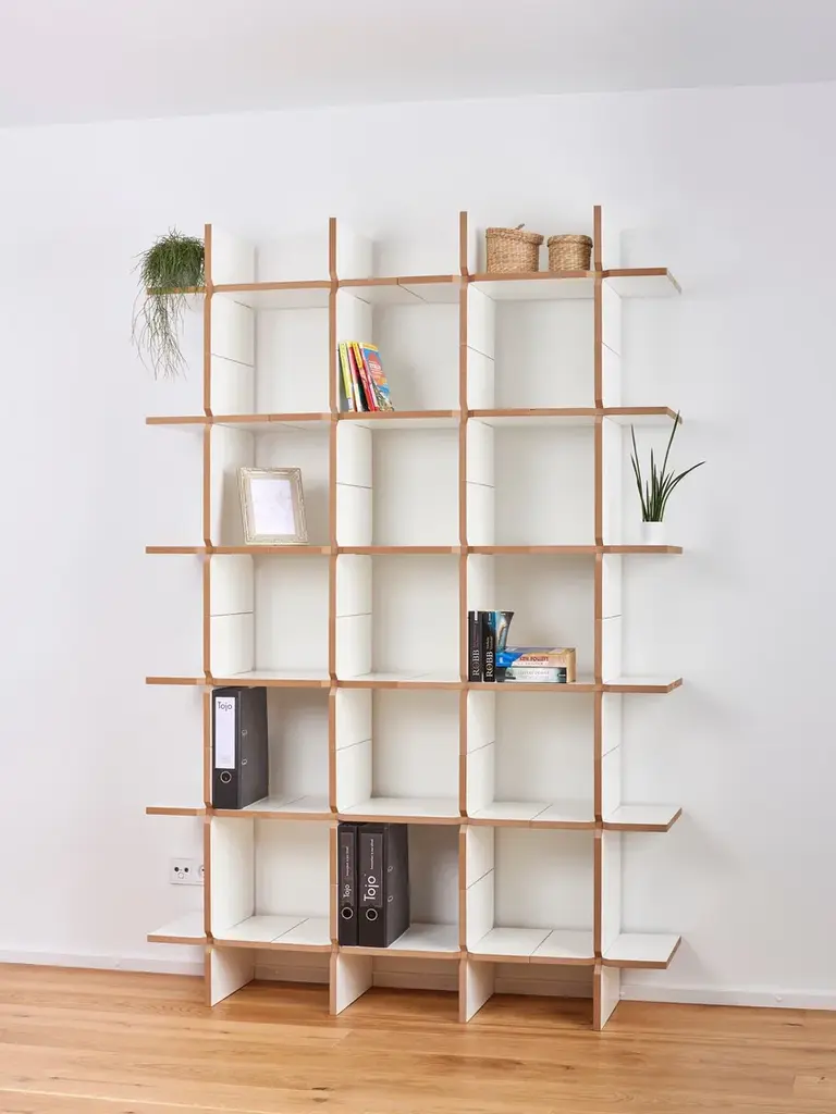 Tojo SOLO is a building block (w: 70 cm, h: 35 cm) from which different sizes of an individual shelf can be assembled as desired. Without tools, solid structures are created in different heights and widths. The elements are simply inserted horizontally and vertically, creating a stable unit. The combination options of Tojo SOLO are determined by the number of blocks and are expandable if necessary.
