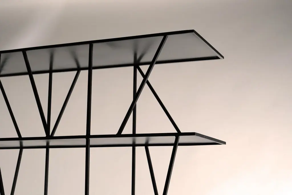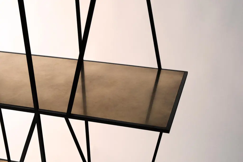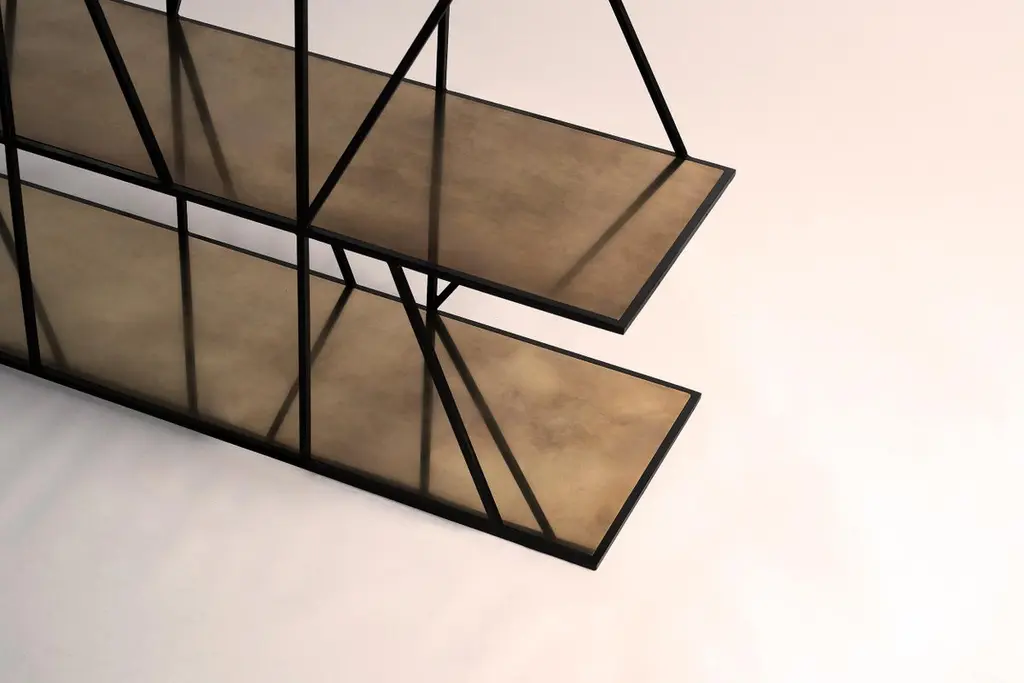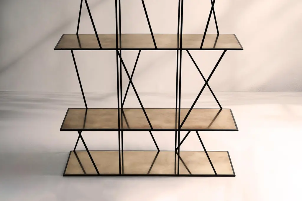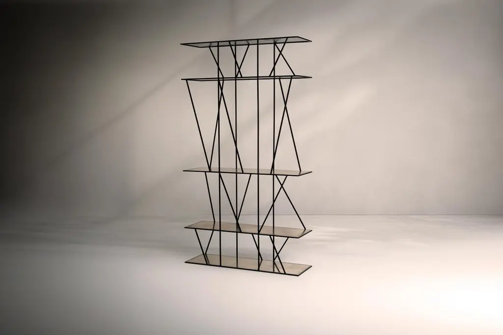 A shelving unit in blackened steel, inspired by the structures of Victorian industrial relics in the River Tyne. Hand crafted in the North to order. Custom sizes and finishes are available.Measures: 120cm (width) x 200cm (height) x 35cm (depth).Custom sizes available.Made to order in 12 weeks.Price excludes VAT.