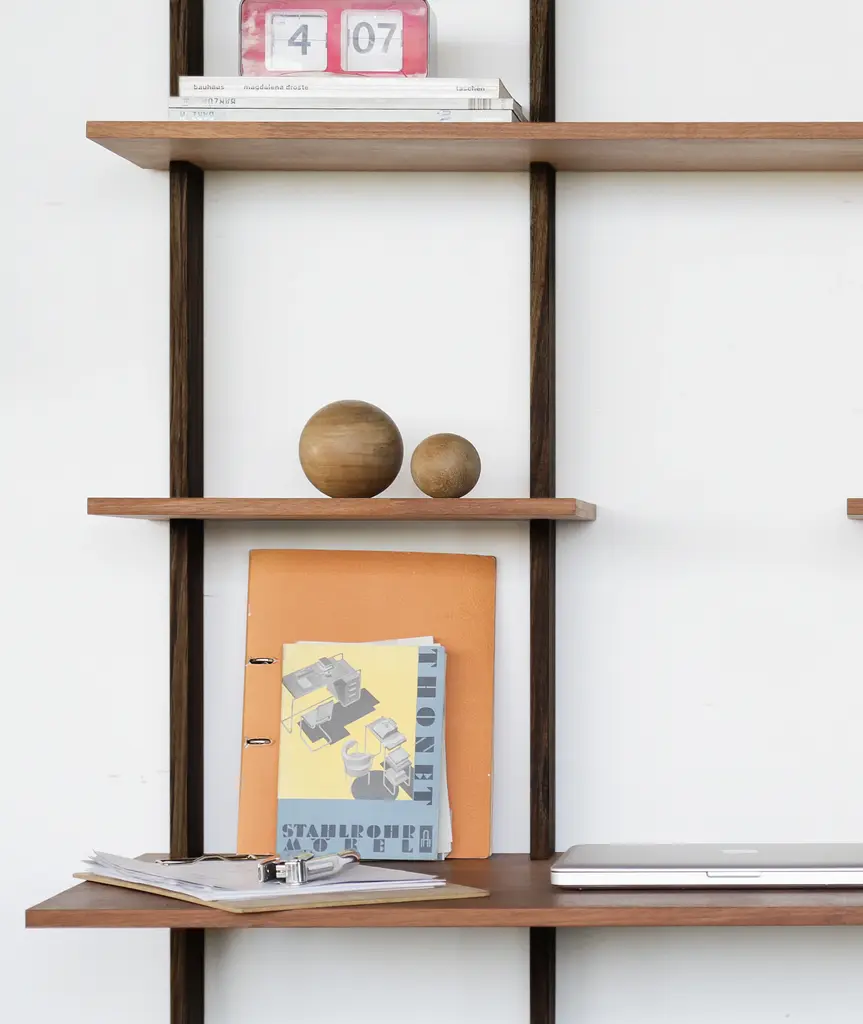 The Sticotti bookshelf is an ingenious, one-of-a-kind wooden modular shelving system that hangs from a single wall-mounted bracket. The shelves join together with a precise interlocking system and can be customized to fit any space by combining bracket systems and adding more shelves, making the possibilities endless.