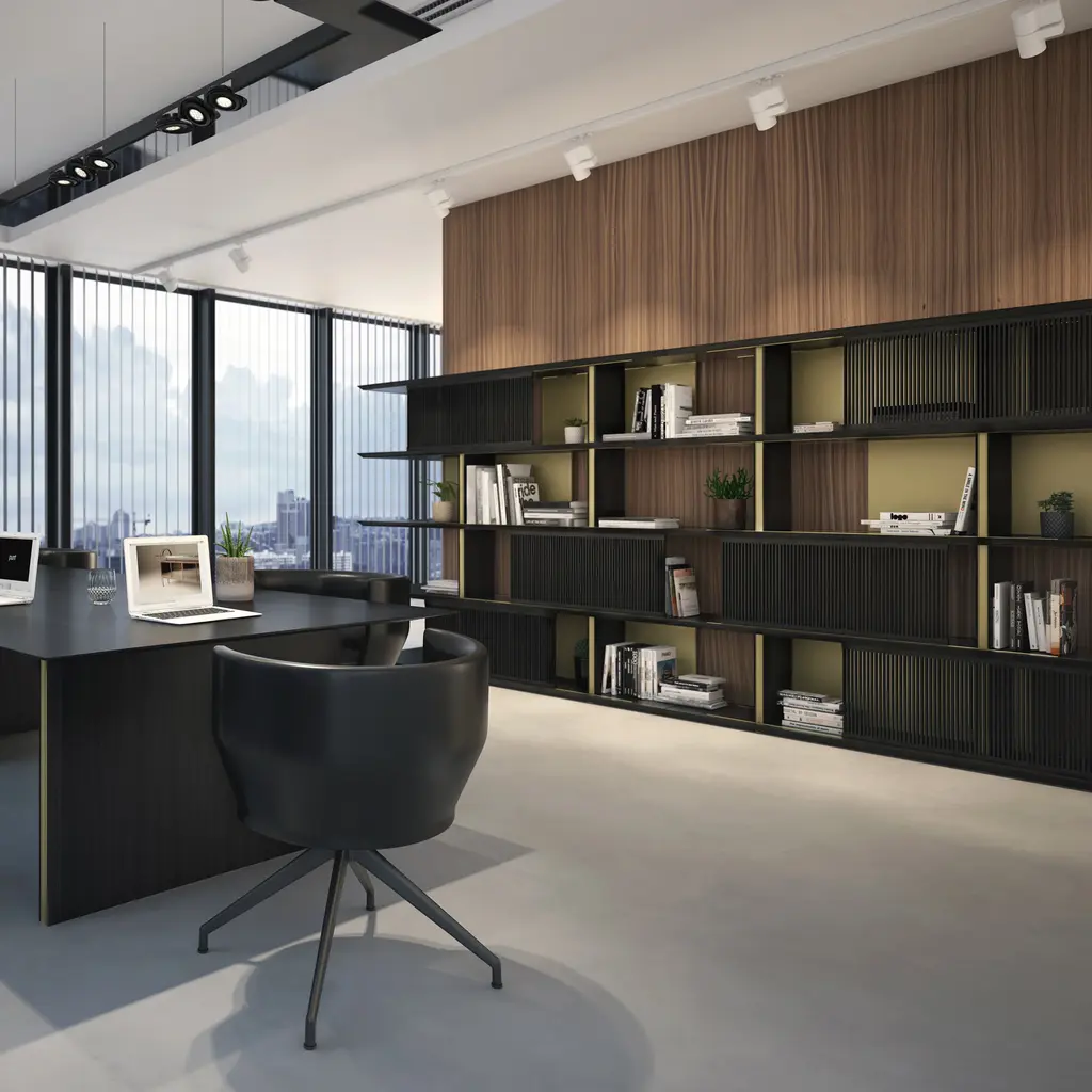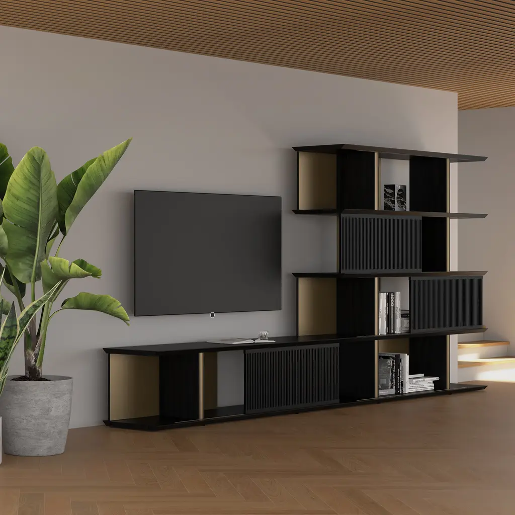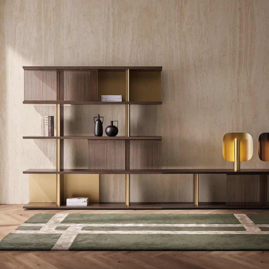This shelving unit doors inspiration from the Stockholm sideboard is crafted in aluminum, oak, and walnut finishes and features optional sliding panels, sold separately, that fit seamlessly onto the shelf. These panels provide a flexible mix of open and hidden storage while creating a play of light and shadow. Ideal for spaces like living rooms or offices, it merges adaptability with thoughtful design.