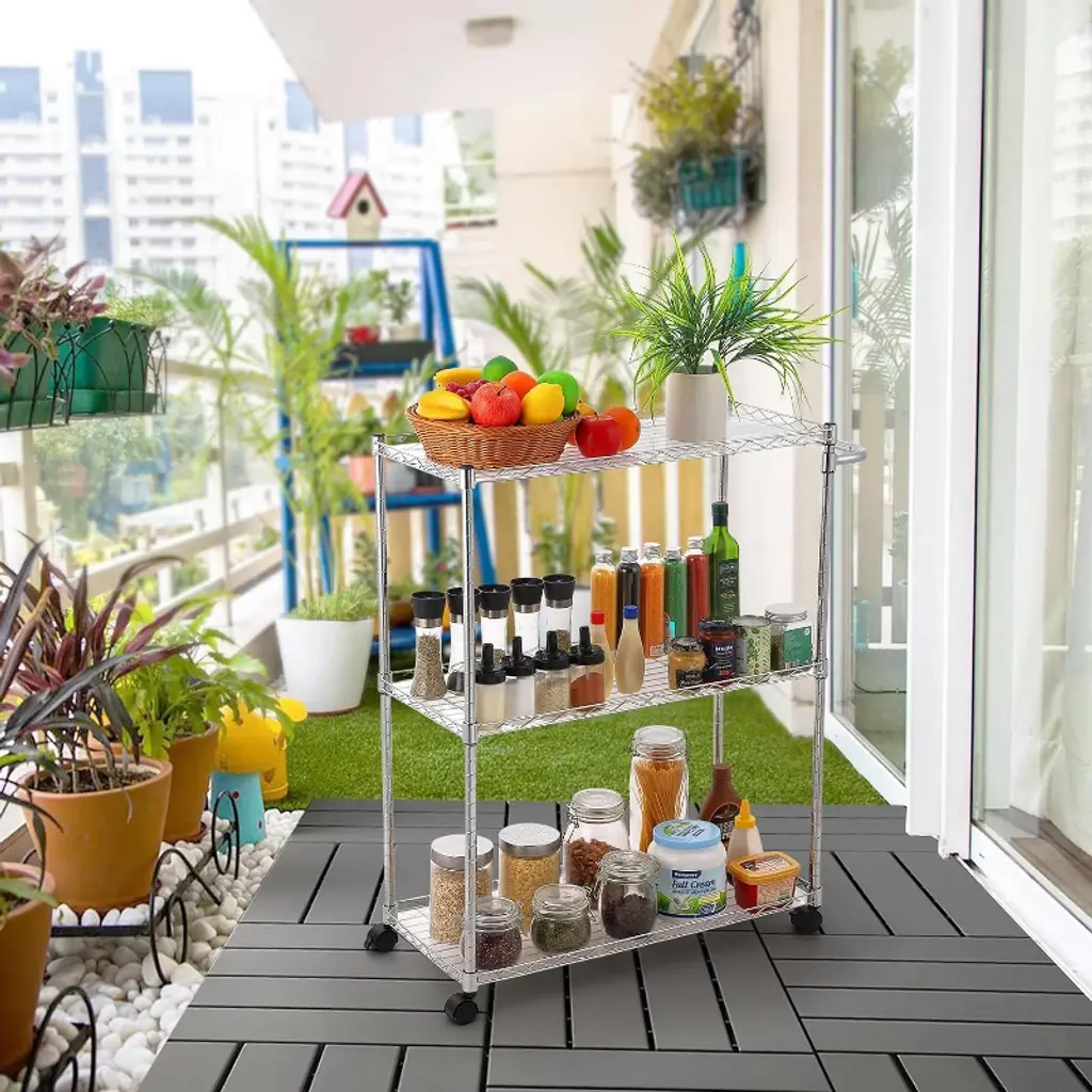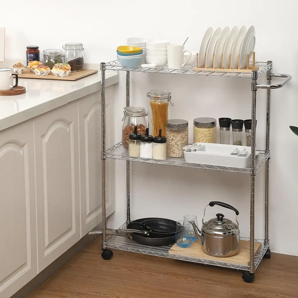 Military-Grade Chrome Corrosion DefenseTriple-layer electroplated chrome coating (15¦Ìm) exceeds ASTM B117 salt-spray standards, providing 10X enhanced rust resistance vs. epoxy finishes. Ideal for humid bathrooms/garages where chemical cleaners accelerate oxidation. The polished surface repels oil stains for effortless wiping. Industrial 12-Gauge Steel Wire ShelvingReinforced 4mm-thick steel wire grids (1"x1" mesh) support 50 lbs/shelf (150 lbs total) without sagging¡ªtested with toolboxes, motor oil cases, or laundry stacks. Open design enables 360¡ã airflow to dry wet items 65% faster than solid shelves. Precision Mobility & Stability SystemTwo 3" 360¡ã swivel casters + two rigid wheels with PU non-marking treads. Locking brakes withstand 20¡ã inclines on epoxy floors. Low-center gravity design prevents tipping when moving 120+ lbs loads. Wheelbase clearance (2.8") clears door thresholds effortlessly. Space-Optimized Compact DimensionsFits tight 14" gaps (e.g., between washer/dryer or under sinks) with 29.53"x13.78" footprint. Adjustable height (29.5"-35.4") via 1-inch increment pins accommodates stacked appliances. Slim profile increases storage density by 40% in apartments vs. standard 18" carts. Tool-Free 90-Second Assembly & Multi-Scene UsePatented snap-lock connectors assemble shelves/handle in <2 minutes¡ªno screws or tools. Used for: Laundry: Folded clothes + detergent organization Garage: Oil bottles/tool storage (IP54 liquid-resistant) Retail: Backstock rotation cart
