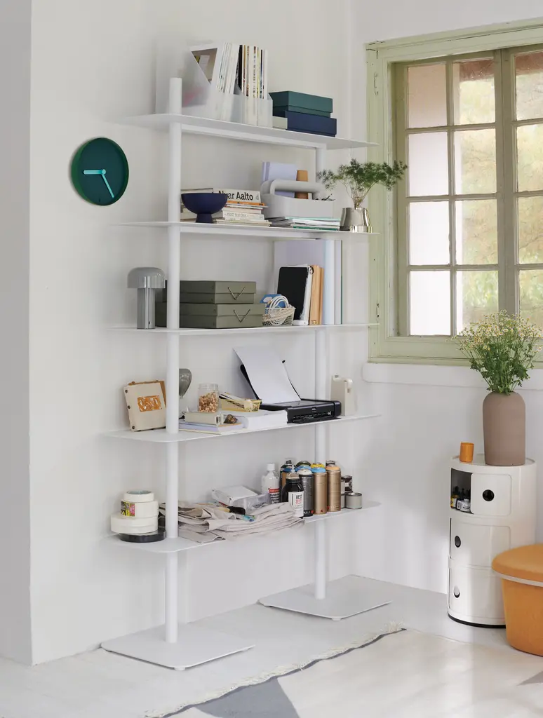 A fresh addition to the Story Collection, the Story Shelving Unit (2021) features clean lines and a compact footprint for maximizing space to store and display books and accessories. Composed of two columns and five slim shelves that almost seem to float, it's crafted of sturdy powder-coated steel and aluminum. Comes with wall-mounted tip restraints. Simple assembly required; ships in multiple boxes for easy handling. Made in Taiwan.