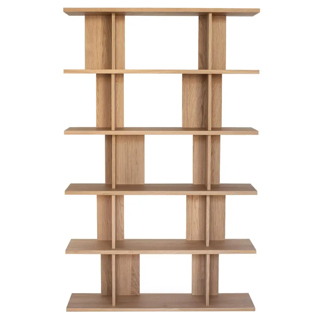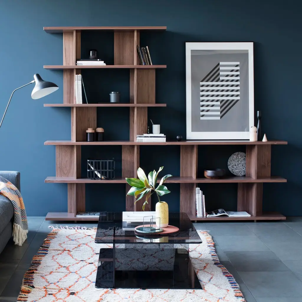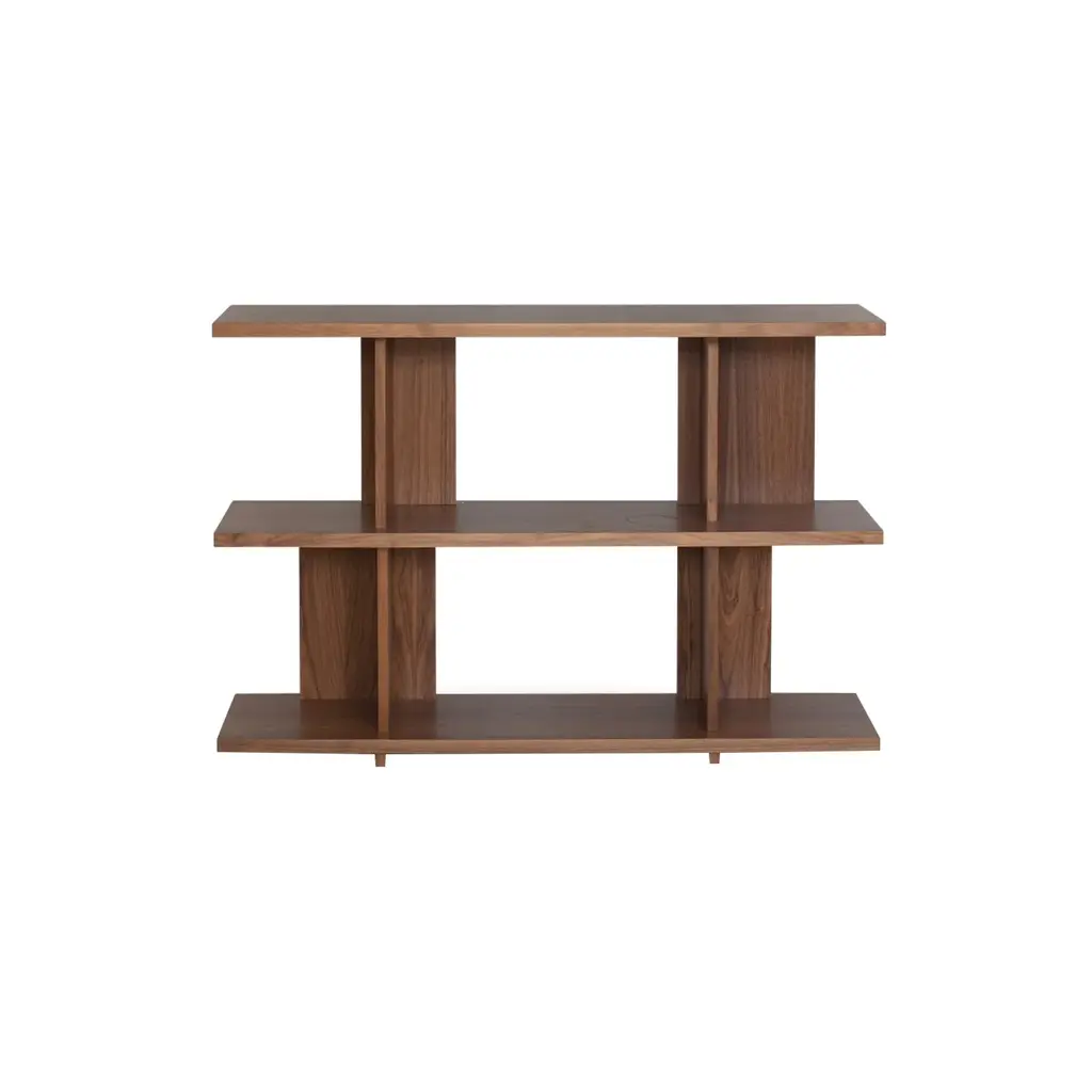 The Strata Shelving System is a modular storage solution designed for adaptability. Made from high-quality oak or walnut, each unit features staggered back panels that create a distinctive look while allowing multiple units to be connected side by side for expansion. The adjustable design supports a range of storage needs, from books to decorative items. Plastic leveling feet provide stability on uneven surfaces, ensuring a secure setup in any space.