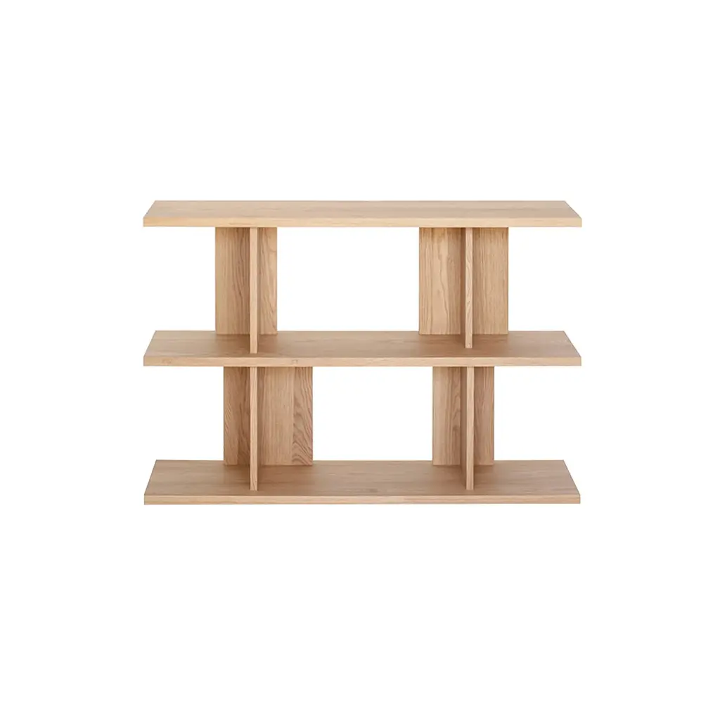 The Strata Shelving System is a modular storage solution designed for adaptability. Made from high-quality oak or walnut, each unit features staggered back panels that create a distinctive look while allowing multiple units to be connected side by side for expansion. The adjustable design supports a range of storage needs, from books to decorative items. Plastic leveling feet provide stability on uneven surfaces, ensuring a secure setup in any space.