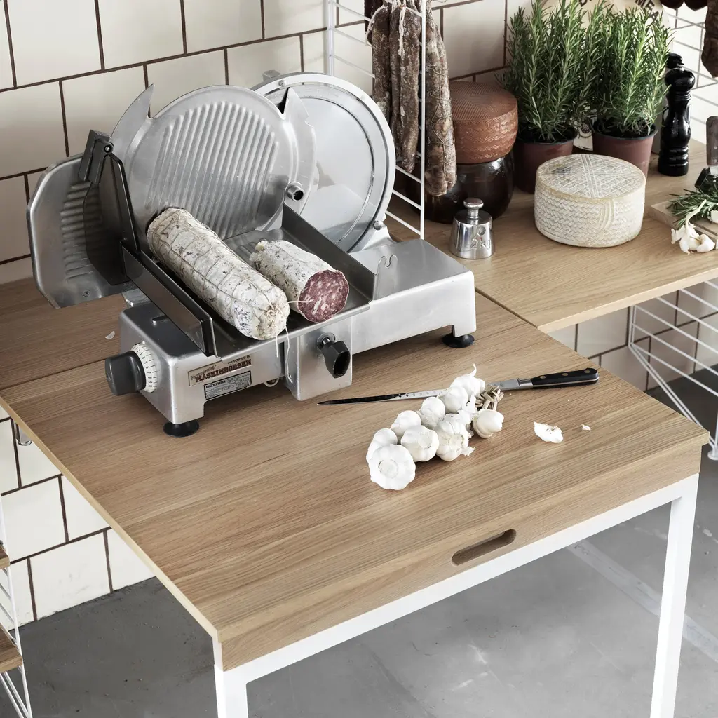 For a spur-of-the-moment work session or impromptu dining, String offers a handy folding table to integrate with a chosen shelving installation. In either lacquered solid finish or wood-grain veneer, the unit is a snap to unfold and adds to the flexibility of any living space. Sweden's design icons Nisse and Kajsa Strinning originally introduced String in 1949 and its myriad possibilities make it just as relevant today.