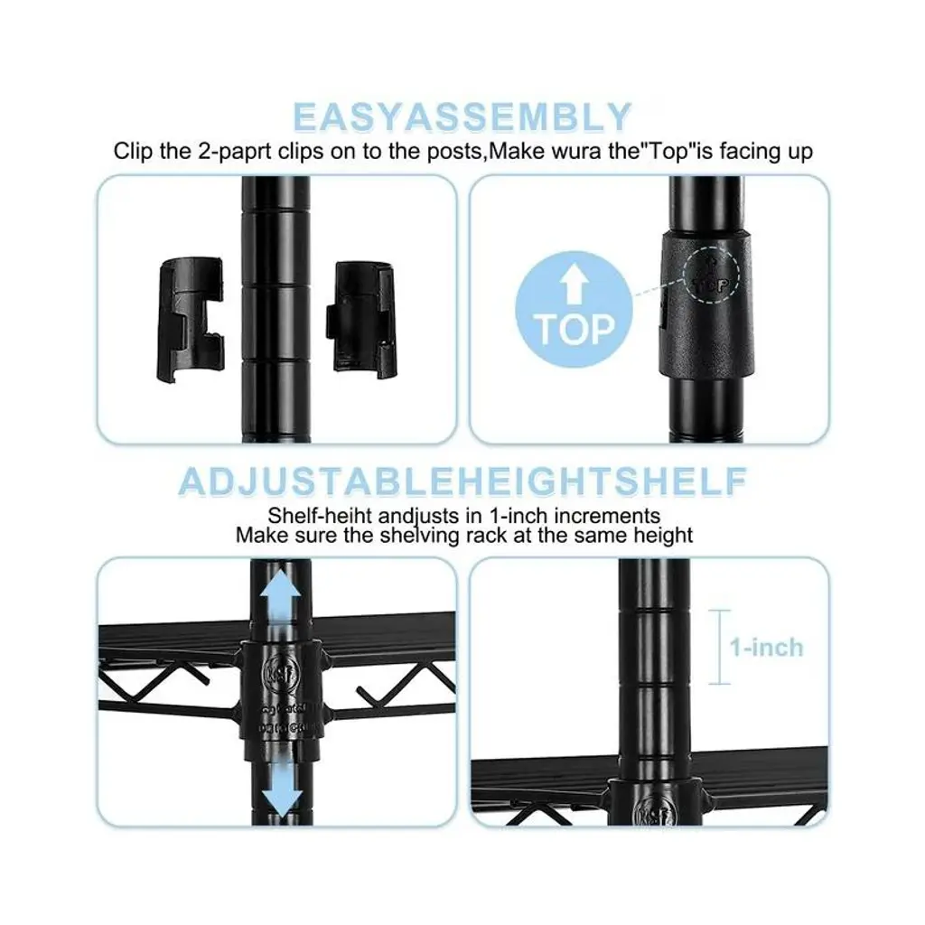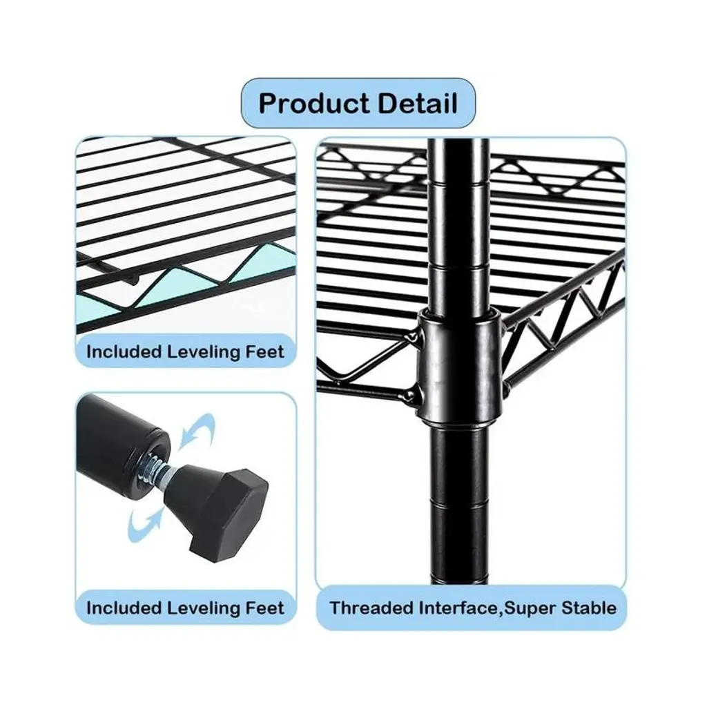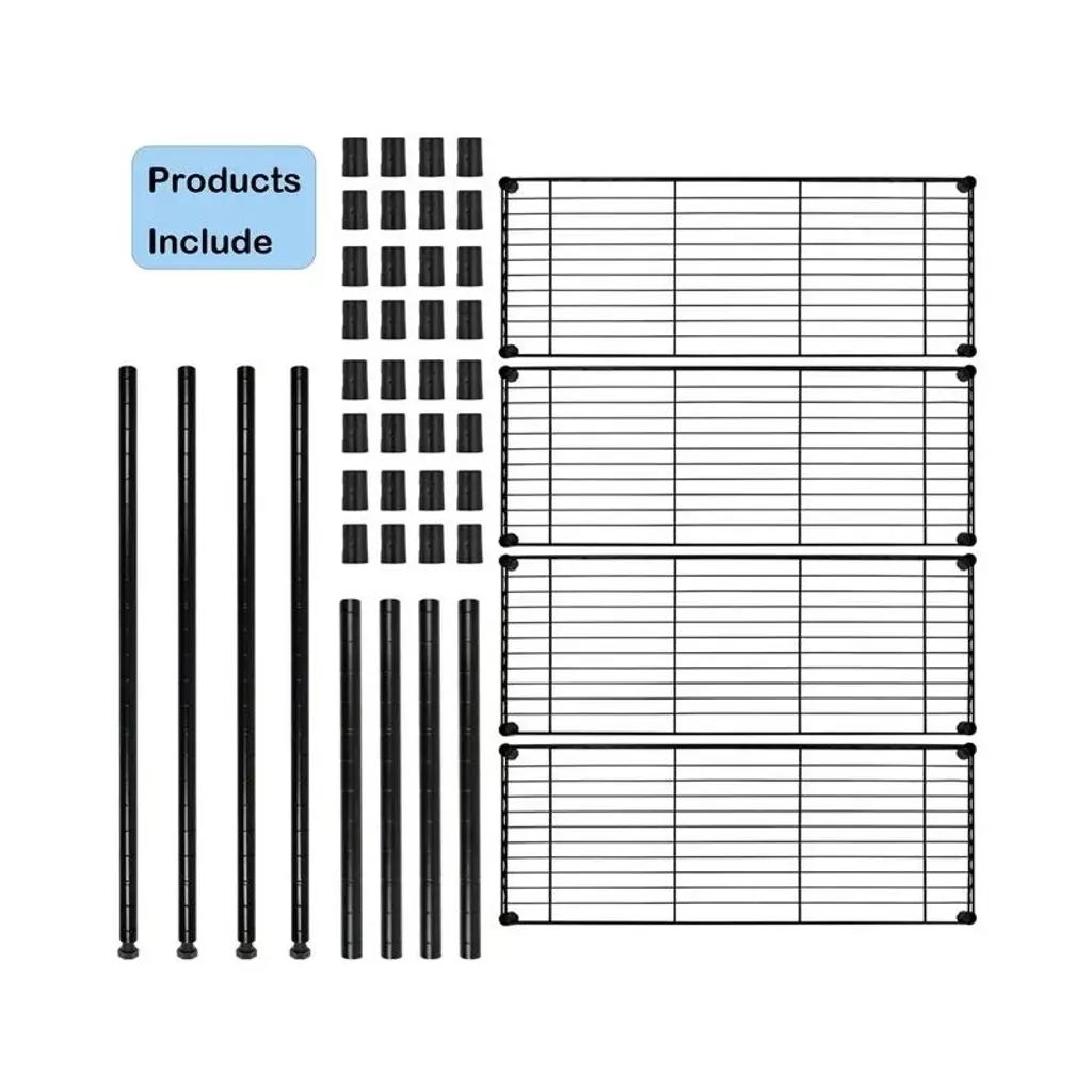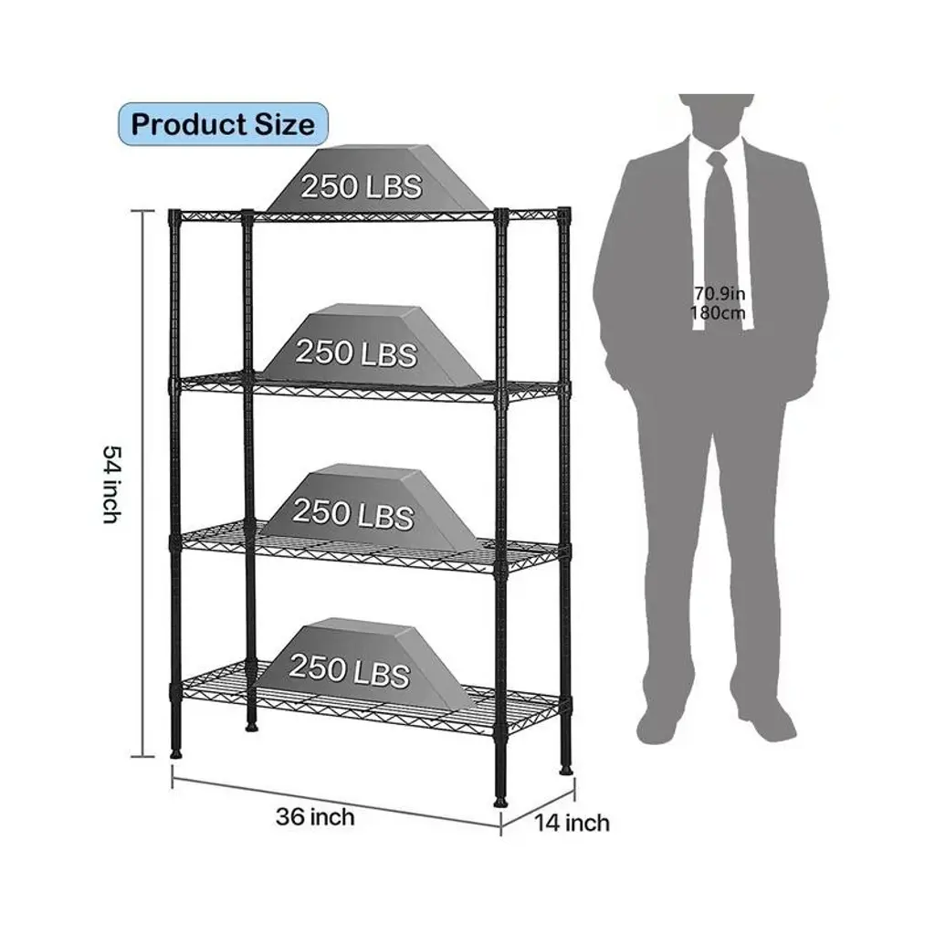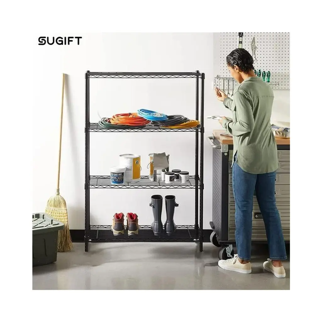 SUGIFT Tough 4-Tier Wire Shelf Unit is perfect for all your organizational needs. It has strong and durable welded wire construction in chrome color. Open wire design allows air circulation and reduces dust build-up. Shelves can be adjusted in 1-inch increments and can hold up to 250 lbs. evenly distributed. This wire shelving system is perfect for homes, offices, warehouses, restaurants and any other places you need to organize. Product Description: Tier adjustable storage Shelves Stylish wire shelving unit provide vertical space and occupy a little space, which helps keep your house tidy and orderly. Shelving unit offers remarkable strength, convenience and versatility. It is a household essential and space saver for kitchen, bedroom, bathroom, laundry room, garage, basement, office and more living space.