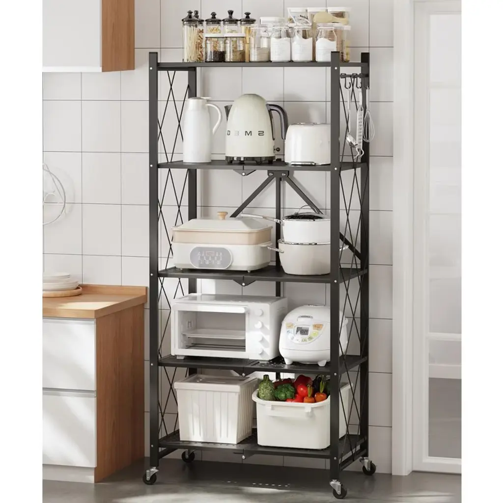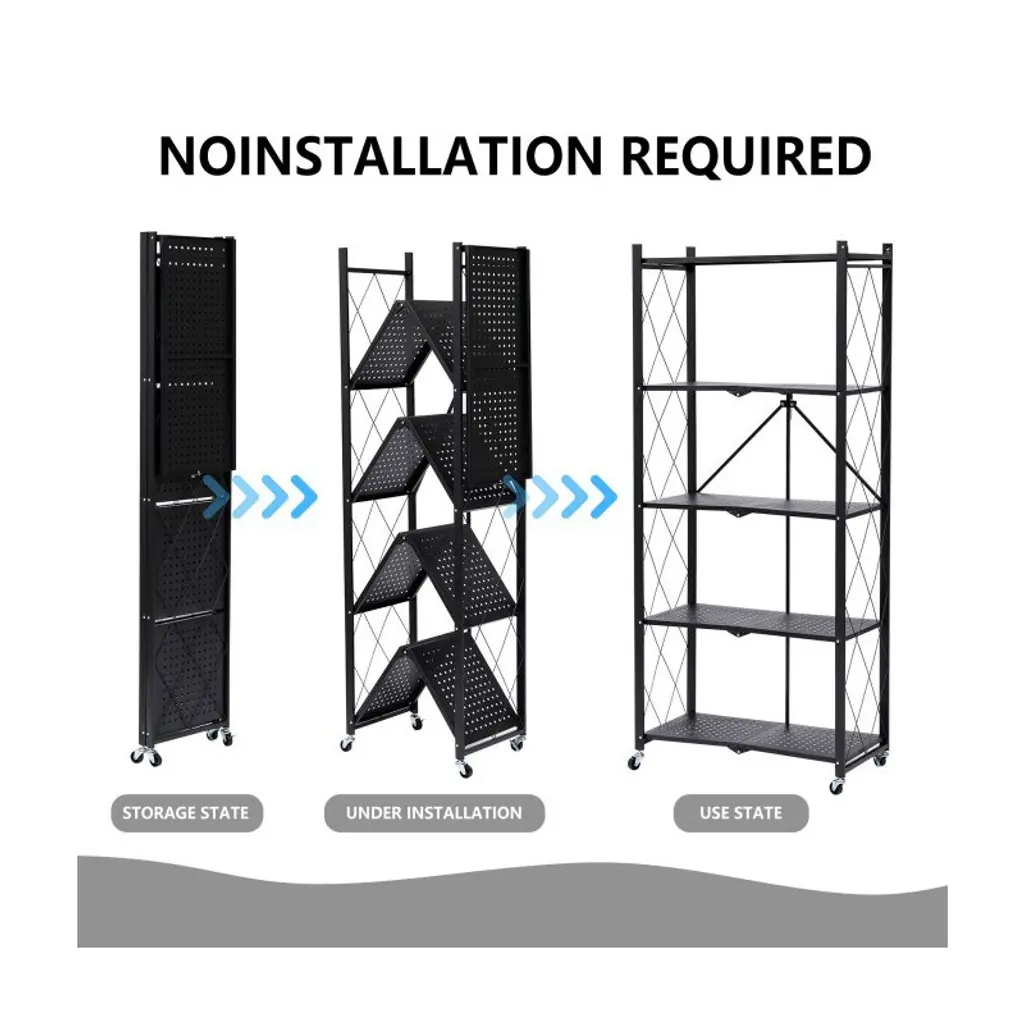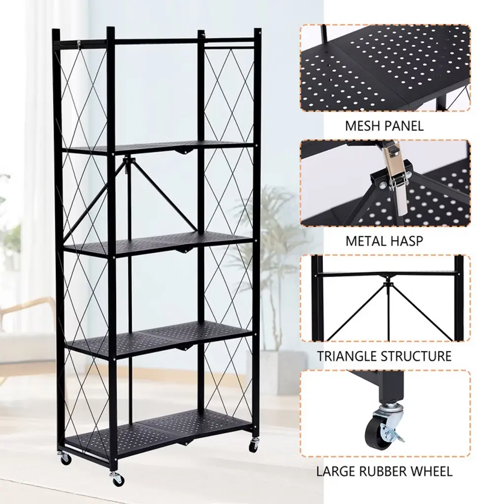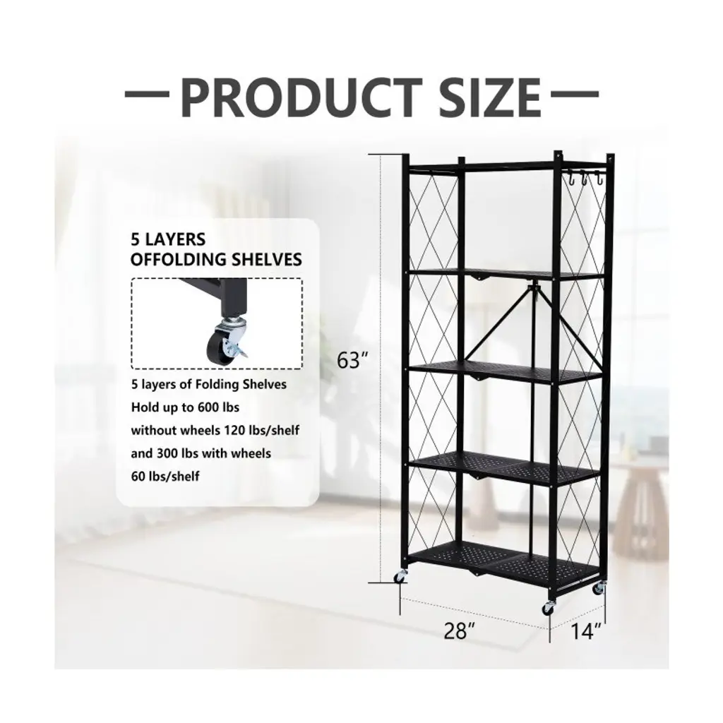 This metal shelf can meet a variety of multi-purpose storage needs in homes, garages, businesses, warehouses, schools, storage rooms and offices. It is a great addition to your home, making your life easier and more comfortable. Features No installation, folds in 5 seconds and easily holds up to 750 lbs without casters. Four universal wheels for easy mobility and two wheels with brakes mount diagonally for stability and non-slip. Heavy-duty metal and special exterior coating resists rust, corrosion and slipping. Mesh shelves on both sides to prevent items from falling Specification: Type: 5-Tier Metal Storage Shelving Rack Color: Black Material: Carbon Steel Whole Size (Unfolded): 28*14*63inch Weight Capacity: 750 pounds without wheels,300 with wheels Style: Modern Fit for: Entryway, bedroom, living room, etc