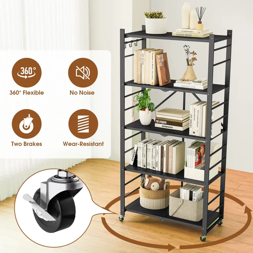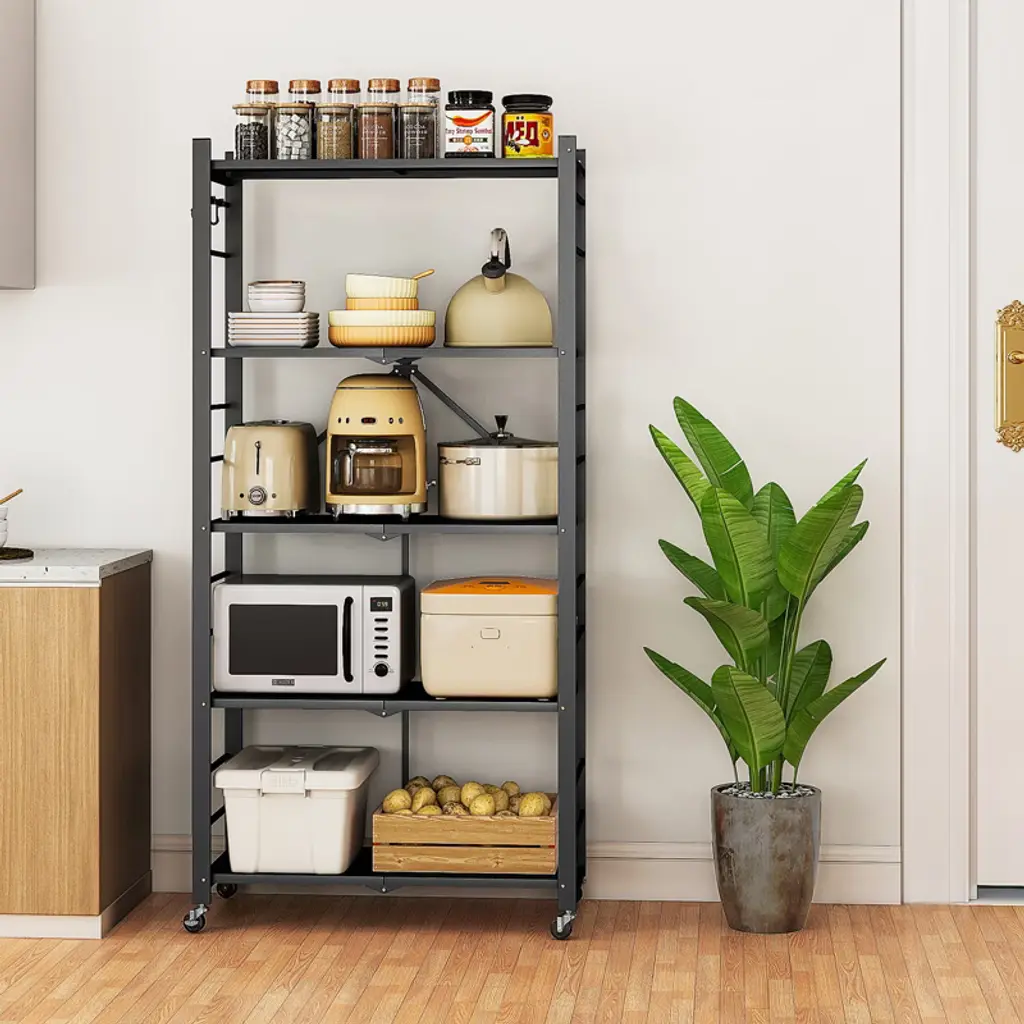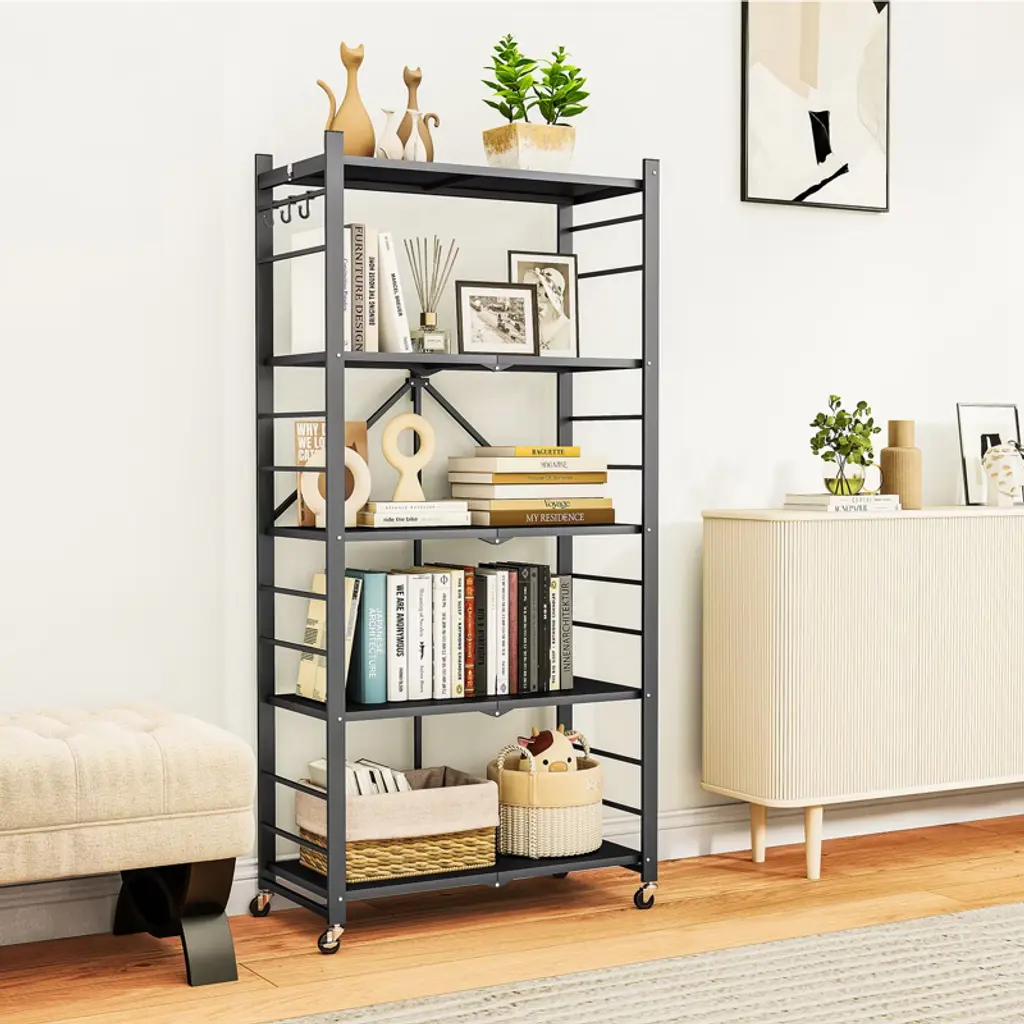 Enhance your storage with this black 5-tier foldable shelving unit featuring three extra side hooks for added organization. Made from rust-resistant powder-coated steel, it unfolds in just 5 seconds without tools and folds flat to only 3.5 inches wide for space-saving storage. Each shelf supports up to 150 lbs without wheels or 60 lbs with wheels, making it perfect for heavy-duty use. The 360° swivel casters with two locking brakes ensure smooth mobility and secure placement. Its sleek black finish fits seamlessly into kitchens, garages, offices, or any space needing instant storage. Features Powder-coated steel frame in black finish 5-tier design for vertical storage efficiency Ventilated shelves to promote airflow Triangular supports and cross braces for stability 3 side hooks for additional hanging storage Foldable design for compact, tool-free setup 360° swivel casters with two locking brakes Specifications Material: Powder-coated steel (black finish) Open Size: 27.8" L x 13.8" W x 63" H Folded Size: approx. 3.5" W x 13.8" D x 63" H Tiers: 5 Shelf Spacing: approx. 13.8" Weight Capacity without wheels: 750 lbs total / 150 lbs per shelf Weight Capacity with wheels: 300 lbs total / 60 lbs per shelf Wheels: 360° swivel, 2 lockable Hooks: 3 extra side hooks included Color: Black