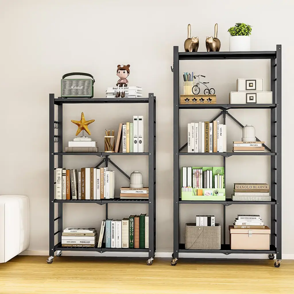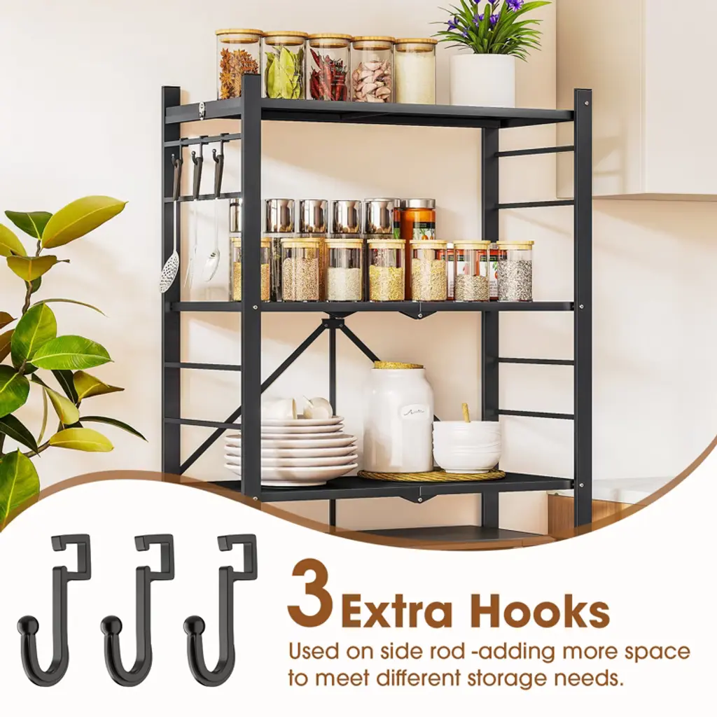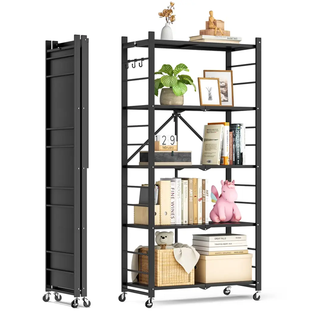 Enhance your storage with this black 5-tier foldable shelving unit featuring three extra side hooks for added organization. Made from rust-resistant powder-coated steel, it unfolds in just 5 seconds without tools and folds flat to only 3.5 inches wide for space-saving storage. Each shelf supports up to 150 lbs without wheels or 60 lbs with wheels, making it perfect for heavy-duty use. The 360° swivel casters with two locking brakes ensure smooth mobility and secure placement. Its sleek black finish fits seamlessly into kitchens, garages, offices, or any space needing instant storage. Features Powder-coated steel frame in black finish 5-tier design for vertical storage efficiency Ventilated shelves to promote airflow Triangular supports and cross braces for stability 3 side hooks for additional hanging storage Foldable design for compact, tool-free setup 360° swivel casters with two locking brakes Specifications Material: Powder-coated steel (black finish) Open Size: 27.8" L x 13.8" W x 63" H Folded Size: approx. 3.5" W x 13.8" D x 63" H Tiers: 5 Shelf Spacing: approx. 13.8" Weight Capacity without wheels: 750 lbs total / 150 lbs per shelf Weight Capacity with wheels: 300 lbs total / 60 lbs per shelf Wheels: 360° swivel, 2 lockable Hooks: 3 extra side hooks included Color: Black